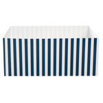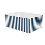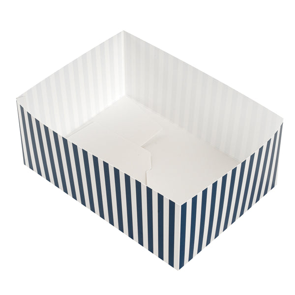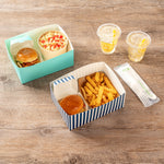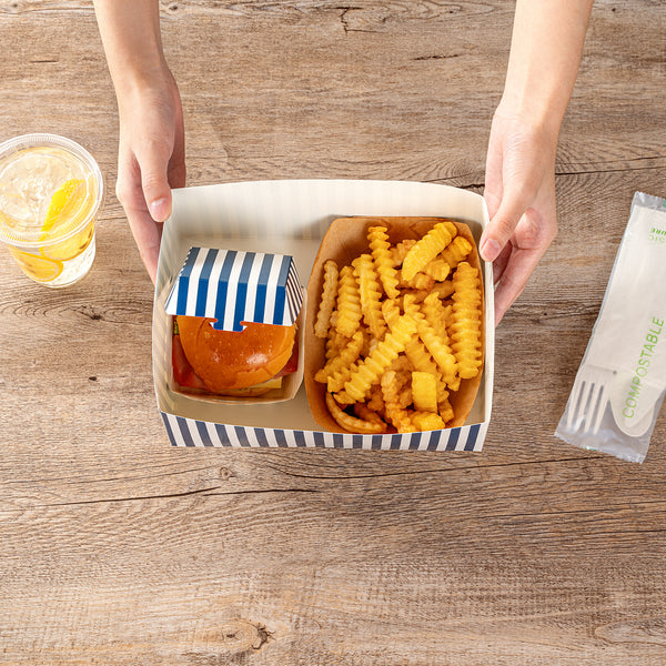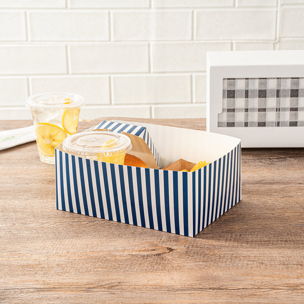 Serve your takeaway sandwiches with our Bio Tek Rectangle Blue and White Stripe Paper Sandwich / Burger Open Trays. These baked goods containers are designed with a single opening that allows easy eating directly from the tray while on the go. The blue and white stripe design of these burger trays brings style, making mealtime more enjoyable. These paper open trays have grease-resistant PE lining to preserve their high-quality appearance by preventing any oil seepage which otherwise could create an unattractive look. Constructed from superior paper, these movie snack trays offer a firm base and can hold a hefty amount of food while preventing unfortunate spills. Biodegradable and commercially compostable, these rectangle trays support eco-friendly disposal. Each paper food tray is shipped flat for compact storage and can be easily assembled for an efficient food serving at foodservice establishment. These sandwich trays measure 8.5 inches in length by 6 inches in width by 3.5 inches in depth. Sold in a 100 count box. These items will only degrade outside of the traditional solid waste stream.
