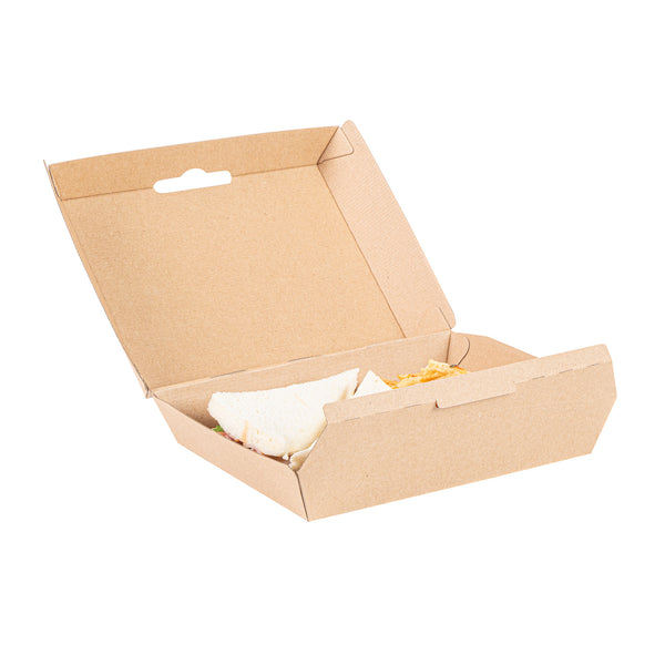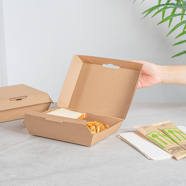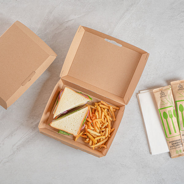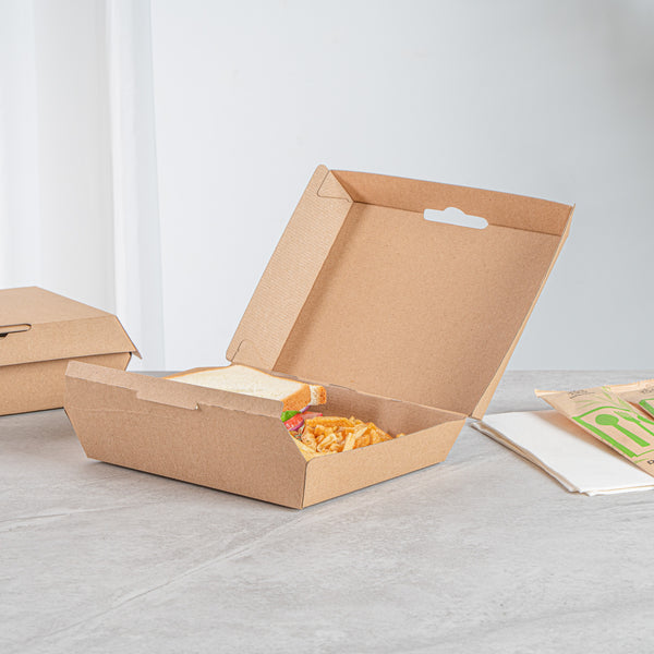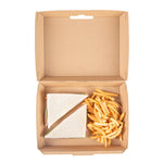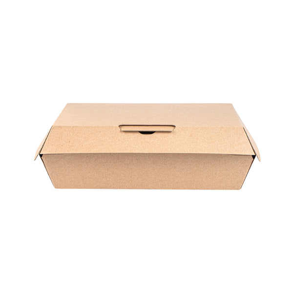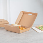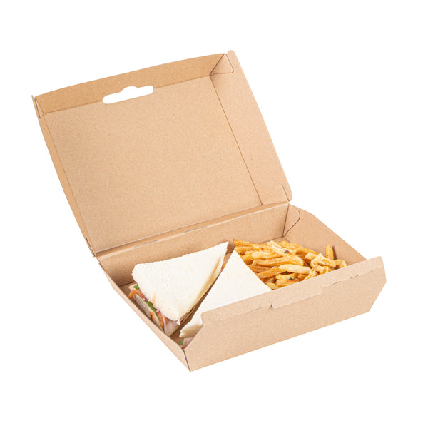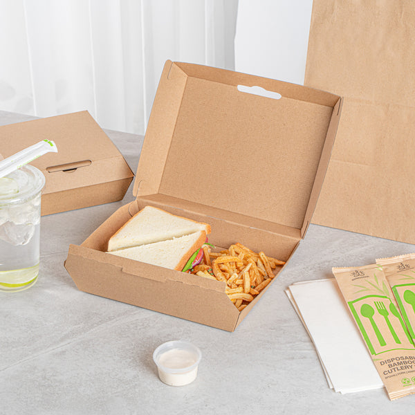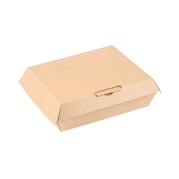 Ensure secure and eco-friendly food delivery with our kraft takeout box. The Bio Tek Kraft Takeout Box features a grease-resistant interior and E-Flute technology that maintains heat while keeping fries crisp, enhancing the quality of your to-go meals. With its biodegradable clamshell container design, this box appeals to environmentally conscious customers and offers a sustainable packaging solution. Its convenient clamshell design includes side vents, which help maintain the freshness of your dishes by allowing steam to escape. Measuring 7.9 inches in length, 5.9 inches in width, and 2.8 inches in height, this kraft paper container is ideal for packing burgers, sandwiches, and more. Each order includes 100 Bio Tek Kraft Takeout Boxes.
