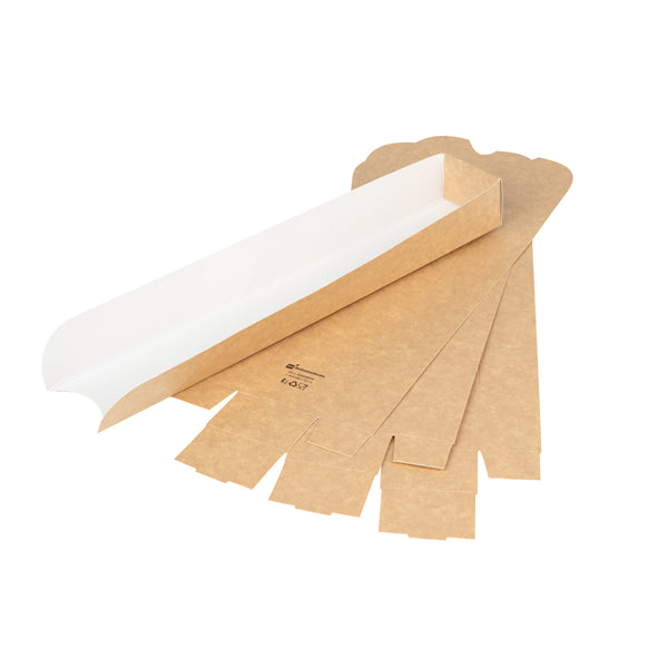 Serve hot dogs with style using our Bio Tek Rectangle Kraft Paper Hot Dog / Sandwich Trays. Designed with three walls, these hot dog containers allow customers to conveniently bite and hold hot dogs without soiling their hands. These sandwich to go containers are greaseproof to prevent oily blotches and keep their stylish, high-quality look. Made from premium kraft paper, these paper hot dog boxes are recyclable for green and easy cleanup after customers enjoy their meals. These food containers are shipped flat and are easy to assemble to streamline the serving process at your hot dog stand or restaurant. Great for serving large hot dogs, these paper sandwich containers measure 11.75 inches long by 2 inches wide by 1.25 inches tall. Sold in a 200 count box.