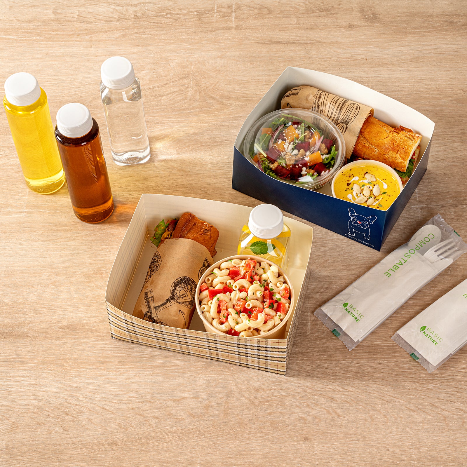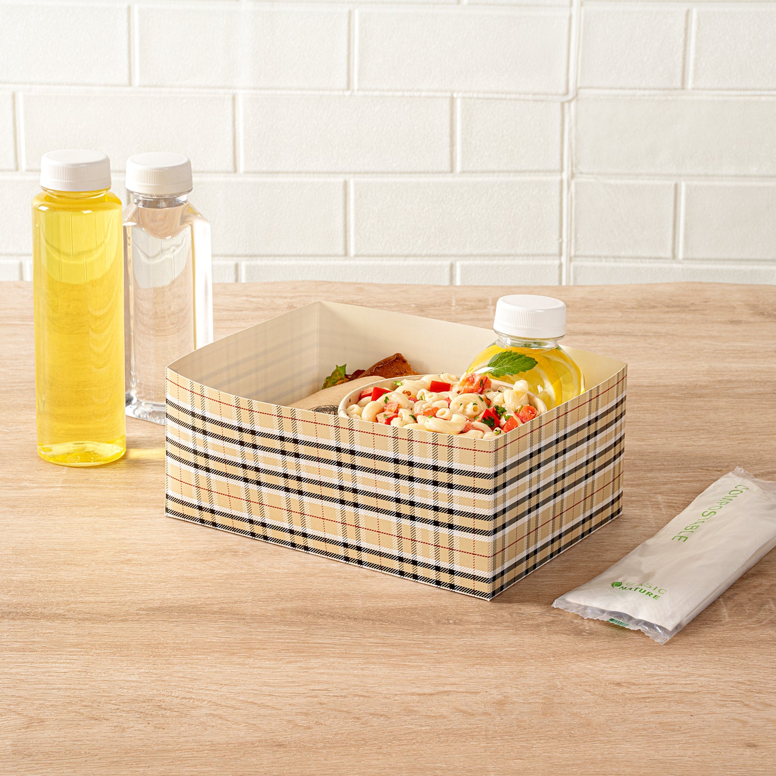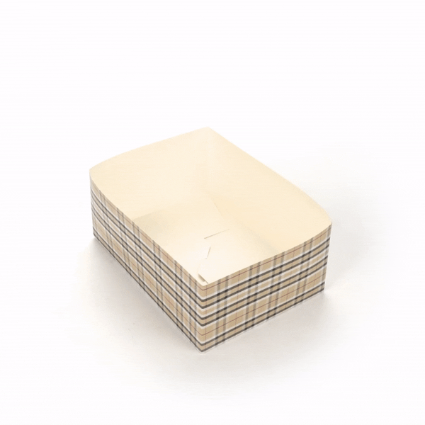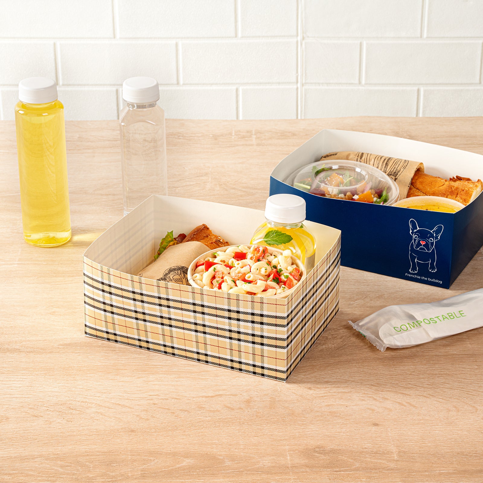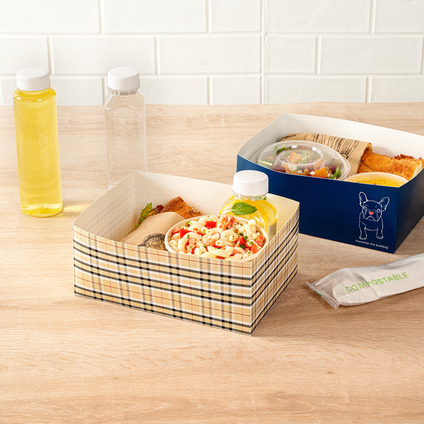 Present your meals in our Bio Tek Rectangle Plaid Paper Sandwich / Burger Open Trays. These burger trays feature an open-top design that is ideal for comfortably enjoying sandwiches on the go. The plaid exterior of these movie snack trays creates a visually appealing look to every serving, enhancing the eating experience. These paper food trays are equipped with grease-resistant PE lining to ensure they maintain their premium appearance by preventing oil or grease from seeping through and making a mess. Constructed from premium paper, these baked goods containers have a sturdy base and can hold hefty amounts of food without any mishaps. These paper open trays are biodegradable and commercially compostable and facilitate in sustainable disposal after meals. Each plaid sandwich tray is shipped flat to optimize storage space in the pantry. These rectangle trays are easy to assemble to efficiently serve meals to customers at cafes, restaurants, or other foodservice establishments. Measuring 8.5 inches in length by 6 inches in width by 3.5 inches in height, these paper burger trays are perfect for a variety of food. Sold in a 100 count box. These items will only degrade outside of the traditional solid waste stream.