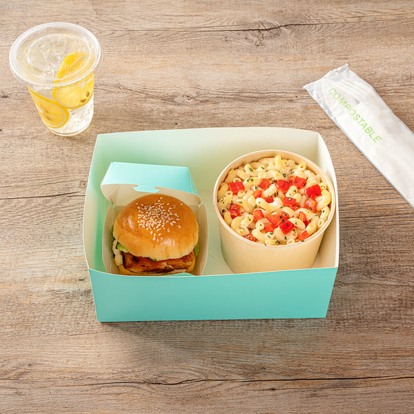 Ensure your takeaway burgers are perfectly contained using our Bio Tek Rectangle Turquoise Paper Sandwich/Burger Open Trays. Featuring a convenient open structure, these turquoise food trays are perfect for comfortably enjoying sandwiches and burgers on the go. Designed with an attractive turquoise exterior, these open trays enhance the aesthetic of your dishes, providing an element of fun to your food service. These burger trays feature PE lining and protect against unsightly oil stains, maintaining their high-quality appearance thanks to their grease-resistant properties. Delivered flat for convenience, these recyclable sandwich trays ensure compact storage in your cafe, food truck, or diner. These unique burger and sandwich trays measure 8.5 inches in length, 6 inches in width, and 3.5 inches in depth. Sold in a 100 count box.