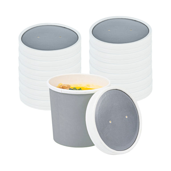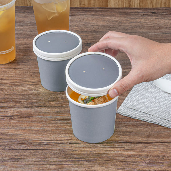 These tightly fastened paper lids perfectly seal in hot foods to avoid leaks and spills, reducing the risk of accidental messes and burns. Plus, they have raised rims so they can be stacked on top of each other.
