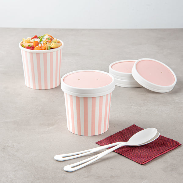 These disposable soup cup lids are available in various colors and prints to match the aesthetics and brand image of your foodservice establishment. Get your take out orders looking fun and fashionable!