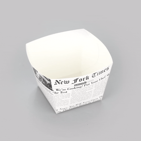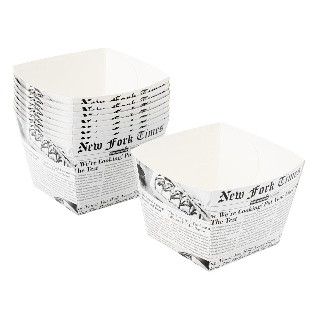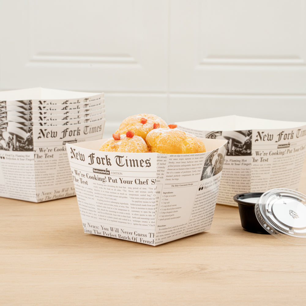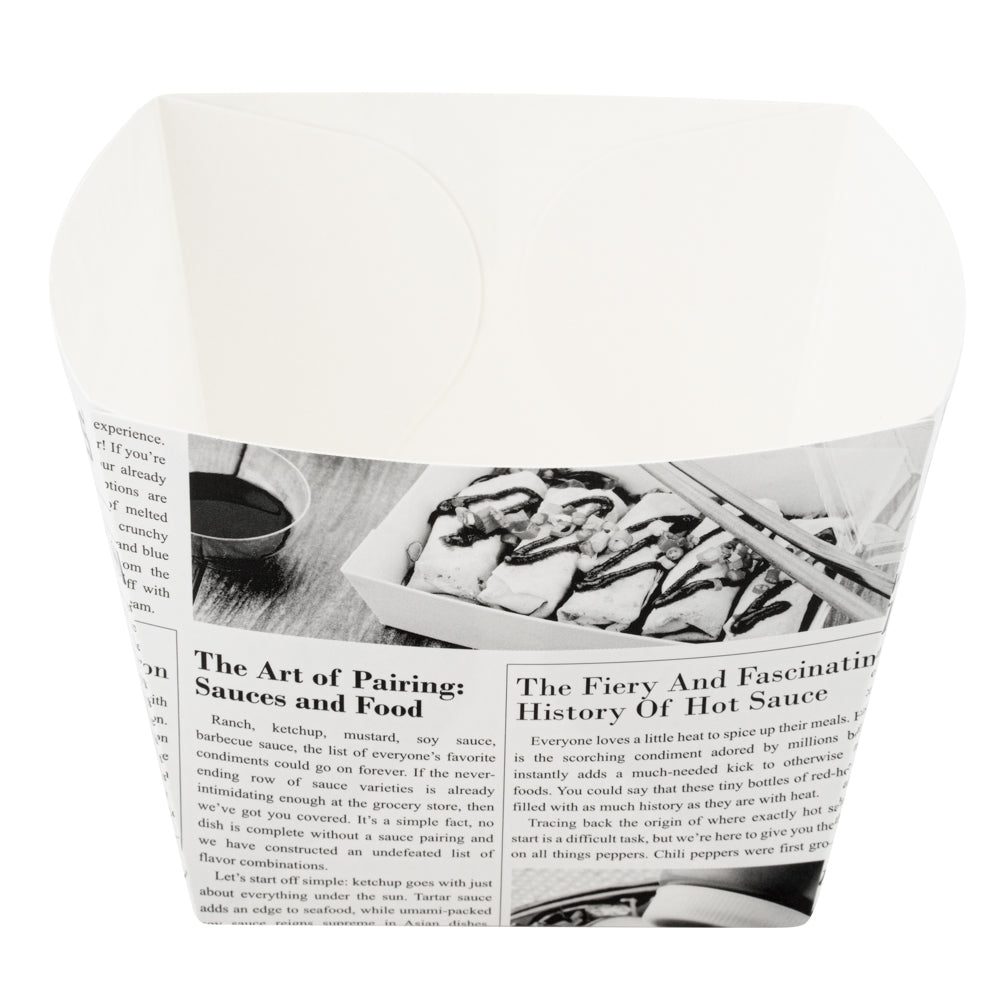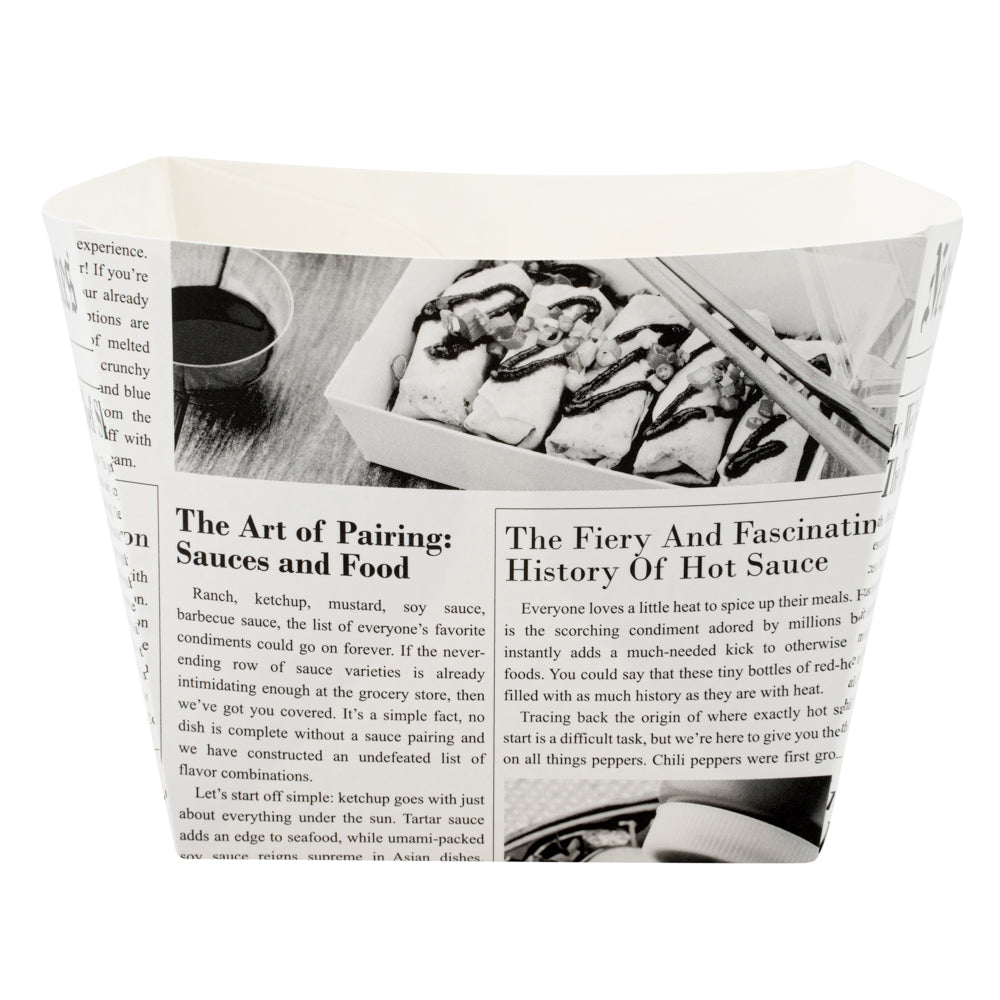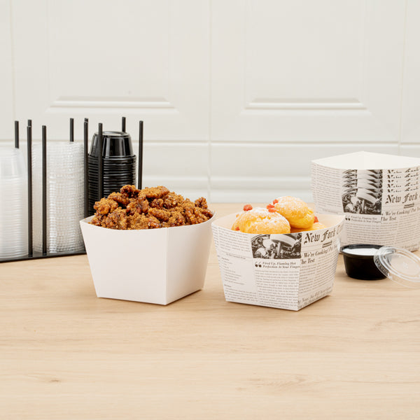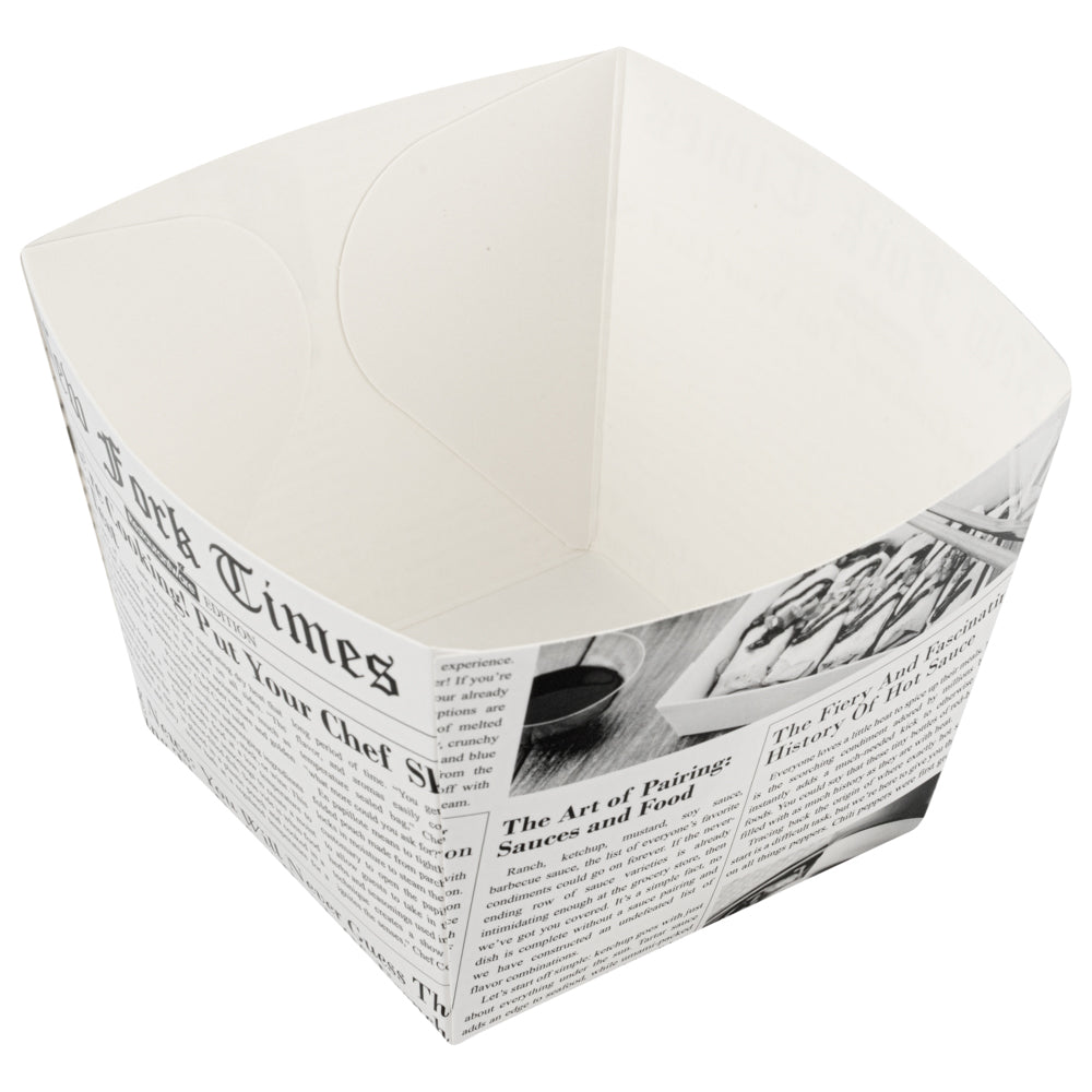 Stylishly serve french fries, mozzarella sticks, or other snacks with our Bio Tek Square Newsprint Paper Snack Boxes. These snack boxes are constructed with a PE coating to avoid spills or leaks, allowing customers to enjoy their snacks without messes. The open top design of these paper snack boxes lets guests enjoy their food on the go, making these perfect for use at your food truck or food stand. These paper boxes for snacks are made from sturdy paper so they won't bend or fold under heavy foods. These snack baskets are conveniently recyclable for a swift and easy cleanup process. With a newspaper print design, these square snack boxes add a fun element to your serving supplies. Each finger food box measures 4.25 inches in length by 4.25 inches in width by 3.25 inches in height. Sold in a 200 count box.