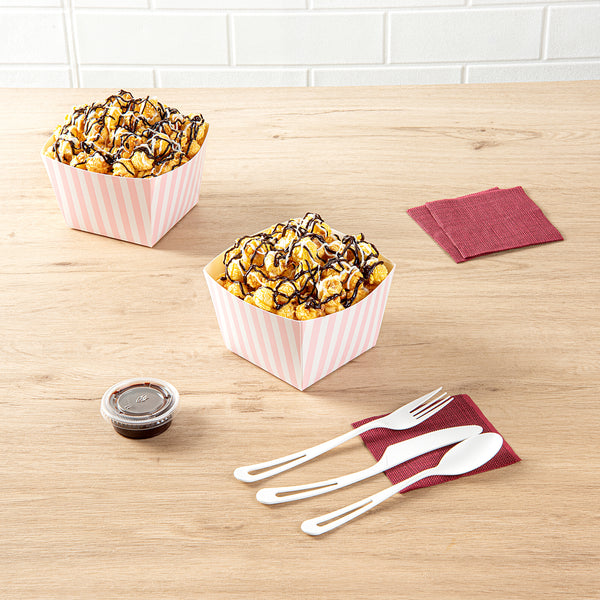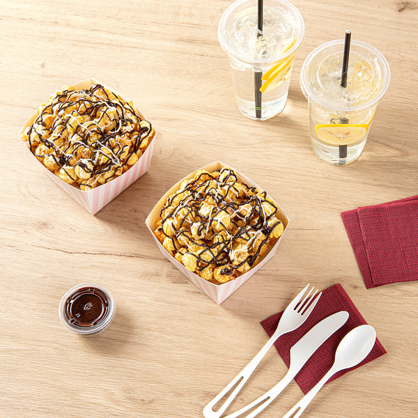 These paper snack boxes are equipped with a grease-impermeable PE lining to minimize the risk of messiness or unsightly blotches. Enjoy an elevated snacking experience!