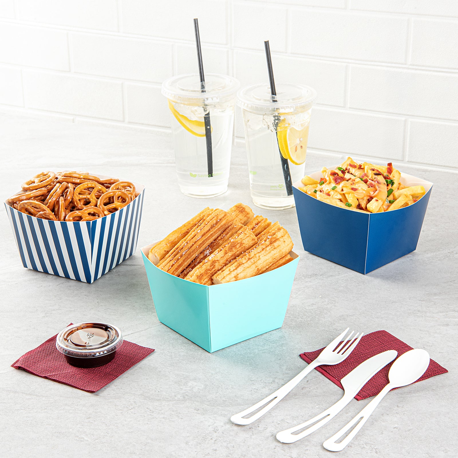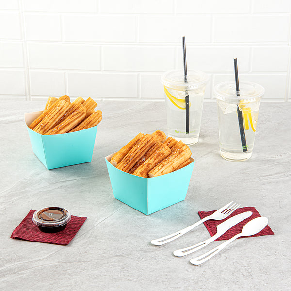 Designed for hot or cold food, these paper food boxes can hold pretzels, popcorn, or chicken wings. Serve guests with any type of snack.