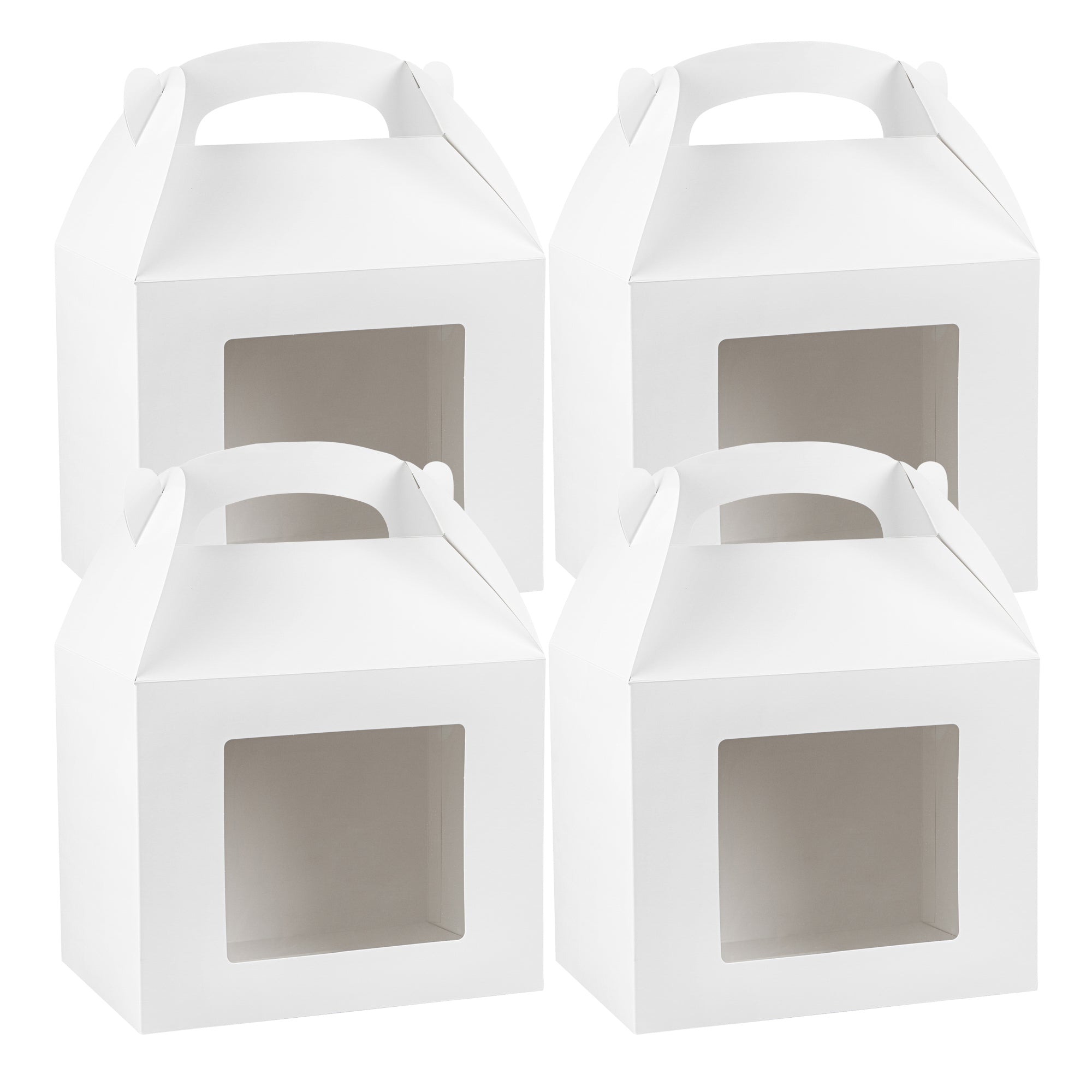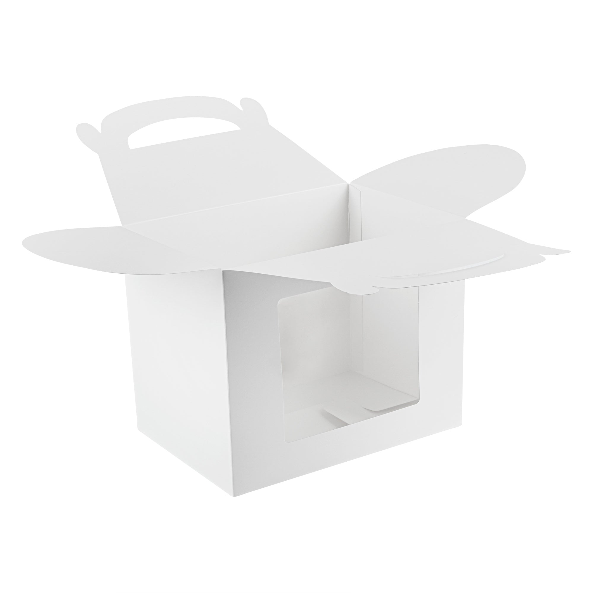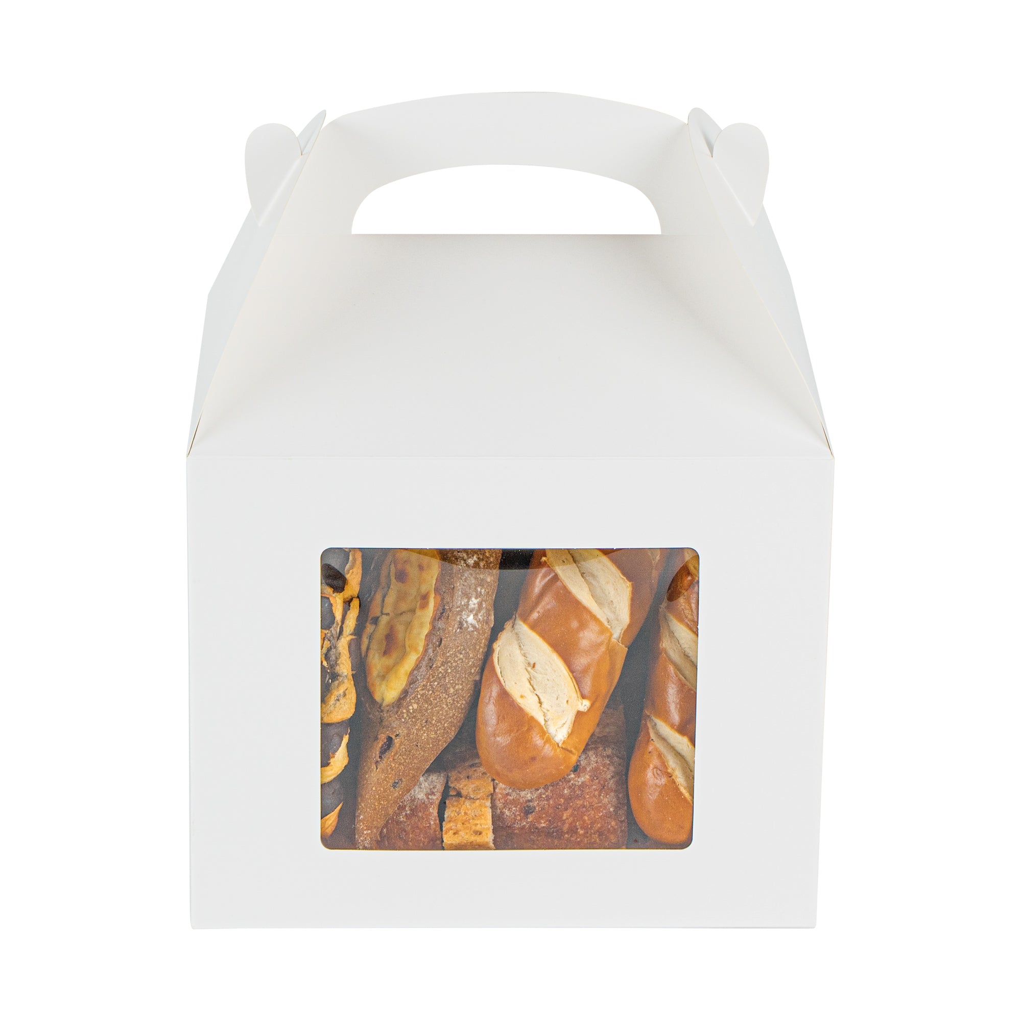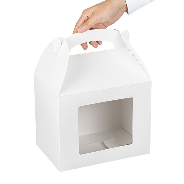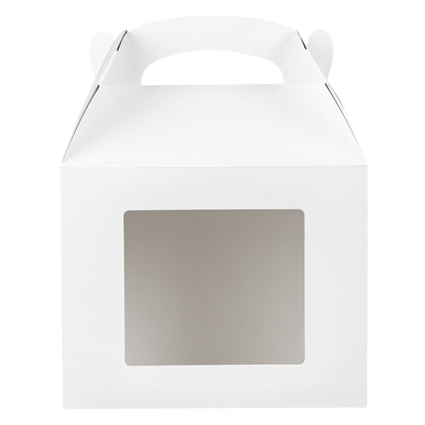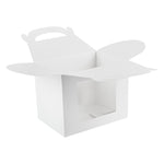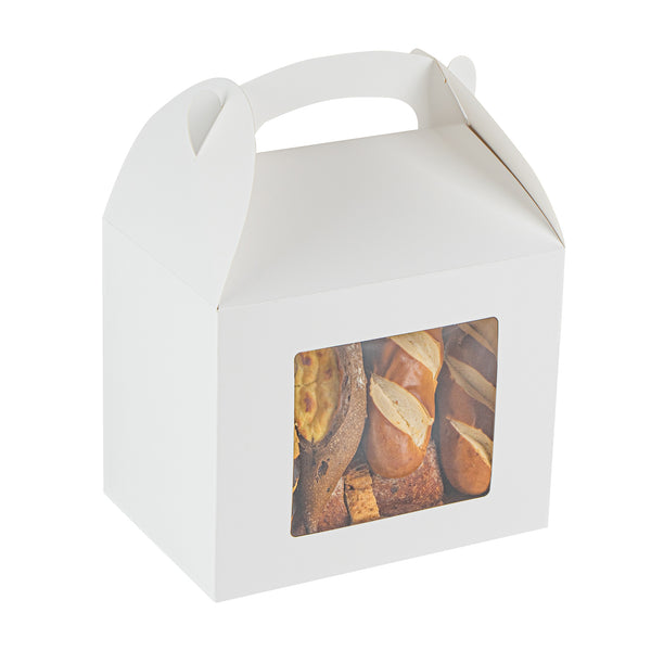 Package your treats with a clean, polished look. Bio Tek White Paper Gable Boxes / Take Out Containers feature a greaseproof lining that resists oil absorption, maintaining a neat and professional appearance with every use. Designed with a transparent plastic window, they beautifully showcase baked goods, desserts, or favors while helping customers make quick selections. At 10 inches long, 7 inches wide, and 8 inches tall, these boxes provide ample space for a variety of items, making them ideal for cafes, bakeries, and catering services. Their sturdy built-in handle ensures easy carrying, streamlining both customer pickup and staff handling. Constructed from recyclable paper, they combine function with sustainability for eco-conscious businesses. Sold in a 100 count box.