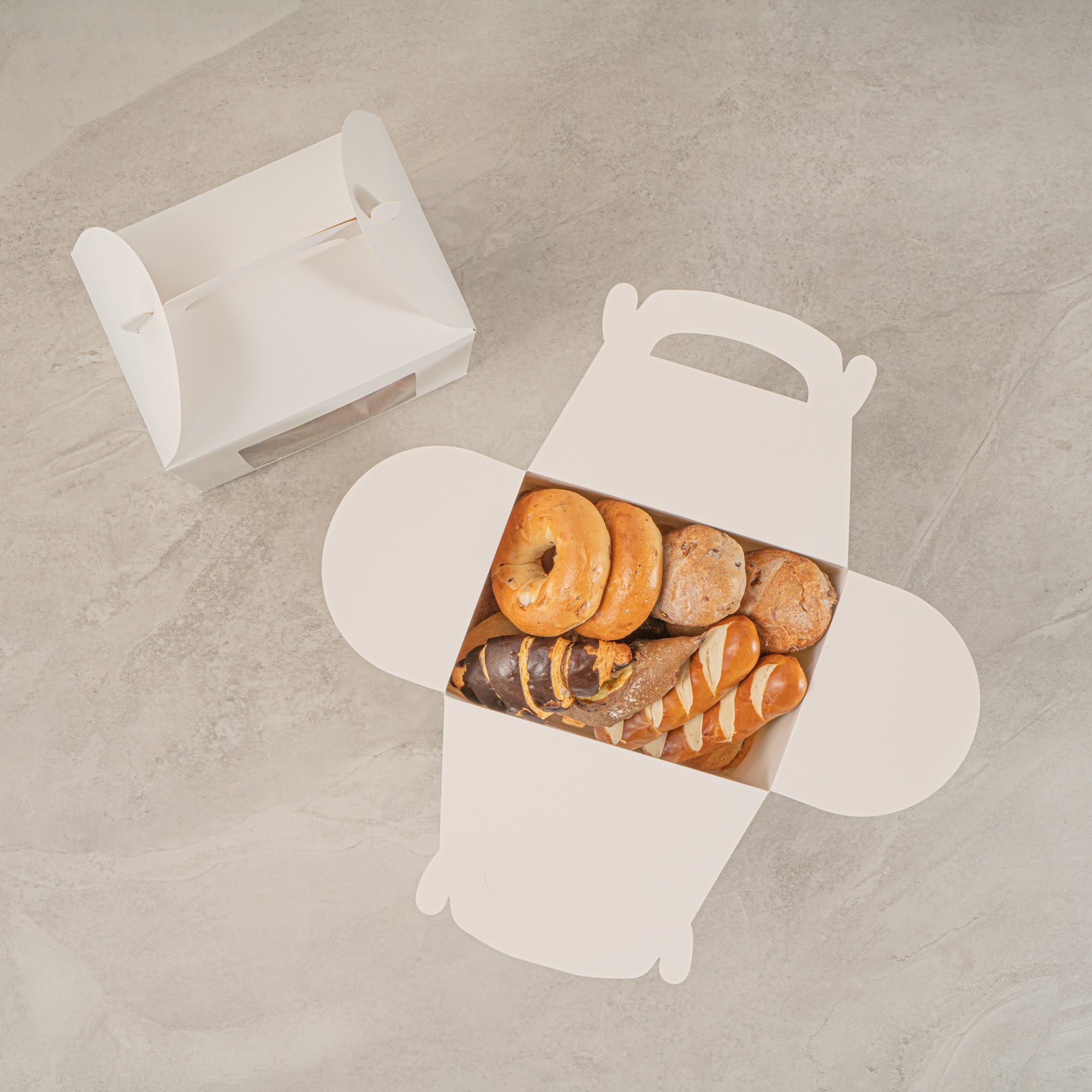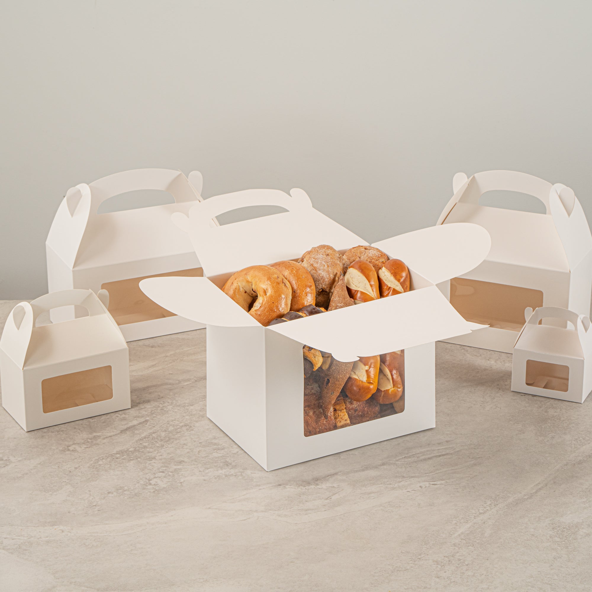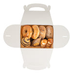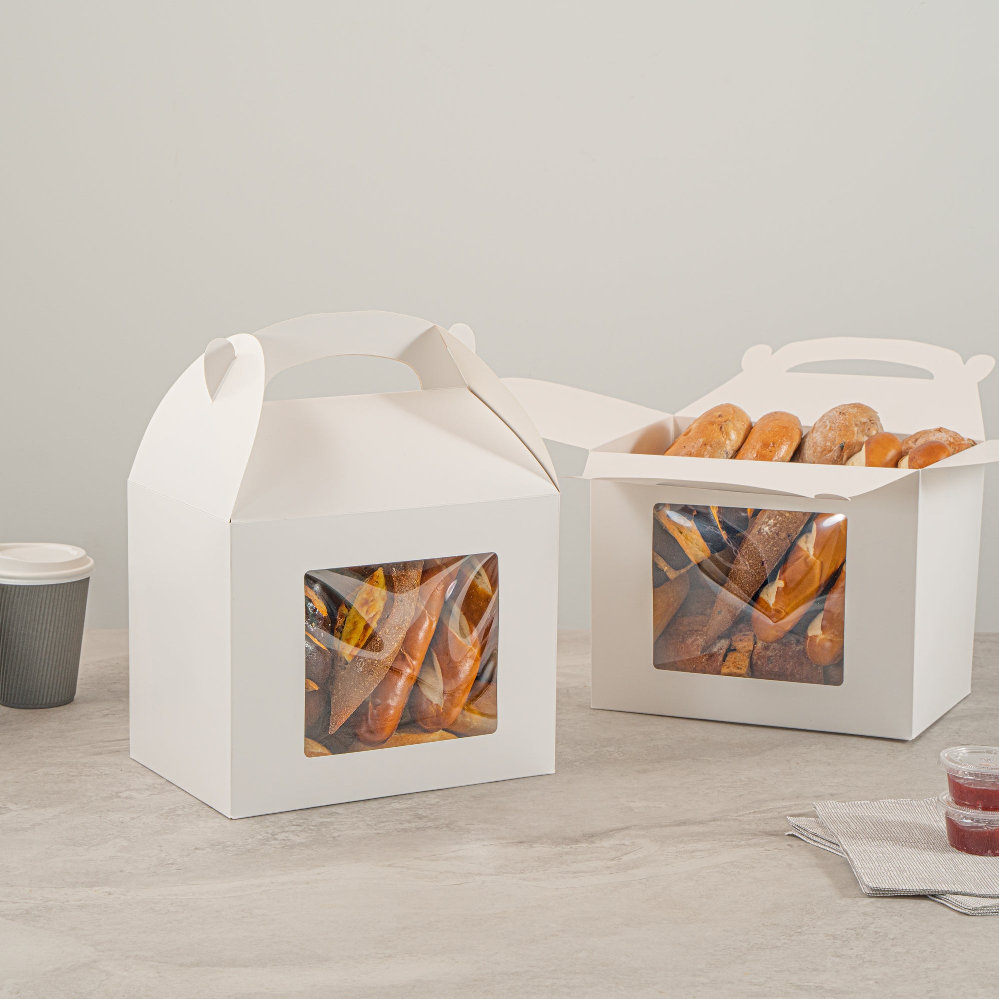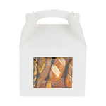 Package your treats with a clean, polished look. Bio Tek White Paper Gable Boxes / Take Out Containers feature a greaseproof lining that resists oil absorption, maintaining a neat and professional appearance with every use. Designed with a transparent plastic window, they beautifully showcase baked goods, desserts, or favors while helping customers make quick selections. At 10 inches long, 7 inches wide, and 8 inches tall, these boxes provide ample space for a variety of items, making them ideal for cafes, bakeries, and catering services. Their sturdy built-in handle ensures easy carrying, streamlining both customer pickup and staff handling. Constructed from recyclable paper, they combine function with sustainability for eco-conscious businesses. Sold in a 100 count box.