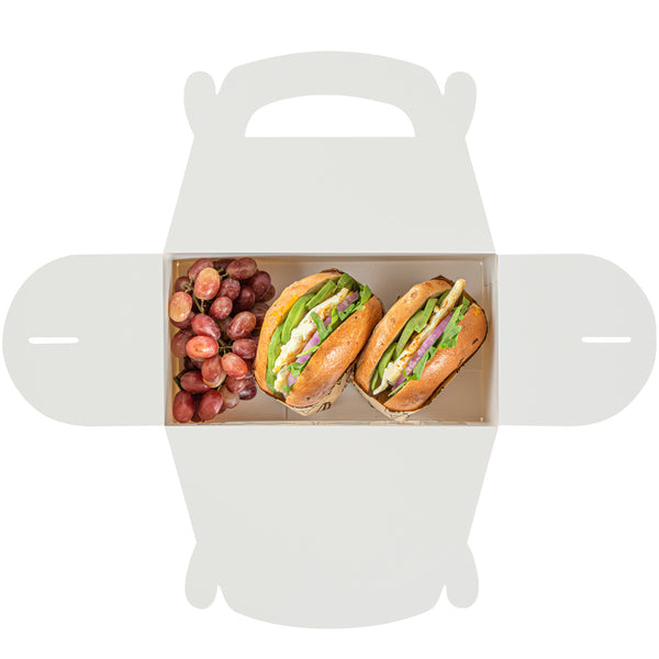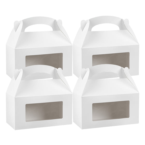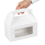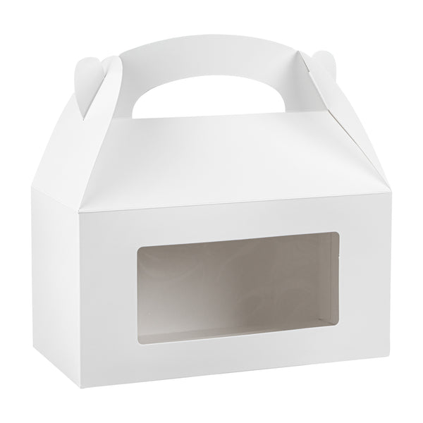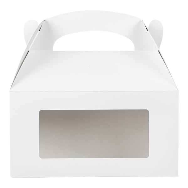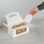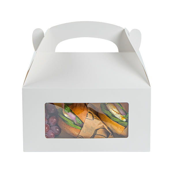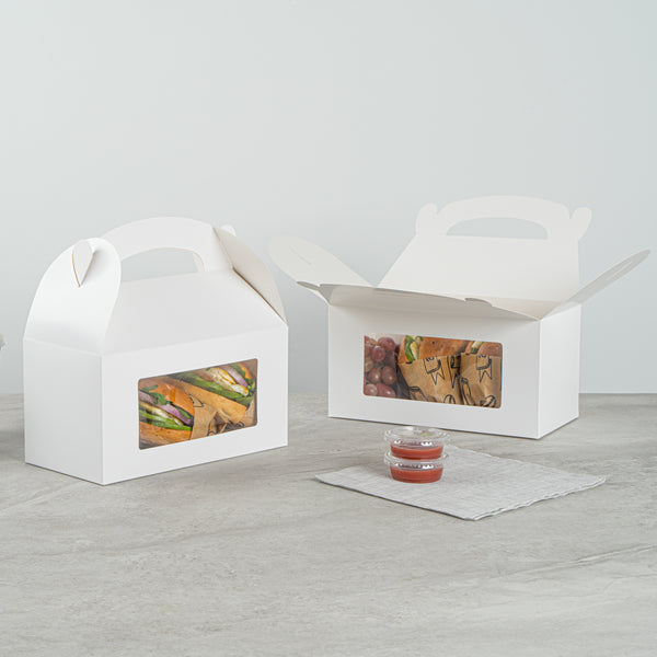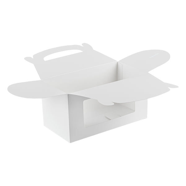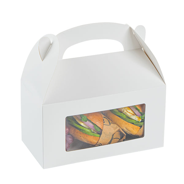 Transport food orders securely with greaseproof protection. Bio Tek White Paper Gable Boxes / Take Out Containers are designed with a greaseproof lining that prevents oils from seeping through, making them perfect for handling fried foods without leaks. These cardboard gift boxes feature an integrated plastic window that provides an enticing preview of sandwiches and snacks, enhancing the presentation and appeal of your offerings. With a built-in handle, these wedding favor boxes make carrying large orders comfortable and convenient, ideal for catering events. Each box measures 9.5 inches in length by 5 inches in width and height, crafted from recyclable paper, ensuring environmentally friendly disposal. Upgrade your food packaging with these cold food friendly, freezer-safe, and hot food friendly boxes that effortlessly combine practicality and style. Sold in a 100 count box.