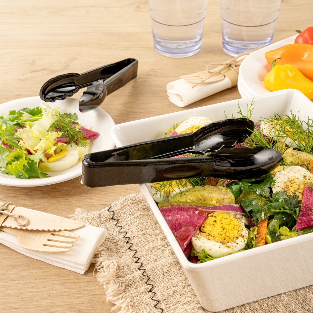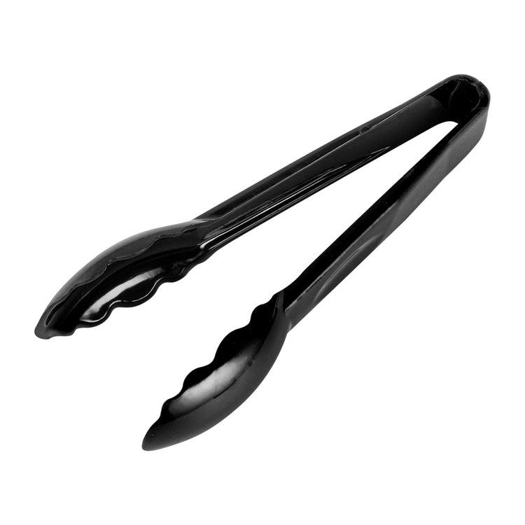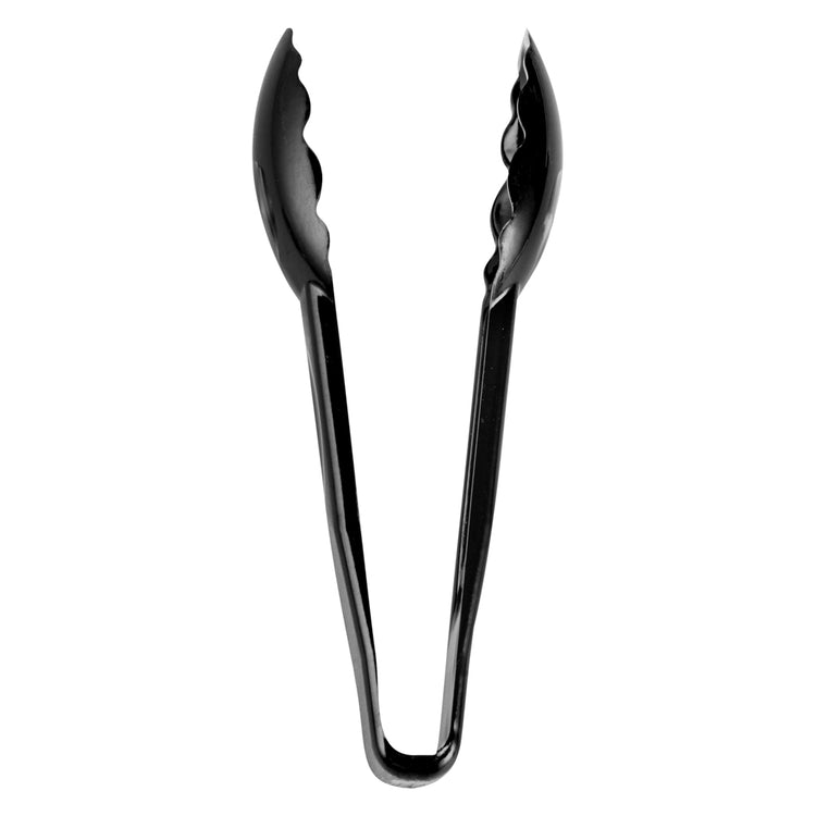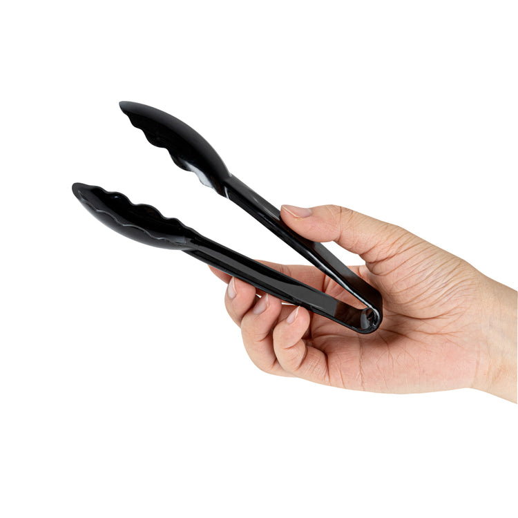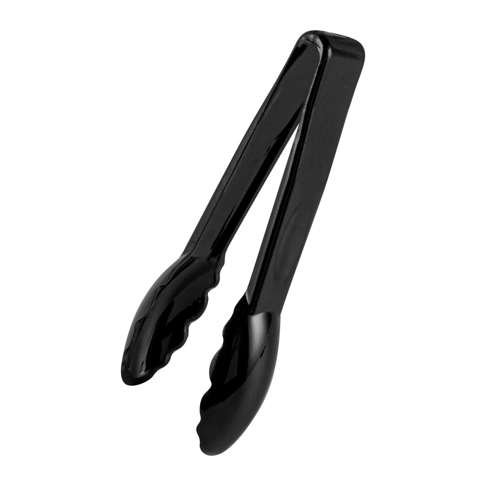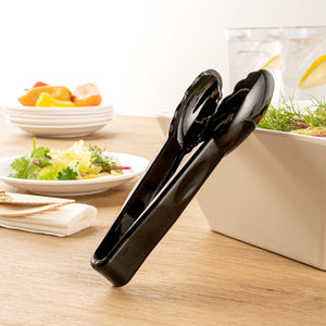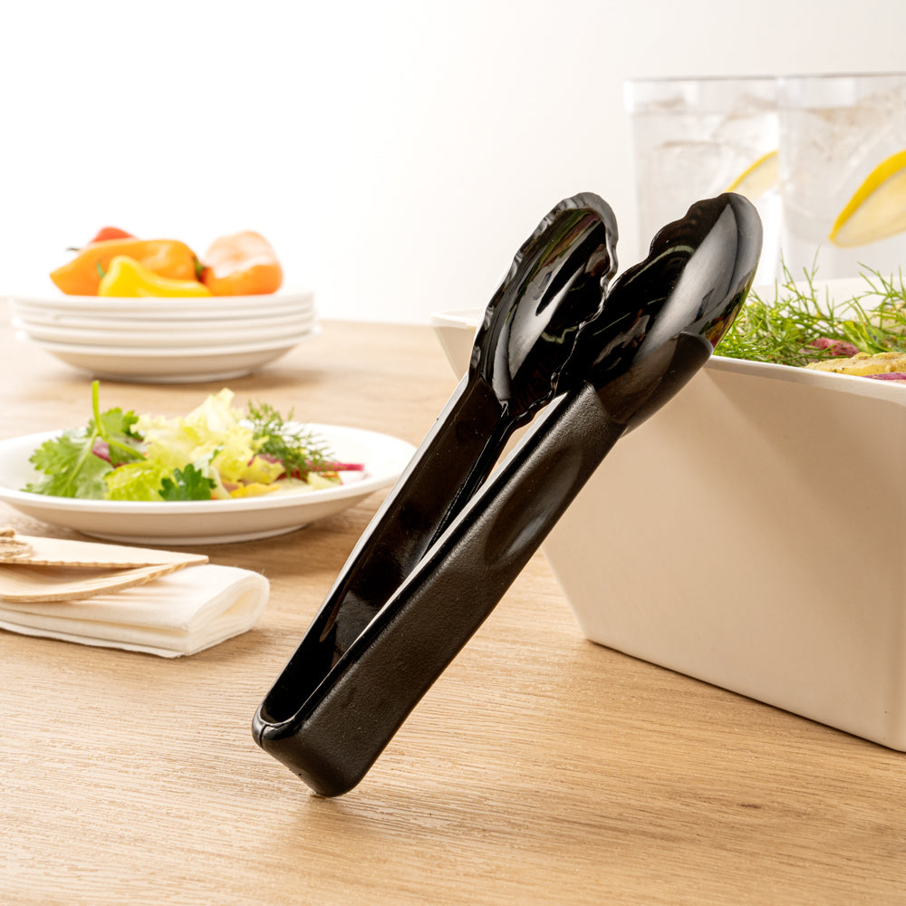 Instantly enhance your buffets or catering events with these Cater Tek Black Plastic Catering Tongs. Measuring 6 inches in length, these small plastic tongs are a great size for accompanying buffet trays, salad bowls, and serving dishes. Their durable plastic construction is dishwasher-safe, and their polished black finish adds an elegant touch to any setting. Equipped with built-in scalloped edges, these small serving tongs create an extra-firm grip to make serving and transporting foods a breeze. Although intended for reuse, and conveniently dishwasher-safe, you could also use these plastic tongs as disposable tongs at corporate luncheons and other off-site catered events. These 6-inch L x 2-inch W plastic tongs are shipped in a 1 count box.