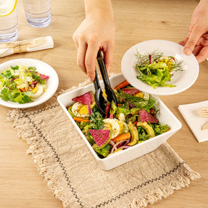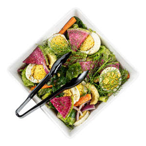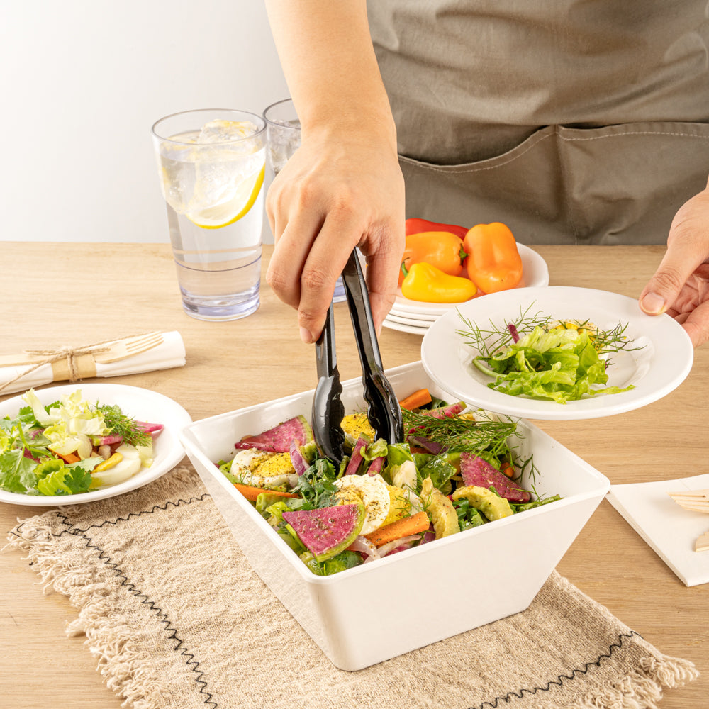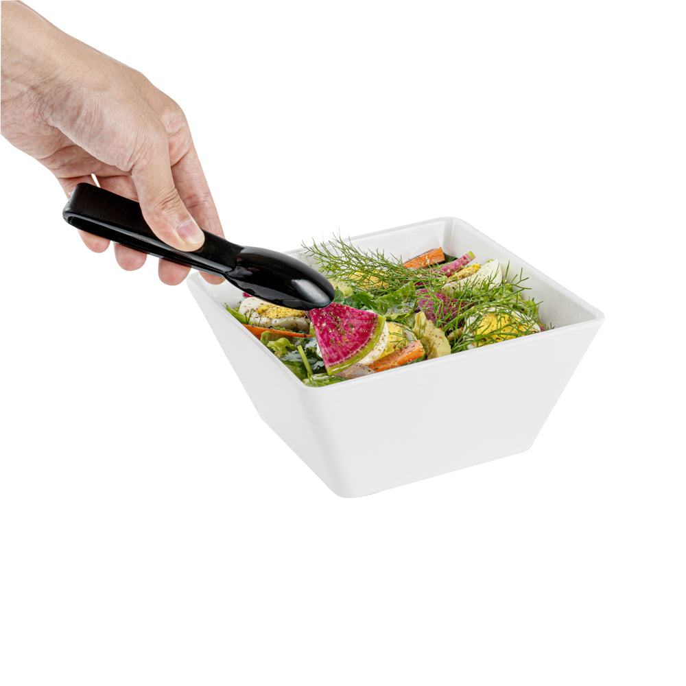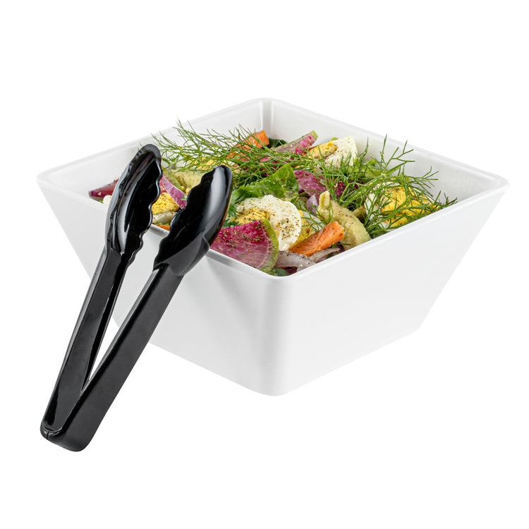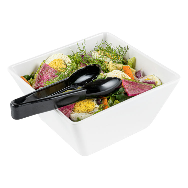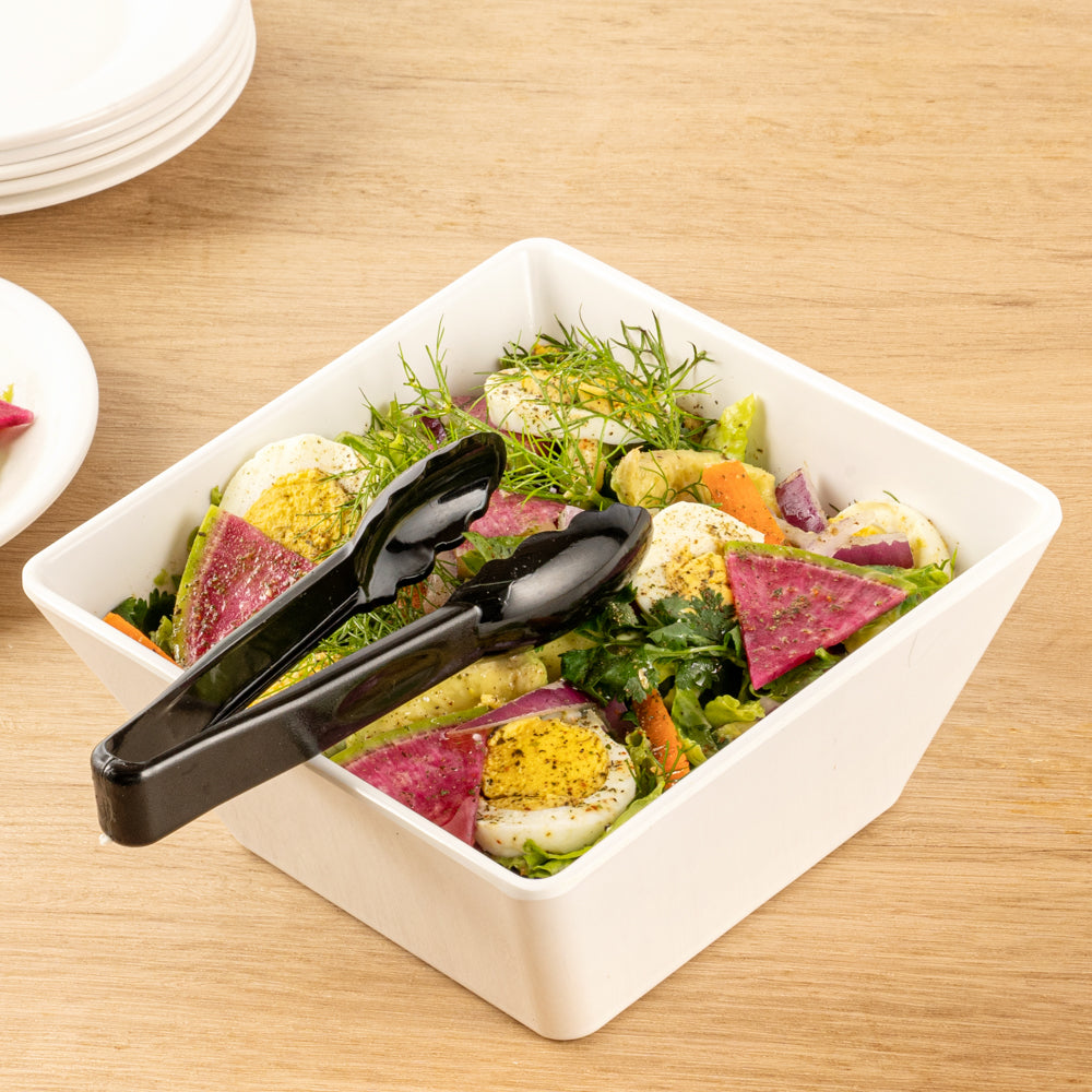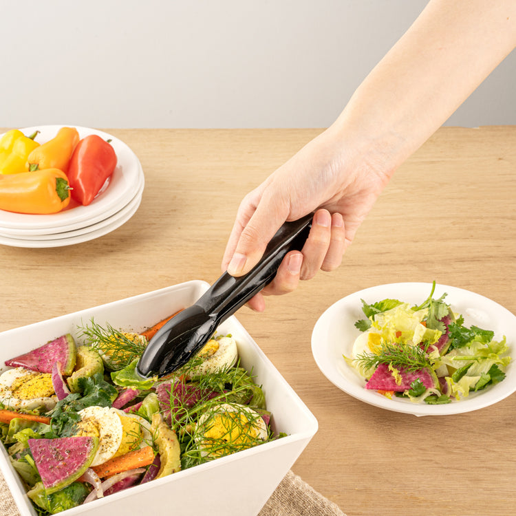 Instantly enhance your buffets or catering events with these Cater Tek Black Plastic Catering Tongs. Measuring 6 inches in length, these small plastic tongs are a great size for accompanying buffet trays, salad bowls, and serving dishes. Their durable plastic construction is dishwasher-safe, and their polished black finish adds an elegant touch to any setting. Equipped with built-in scalloped edges, these small serving tongs create an extra-firm grip to make serving and transporting foods a breeze. Although intended for reuse, and conveniently dishwasher-safe, you could also use these plastic tongs as disposable tongs at corporate luncheons and other off-site catered events. These 6-inch L x 2-inch W plastic tongs are shipped in a 1 count box.