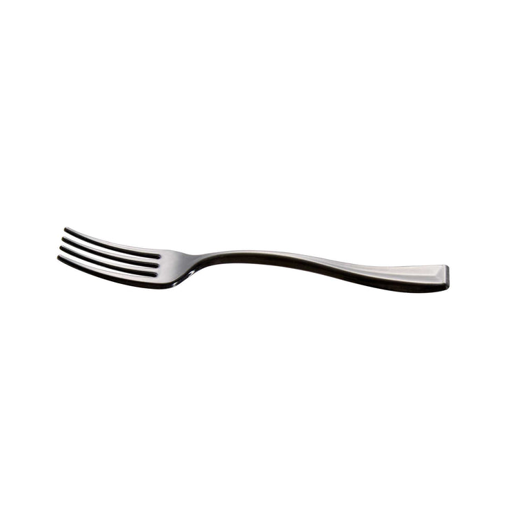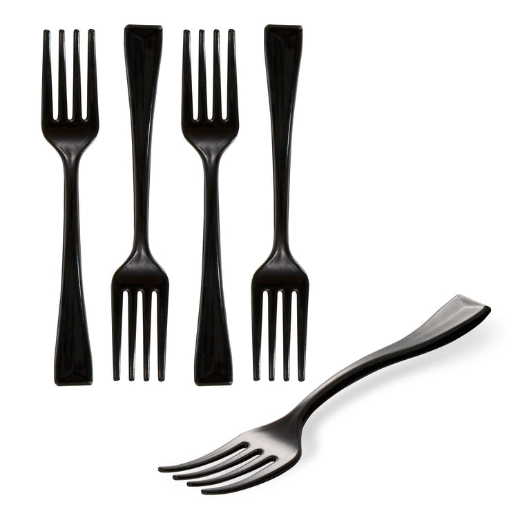Provide an elegant and upscale flatware solution with our Mini Serve Black Plastic Mini Forks. With their miniature construction, these small plastic forks are perfectly suited for serving alongside slices of wedding cake, miniature deconstructed desserts, or tasting courses. Made from high-quality recyclable plastic, these small disposable forks are reliably sturdy and designed to stay strong under pressure. This plastic cutlery is great for serving dry desserts and wet foods like meatballs or salads without getting flimsy. After use, simply discard these disposable forks, avoiding the need for washing and drying. These mini forks measure 4 inches in length. Sold in a 100 count box.