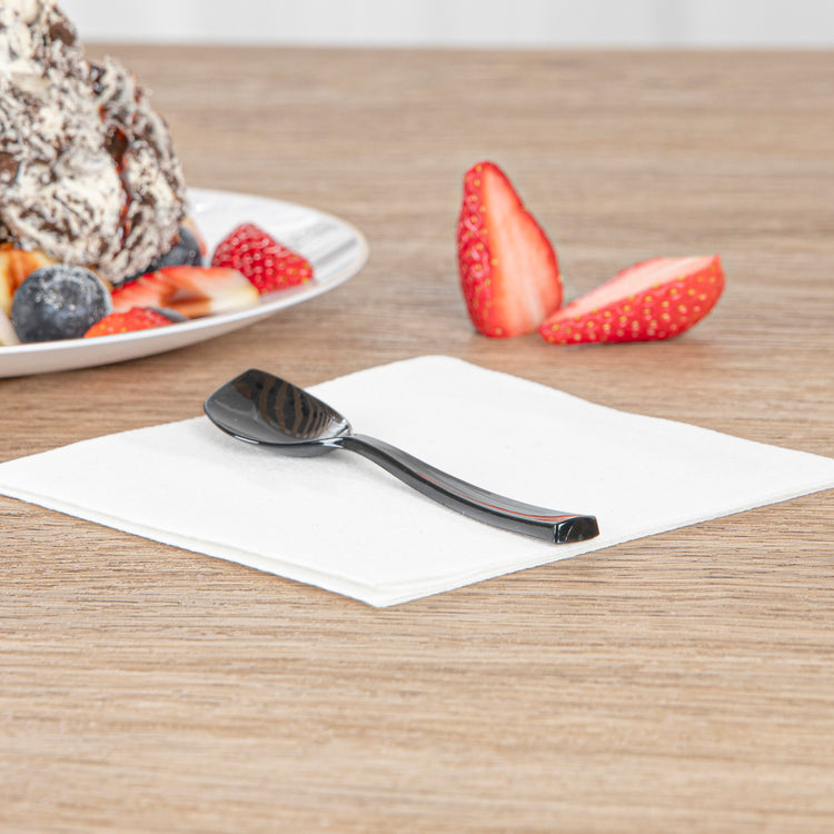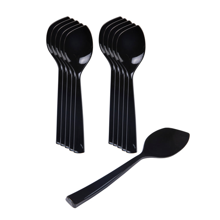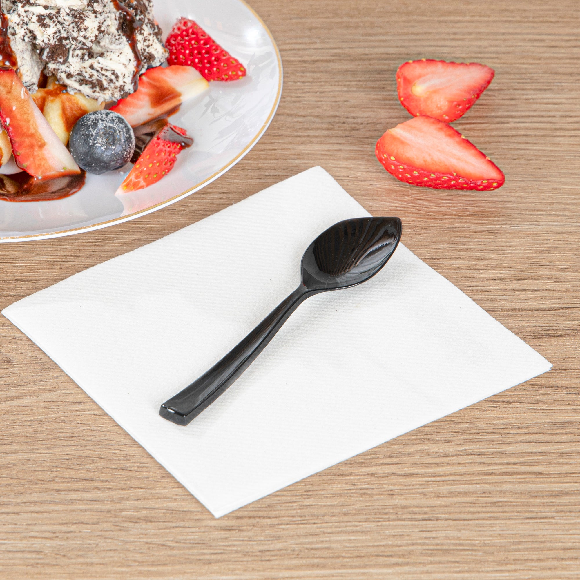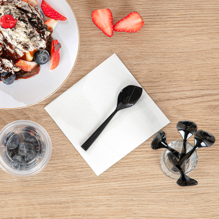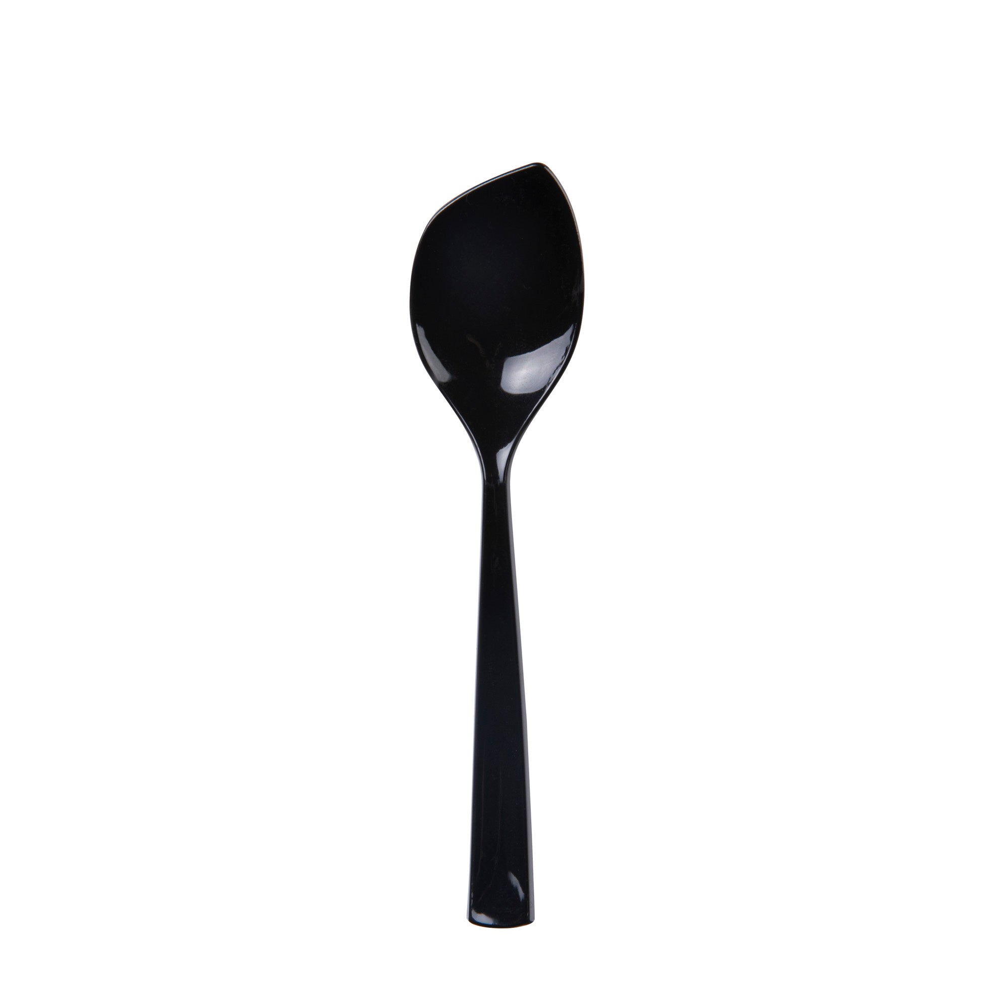 Enhance your tabletop aesthetics with our Coppetta Black Plastic Petal Spoons. Made from premium plastic, these disposable spoons are durable and don't break under the weight of hearty scoops. Featuring a petal-shaped head, these plastic spoons easily scoop through the dessert. These frozen yogurt spoons are designed with sturdy handles that are comfortable to hold. With their sleek black finish and unique shape, these cake spoons will add a memorable touch to your selection of frozen treats and delicious desserts. These dessert spoons measure 4.5 inches in length by 1 inch in width, making them ideal for serving alongside all types of frozen treats and delectable desserts. Shipped in a 500 count box.