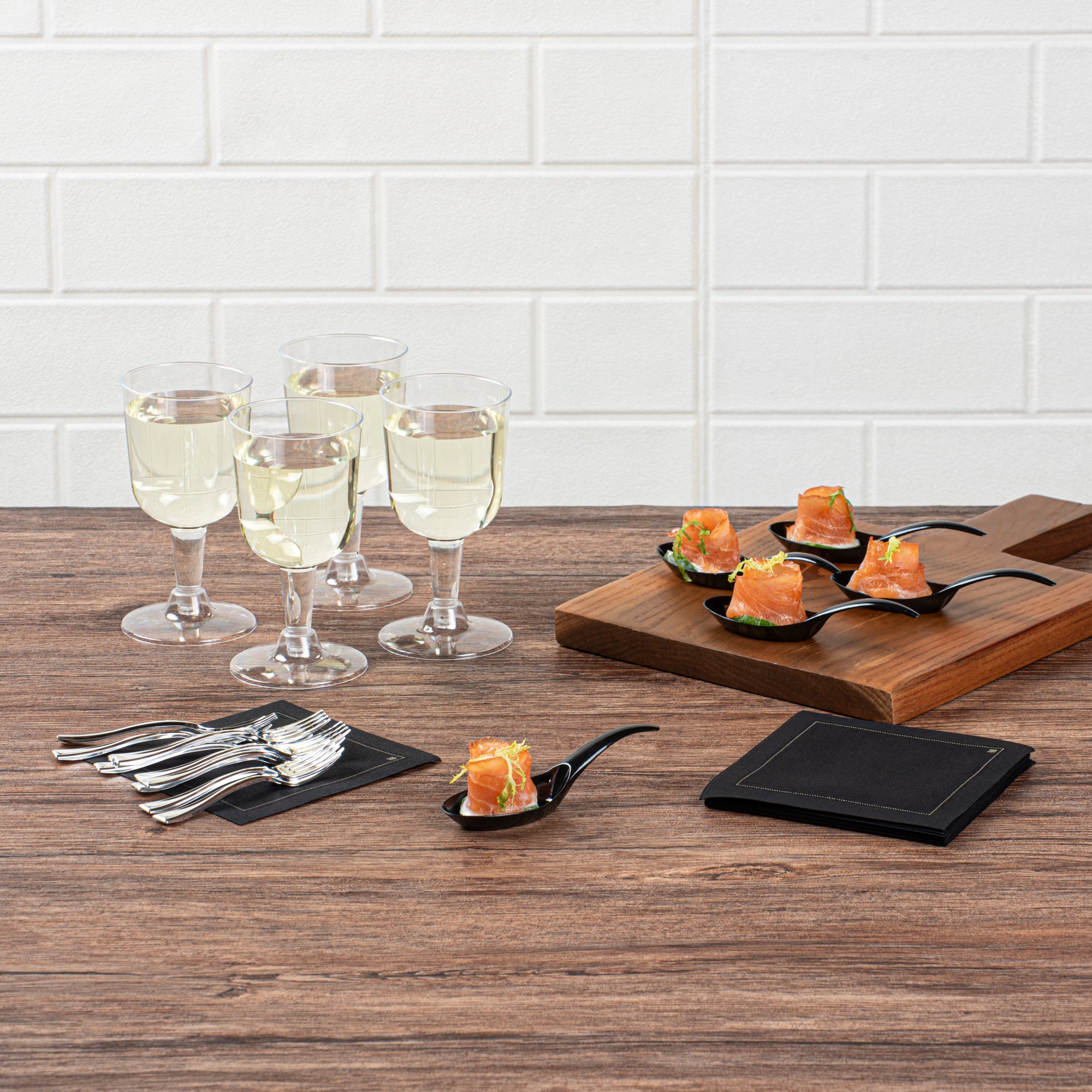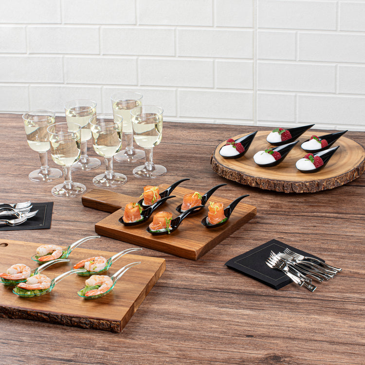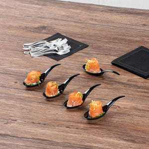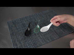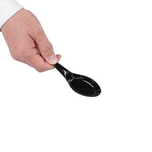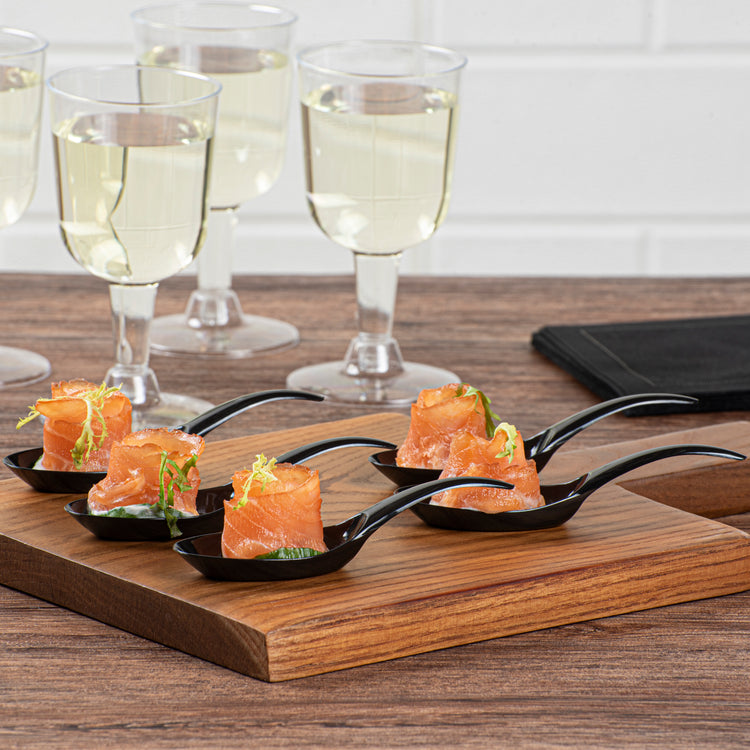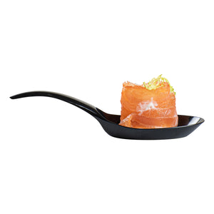 Make a splash at your next catered event with our Mini Serve Black Plastic Wave Spoons. Combining a polished black finish with a unique curved handle, these appetizer spoons are designed to have a striking effect on any occasion. The elongated basin of these wave spoons provides plenty of room for you to plate your bite-sized appetizers and miniature desserts, while their flat base enables sophisticated and seamless service. Constructed from premium plastic, these amuse bouche spoons are conveniently disposable and ensure quick and easy cleanup. Each of these plastic appetizer spoons measures 5 inches in length by 1.5 inches in width. Sold in a 100 count box.