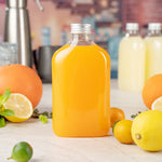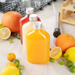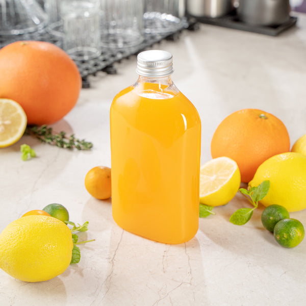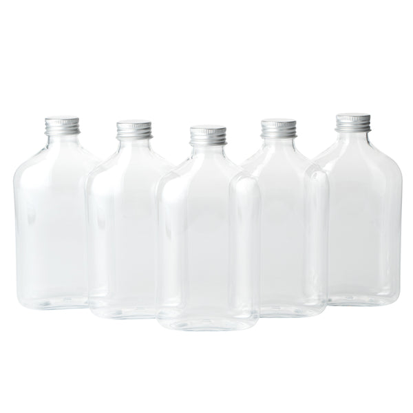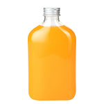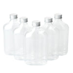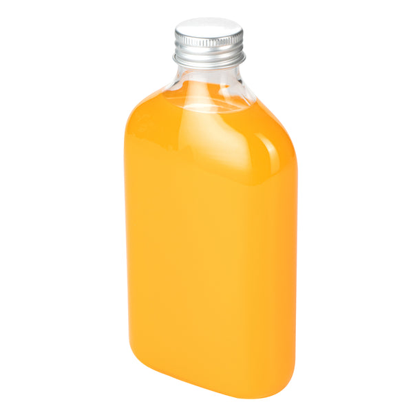 Add style to your events with our Bottle Tek 10-ounce Clear Plastic Flask Containers. These PET flasks have a classic square design, making them great for oils or syrups. The included aluminum lids of these bottles add to their style and keep the contents of each flask fresh and ready for serving. Featuring a crystal-clear finish, these plastic flask containers show off the colors of the liquids inside to catch the eyes of your guests. Constructed from PET plastic, these flask containers are recyclable so you can easily clean up after serving large catered events. Containing up to 10 ounces, these oblong bottles measure 3.25 long by 1.75 inches wide by 6.25 inches tall. Sold in a 100 count box.