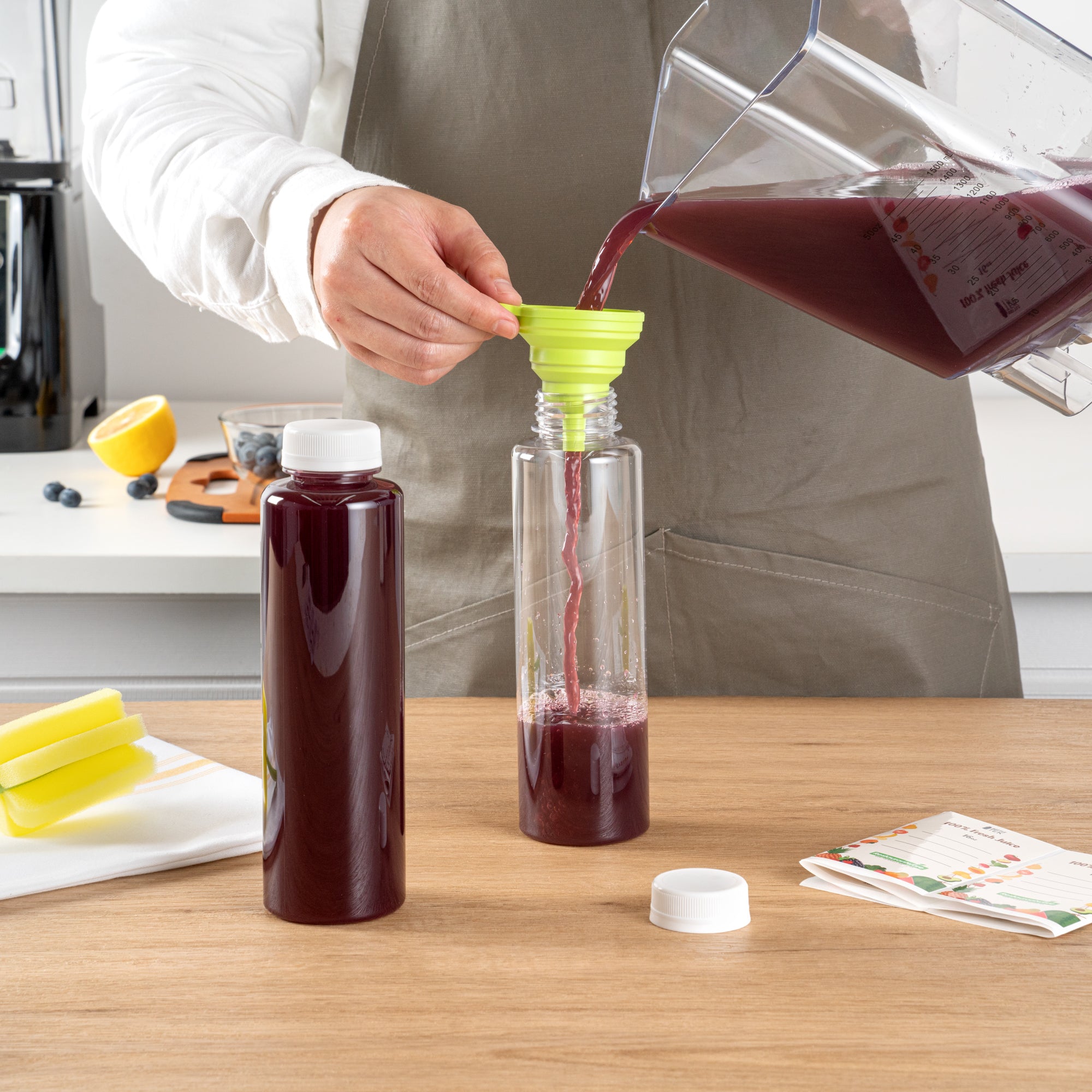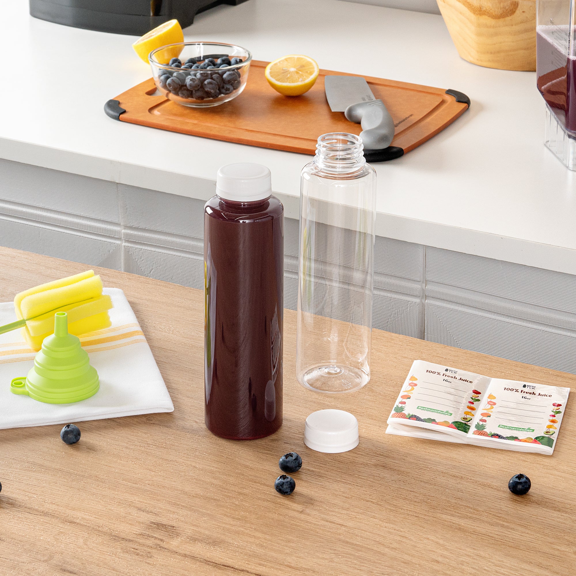 Say goodbye to spills with this convenient addition! These empty water bottles are equipped with a silicone funnel for smooth and zero-mess juice bottling.