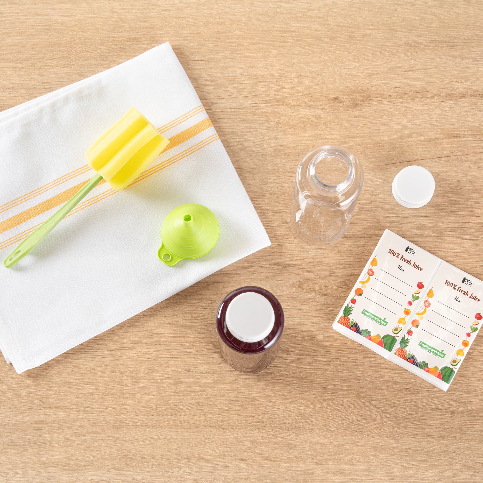 10 ROUND 16 OZ PLASTIC JUICE BOTTLES,CAPS,LABELS - 1 FUNNEL,BRUSH