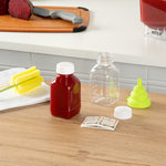 100 SQUARE 8OZ PLASTIC JUICE BOTTLES,CAPS,LABELS - 10 FUNNELS,BRUSHES