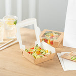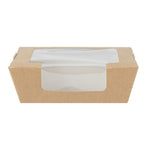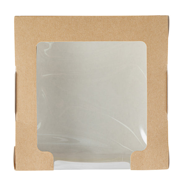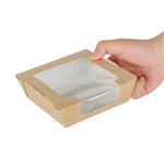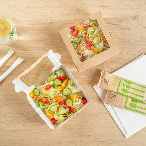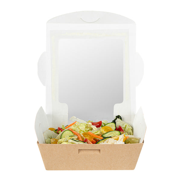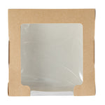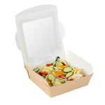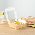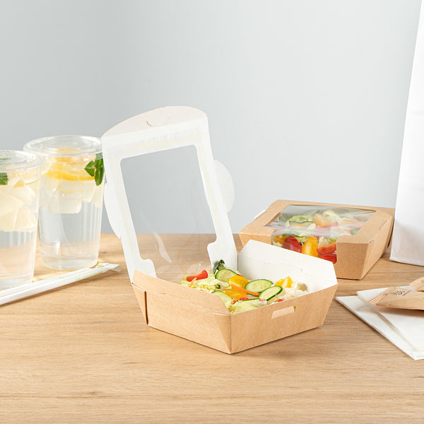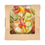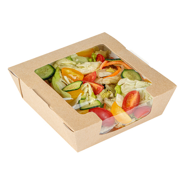 Serve up any mid-sized salad or food order confidently with our Cafe Vision 26-ounce Rectangle Kraft Paper Medium Bio Salad Boxes. The durable paper construction of these food to go packaging is sturdy enough for delivery yet easily disposable. With clear plastic windows on the top and side, these take out salad boxes allow customers to see the fresh ingredients inside while maintaining temperature control. The clamshell design of these paper take out containers securely contains ingredients during transport with a tight seal. To prevent leaks and to keep salads crisp, these grease-resistant restaurant takeaway containers have a silicone oil-coated interior. The 26-ounce capacity of these carry out containers with windows holds a generous single-serving salad portion. Measuring 5.75 inches long by 5.75 inches wide by 1.75 inches tall, these kraft salad boxes have a space-efficient design that maximizes freshness. Sold in a 200 count box.