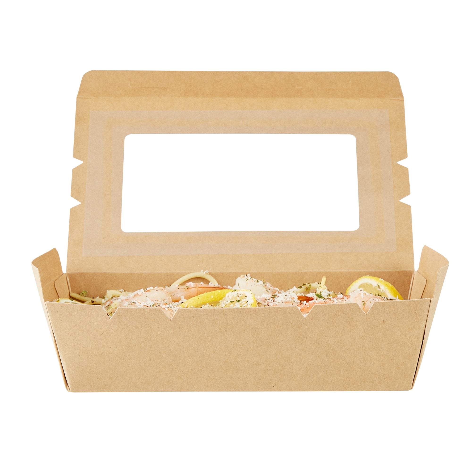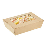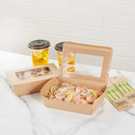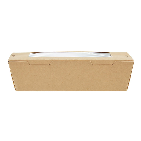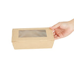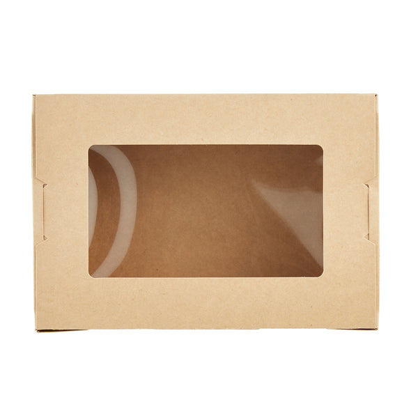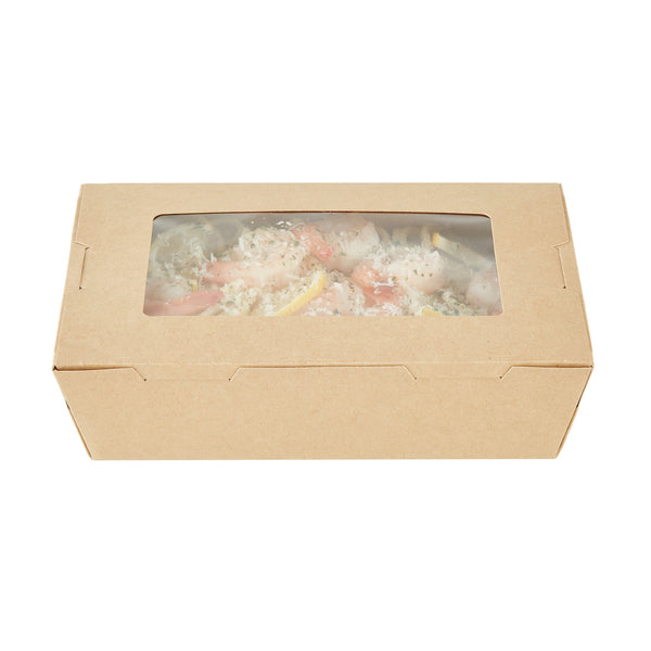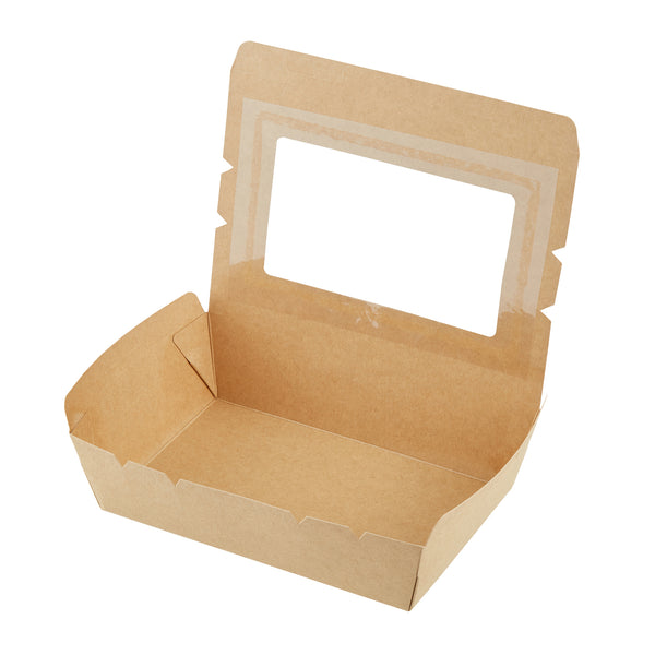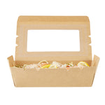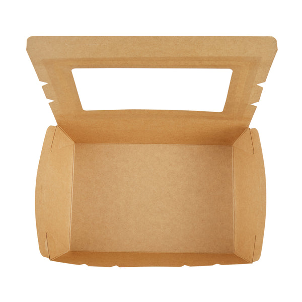 Pack your take out food with our Cafe Vision 42-ounce Kraft Paper Medium Take Out Containers. These to go boxes are equipped with 4 hinge locks that firmly secure the packaging, ensuring your food remains safe during transport. Featuring a clear plastic window, these take out food containers allow your staff to quickly identify contents for efficient organization. The grease-resistant PE lining in these takeaway boxes prevents oil or saucy leaks, providing a neat dining experience for your customers. Crafted from premium paper, these carry out containers are perfect for securely packing both hot and cold food items. Designed with eco-conscious establishments in mind, these disposable takeaway boxes are recyclable, making them an environmentally-friendly choice. The kraft finish of these paper boxes for food adds a stylish touch to your takeout orders, enhancing your brand's presentation. These paper to go containers are freezer-safe, allowing you to store leftovers conveniently for later use. Measuring 8 inches in length by 5.5 inches in width by 2 inches in height, these take out boxes have a generous 42 ounces and accommodate a variety of meals. Sold in a 200 count box.