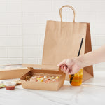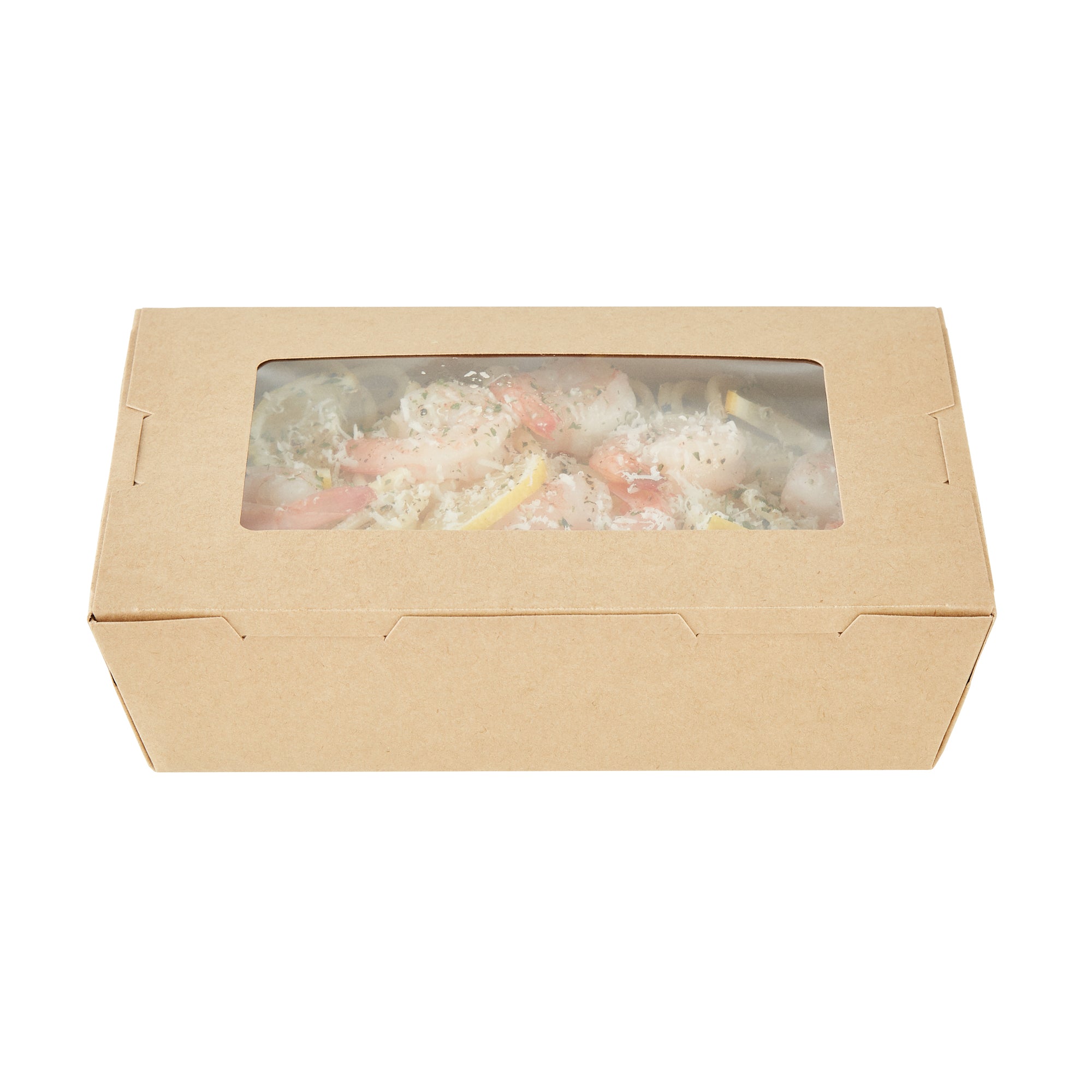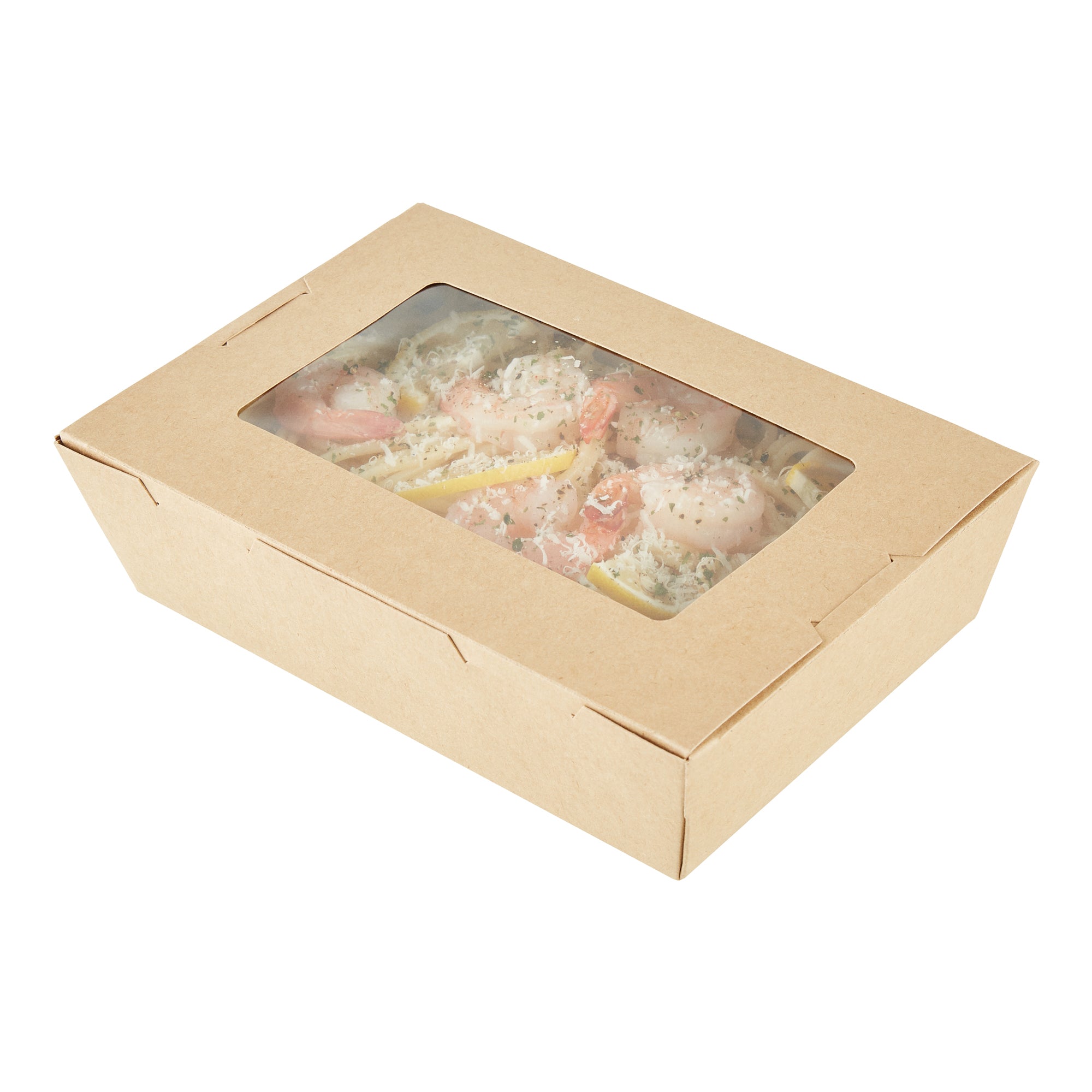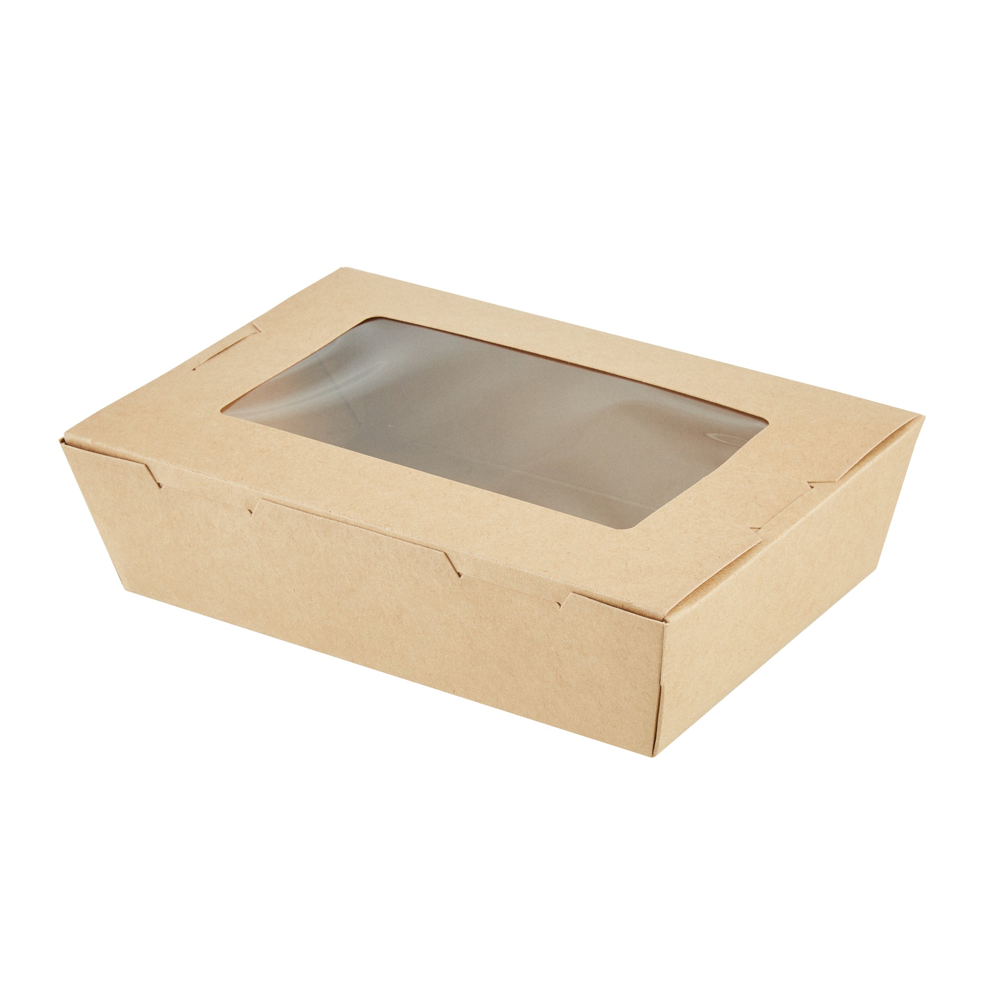 Pack your take out food with our Cafe Vision 42-ounce Kraft Paper Medium Take Out Containers. These to go boxes are equipped with 4 hinge locks that firmly secure the packaging, ensuring your food remains safe during transport. Featuring a clear plastic window, these take out food containers allow your staff to quickly identify contents for efficient organization. The grease-resistant PE lining in these takeaway boxes prevents oil or saucy leaks, providing a neat dining experience for your customers. Crafted from premium paper, these carry out containers are perfect for securely packing both hot and cold food items. Designed with eco-conscious establishments in mind, these disposable takeaway boxes are recyclable, making them an environmentally-friendly choice. The kraft finish of these paper boxes for food adds a stylish touch to your takeout orders, enhancing your brand's presentation. These paper to go containers are freezer-safe, allowing you to store leftovers conveniently for later use. Measuring 8 inches in length by 5.5 inches in width by 2 inches in height, these take out boxes have a generous 42 ounces and accommodate a variety of meals. Sold in a 200 count box.
