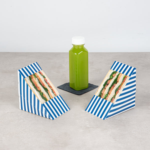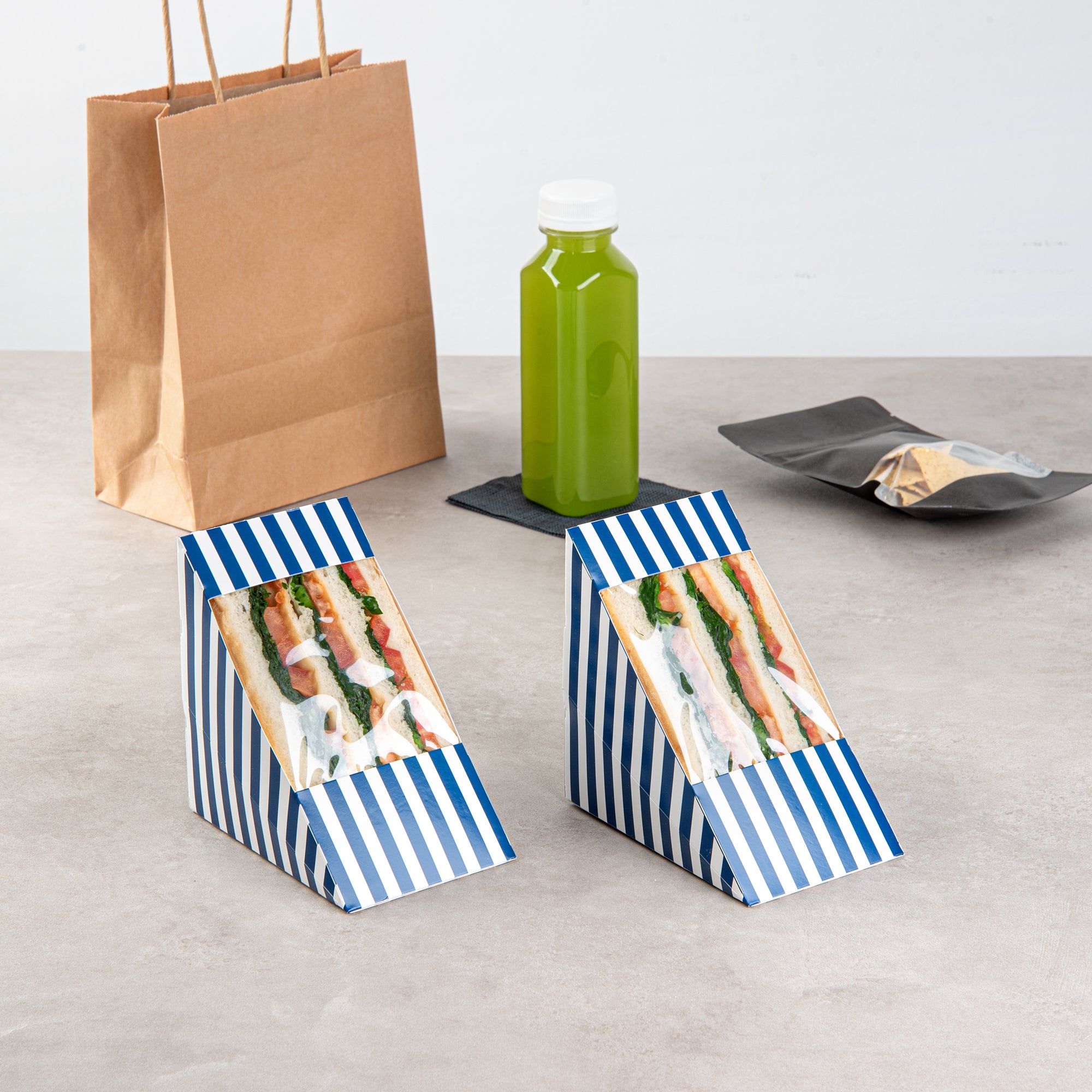 Make your products stand out on the shelves with our Cafe Vision Triangle Blue and White Stripe Paper Large Sandwich Boxes. The triangular design of these premium sandwich boxes allows for efficient use of space, fitting sandwiches perfectly inside it. Constructed of high-quality paper material, these sandwich boxes are durable and don't lose their integrity during delivery. Featuring a small transparent window, these grease-resistant sandwich boxes showcase freshly made sandwiches, enticing customers and highlighting your quality ingredients. Easily fitting multiple half-cut sandwiches, these takeaway sandwich boxes are ideal for quick service and delivery. Disposable and lightweight, these sandwich containers reduce mess and make cleanup a breeze. Measuring 4.75 inches in length by 4.75 inches in width by 3.25 inches in height, these spacious paper sandwich boxes securely contain your generously portioned sandwiches. Sold in a 200 count box.