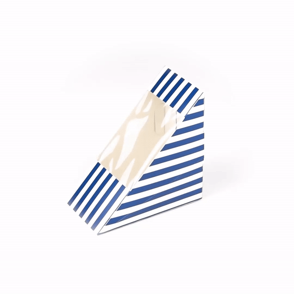 Offer a stylish way to package sandwiches with our Cafe Vision Triangle Blue and White Stripe Paper Medium Sandwich Boxes. The triangular design of these premium sandwich boxes allows for easy handling and storage. Made of high-quality paper material, these sandwich boxes are durable. A small transparent window of these grease-resistant sandwich boxes showcases your sandwiches while keeping them fresh while preventing oil from seeping out. Easily fitting half-cut sandwiches, these sandwich packaging containers are efficient for deliveries. Lightweight and stackable, these sandwich packaging boxes save space when folded. Measuirng 4.75 inches in length by 4.75 inches in width by 2.75 inches in height, these sandwich boxes are perfectly sized for grab-and-go items. Sold in a 200 count box.