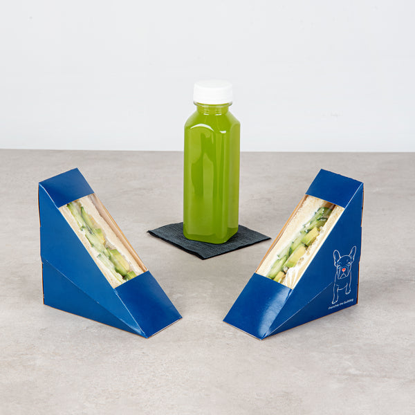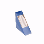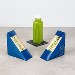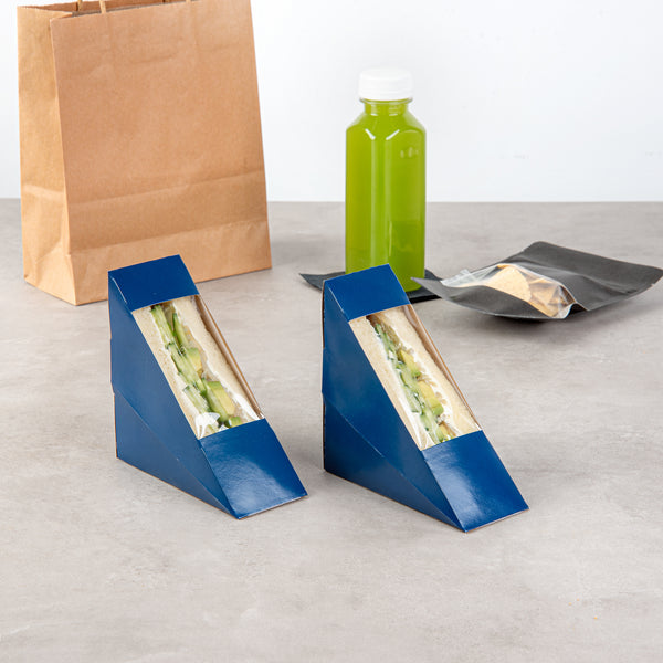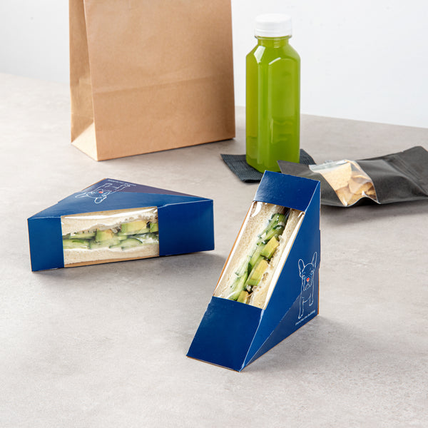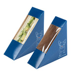 Provide an elegant presentation for your sandwiches with our Cafe Vision Triangle Frenchie Paper Small Sandwich Boxes. The triangular design of these sandwich containers allows for efficient use of space and an eye-catching display that highlights your creations. Constructed of high-quality paper material, these paper sandwich boxes keep contents fresh while being environmentally friendly. A small transparent window of these premium paper sandwich boxes gives customers a sneak peek into the deliciousness. Easily fitting half-cut sandwiches, these sandwich containers are ideal for catering deliveries and grab-and-go options. These sandwich boxes with a window are disposable, making cleanup a breeze. Measuring 4.75 inches in length by 4.75 inches in width by 2 inches in height, these compact sandwich boxes are ideal for cafes or picnics. Sold in a 200 count box.