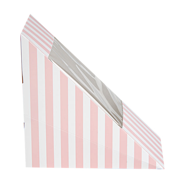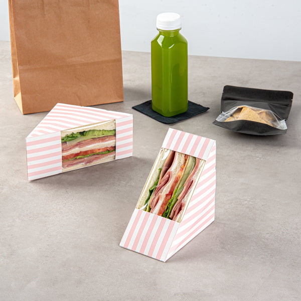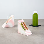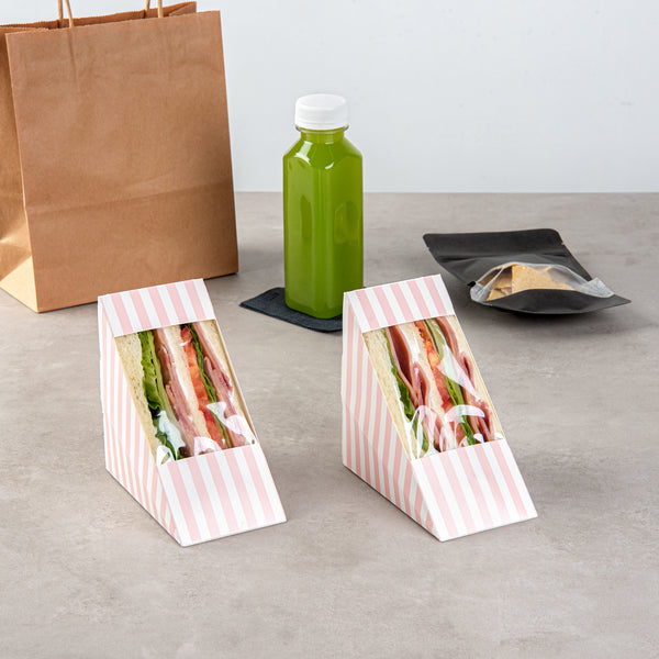 Keep your sandwiches secure and easy to carry with our Cafe Vision Triangle Pink and White Stripe Paper Medium Sandwich Boxes. The triangular design of these premium sandwich wedges allows for easy grabbing and passing out. The high-quality paper material is durable enough to securely transport food without tearing. A small transparent window of these grease-resistant sandwich boxes gives customers a sneak peek at the deliciousness inside. Easily fitting half-cut sandwiches, these sandwich containers are efficient for quick deliveries. These premium paper sandwich boxes are disposable and eliminate the need for returns or washing. Measuring 4.75 inches in length by 4.75 inches in width by 2.75 inches in height, these compact sandwich packaging boxes conserve space in transport while displaying your sandwiches. Sold in a 200 count box.