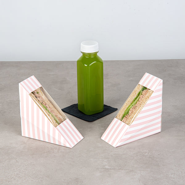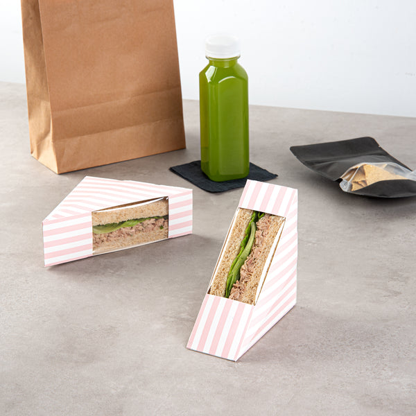 Our Cafe Vision Triangle Pink and White Stripe Paper Small Sandwich Boxes are the perfect packaging solution for small sandwiches and snacks. With a triangular design, these sandwich boxes create an eye-catching presentation that helps your treats stand out. Constructed from high-quality paper material, these sandwich containers are durable yet lightweight for easy transport. A small transparent window in these sandwich packaging boxes allows customers to peek at the delicious contents inside while maintaining freshness. Easily fitting half-cut sandwiches, these premium grease-resistant paper sandwich boxes are efficient for quick deliveries and grab-and-go meals. As disposable containers, these sandwich boxes eliminate the need for returns or replacements. Measuring 4.75 inches in length by 4.75 inches in width by 2 inches in height, these compact sandwich boxes conserve space while accommodating most small sandwiches. Sold in a 200 count box.