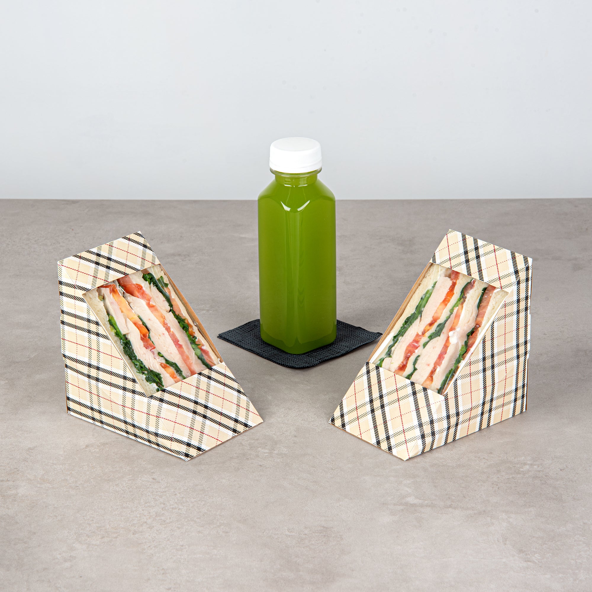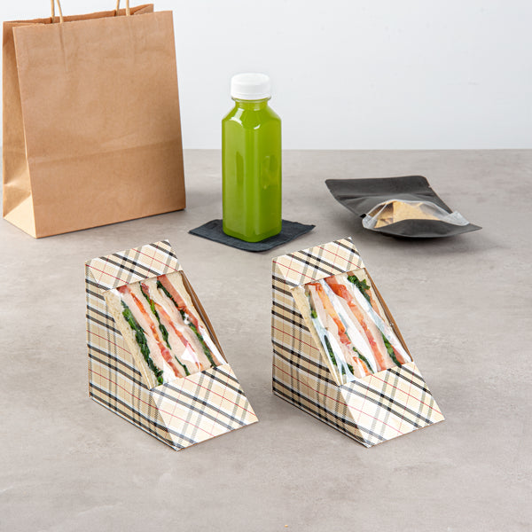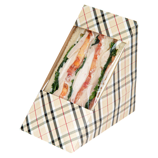 Enhance customer convenience with our Cafe Vision Triangle Plaid Paper Large Sandwich Boxes. These sandwich containers are made from premium paper material that is durable and doesn't lose its structural integrity. Featuring a transparent window, these grease-resistant sandwich boxes allow customers to view the delicious fillings inside while maintaining freshness, making them efficient for deliveries. Triangular in shape, these paper sandwich boxes easily fit many half-cut sandwiches and are ideal for grab-and-go restaurants. These disposable sandwich containers make cleaning up a breeze. Lightweight yet sturdy, these paper sandwich boxes can be handled with ease while transporting. These Plaid paper sandwich boxes give an upscale look to your restaurant's packaging. Measuring 4.75 inches in length by 4.75 inches in width by 3.25 inches in height, these paper sandwich boxes are perfectly sized to showcase your sandwiches. Sold in a 25 count box.