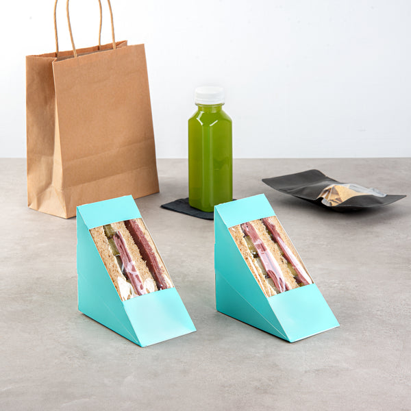 Cafe Vision Triangle Turquoise Paper Medium Sandwich Boxes provide premium packaging for sandwiches. The triangular design allows for efficient storage and transport. Constructed from high-quality paper material, these sandwich boxes keep contents fresh. A small transparent window showcases your delectable sandwiches while maintaining food safety. Easily fitting half-cut sandwiches, these disposable sandwich containers are ideal for deliveries. Lightweight yet durable, these sandwich packaging boxes handle deliveries with ease. These turquoise sandwich boxes give a sleek profile while providing a secure grip. Measuring 4.75 inches in length by 4.75 inches in width by 2.75 inches in height, these paper sandwich boxes compactly contain your sandwiches. Sold in a 25 count box.