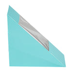 Provide a stylish way to package half sandwiches with our Cafe Vision Triangle Turquoise Paper Small Sandwich Boxes. The triangular design of these sandwich boxes allows for efficient use of space during transport and storage. Constructed of high-quality paper material, these premium sandwich boxes are disposable yet durable enough to securely contain ingredients. A small transparent window of these grease-resistant sandwich boxes showcases the sandwich inside to tempt customers. Easily fitting half-cut sandwiches, these disposable sandwich boxes are ideal for catering deliveries and grab-and-go meals. Disposable and lightweight, these paper sandwich containers reduce cleanup. Measuring 4.75 inches in length by 4.75 inches in width by 2 inches in height, these compact sandwich boxes conserve space in any kitchen. Sold in a 200 count box.