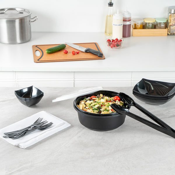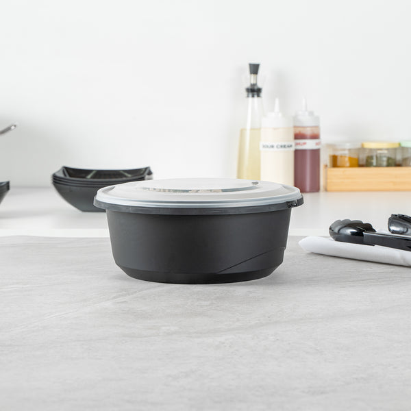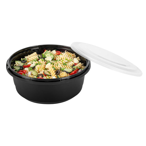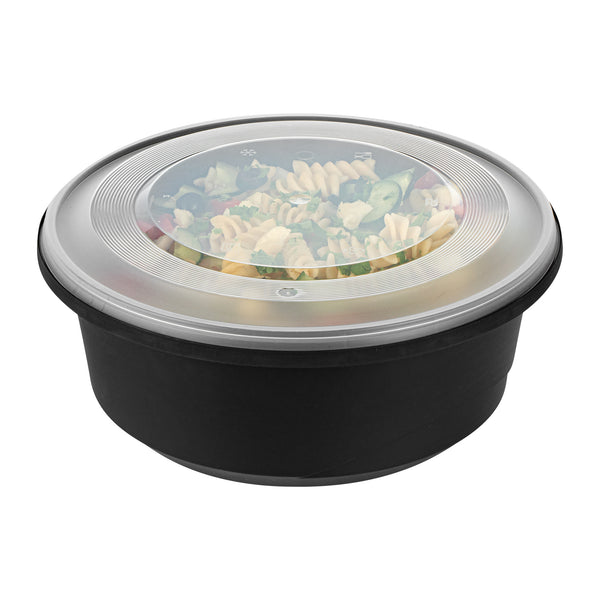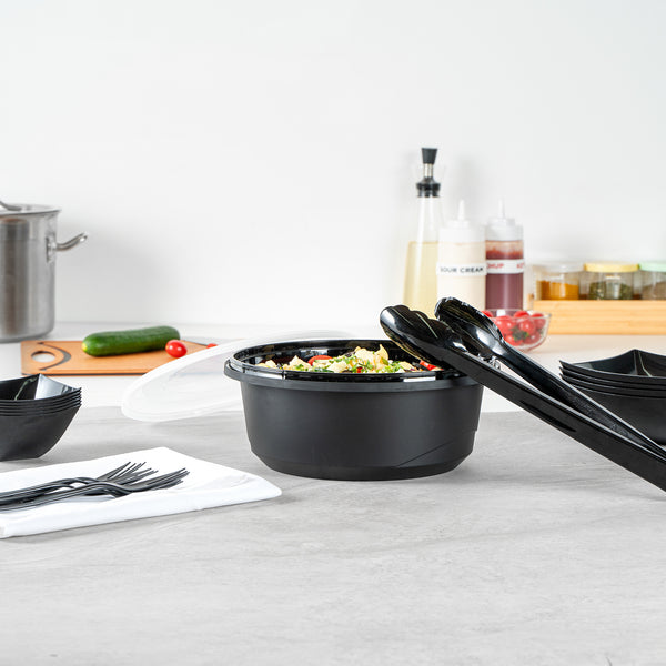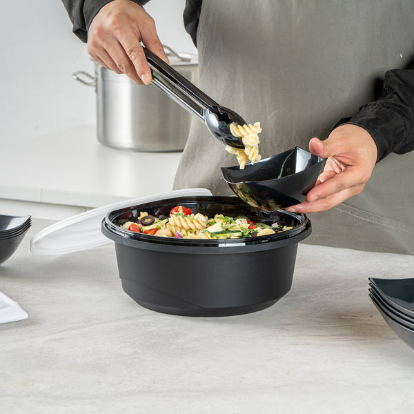 Elevate your catering experience with our Cater Tek 101-ounce Round Black Plastic Catering / Serving Bowls. These serving bowls come with clear lids that form a snug fit and help maintain freshness while enhancing the convenience of storage and transport. Microwave-safe, these plastic bowls can withstand temperatures up to 248F, ensuring versatility for various dishes. Plus, these large serving bowls are freezer-safe, making them perfect for storing leftovers. Crafted from premium plastic, these serving dishes are ideal for holding both hot and cold food items. For an easy cleanup, these disposable bowls can be discarded after use. These plastic bowls with lids boast a generous capacity of 101 ounces and measure 9.65 inches in diameter by 4.02 inches in height. Sold in a 25 count box.
