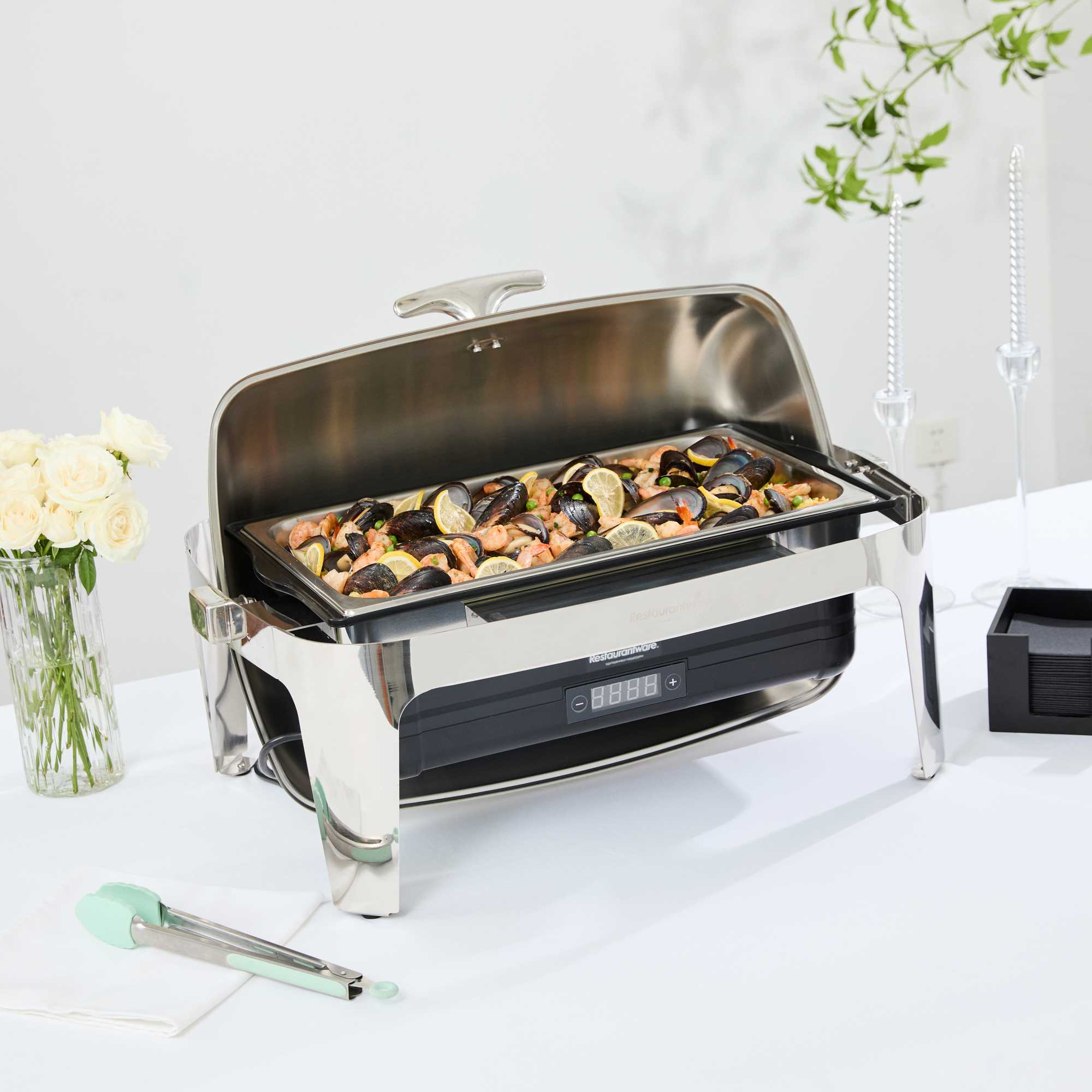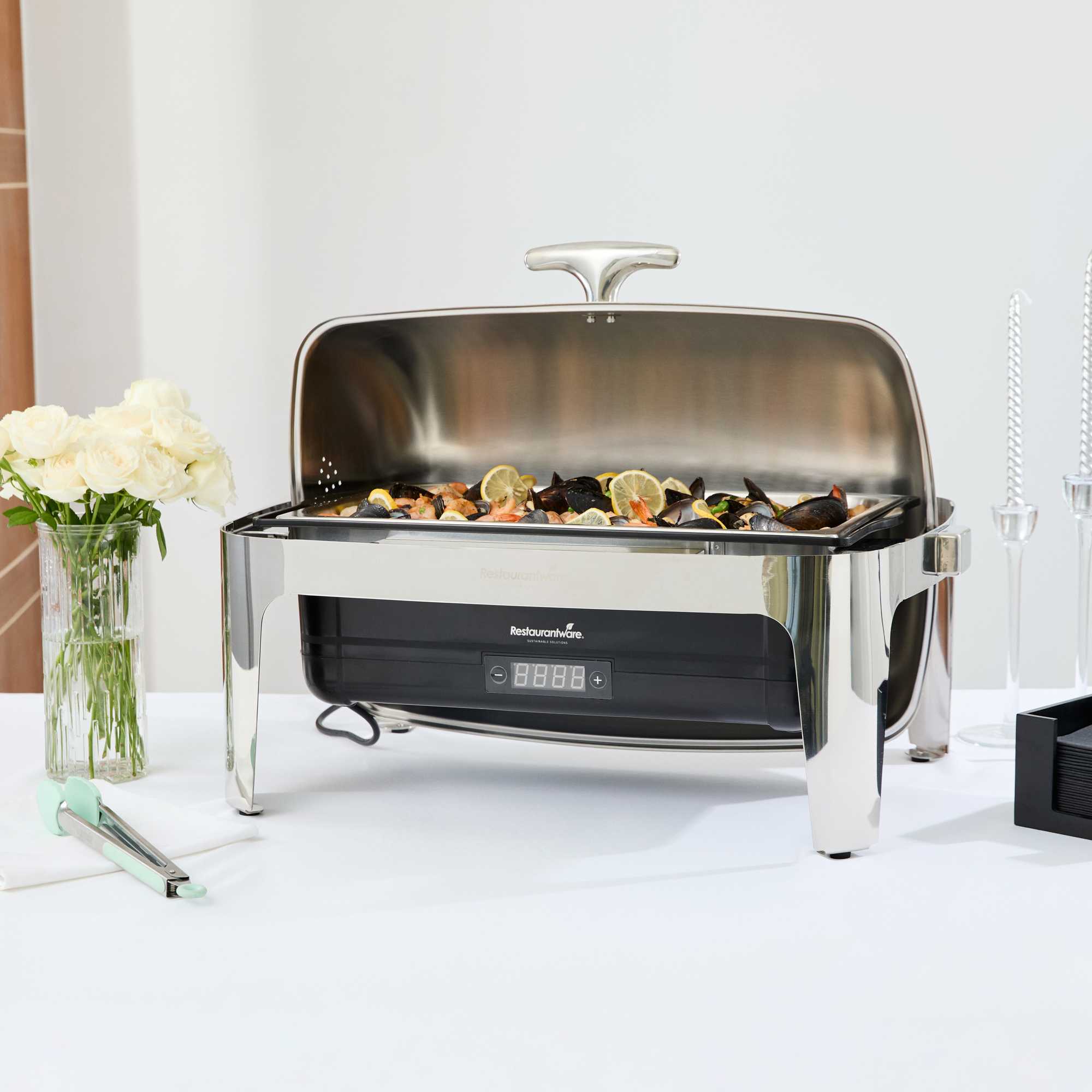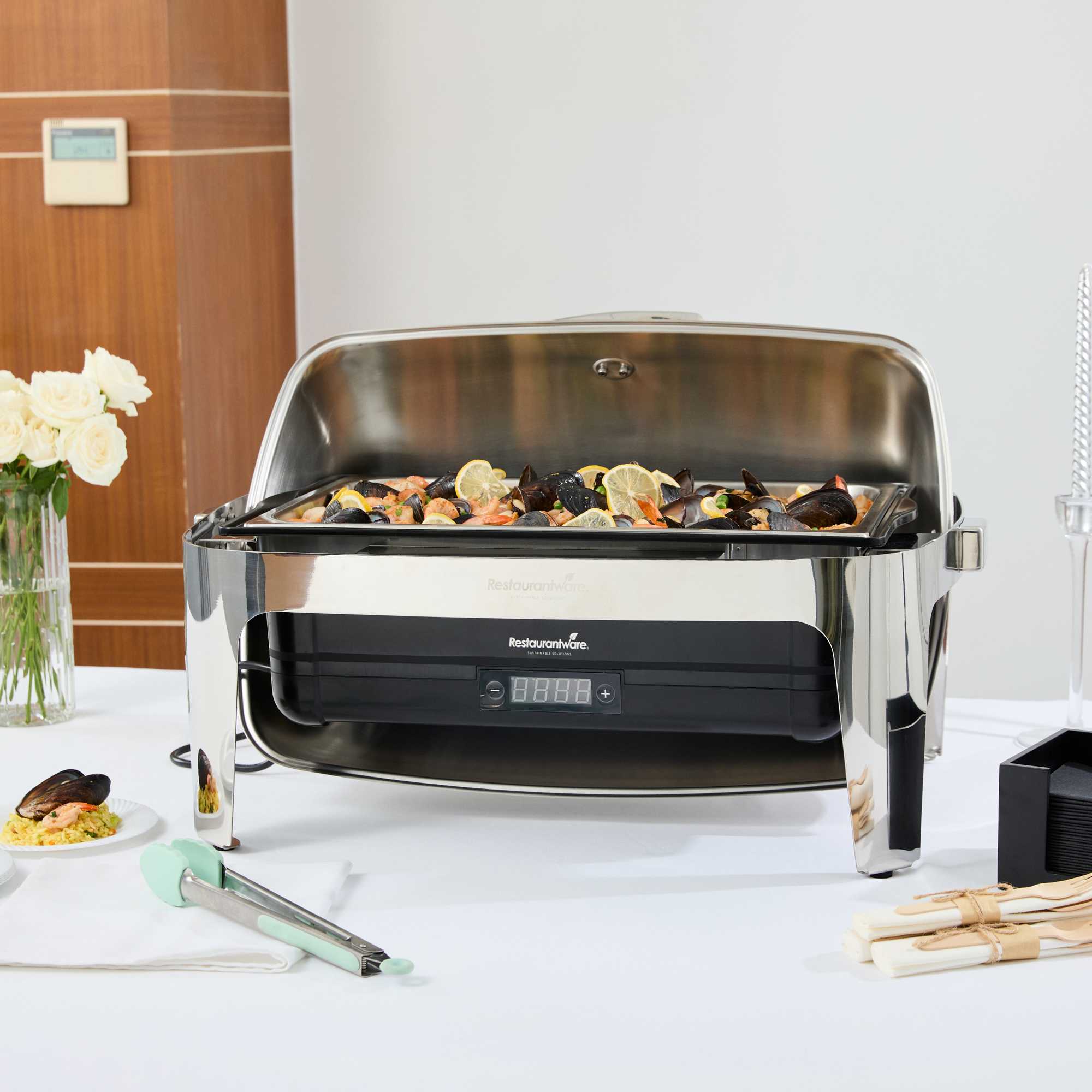 - Roll-top cover enables easy service in busy buffets
