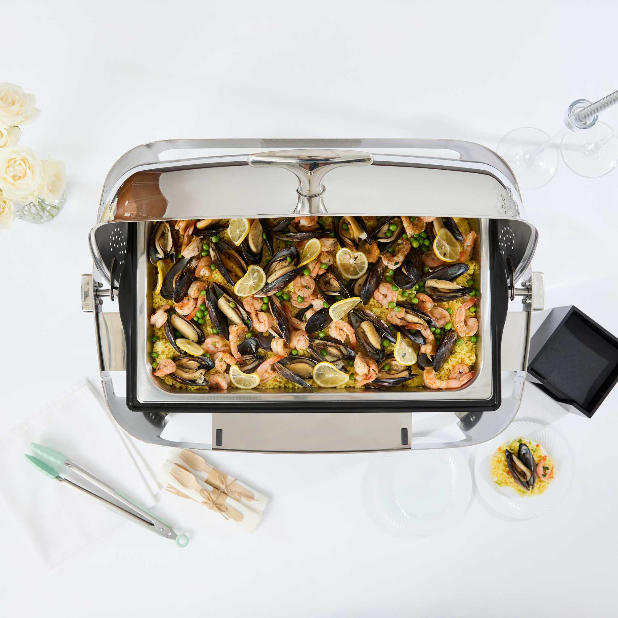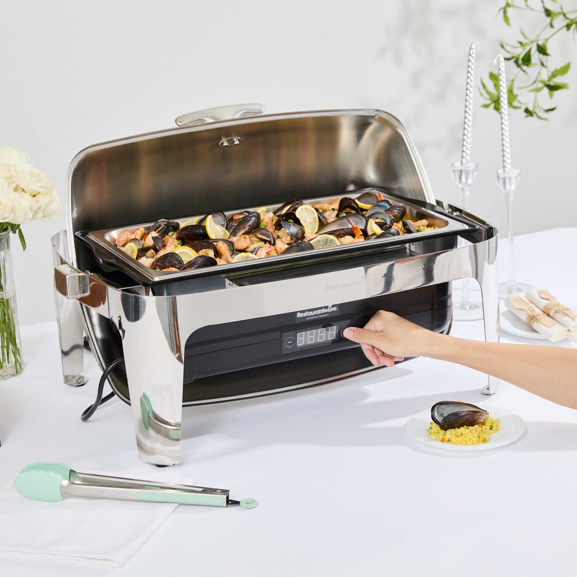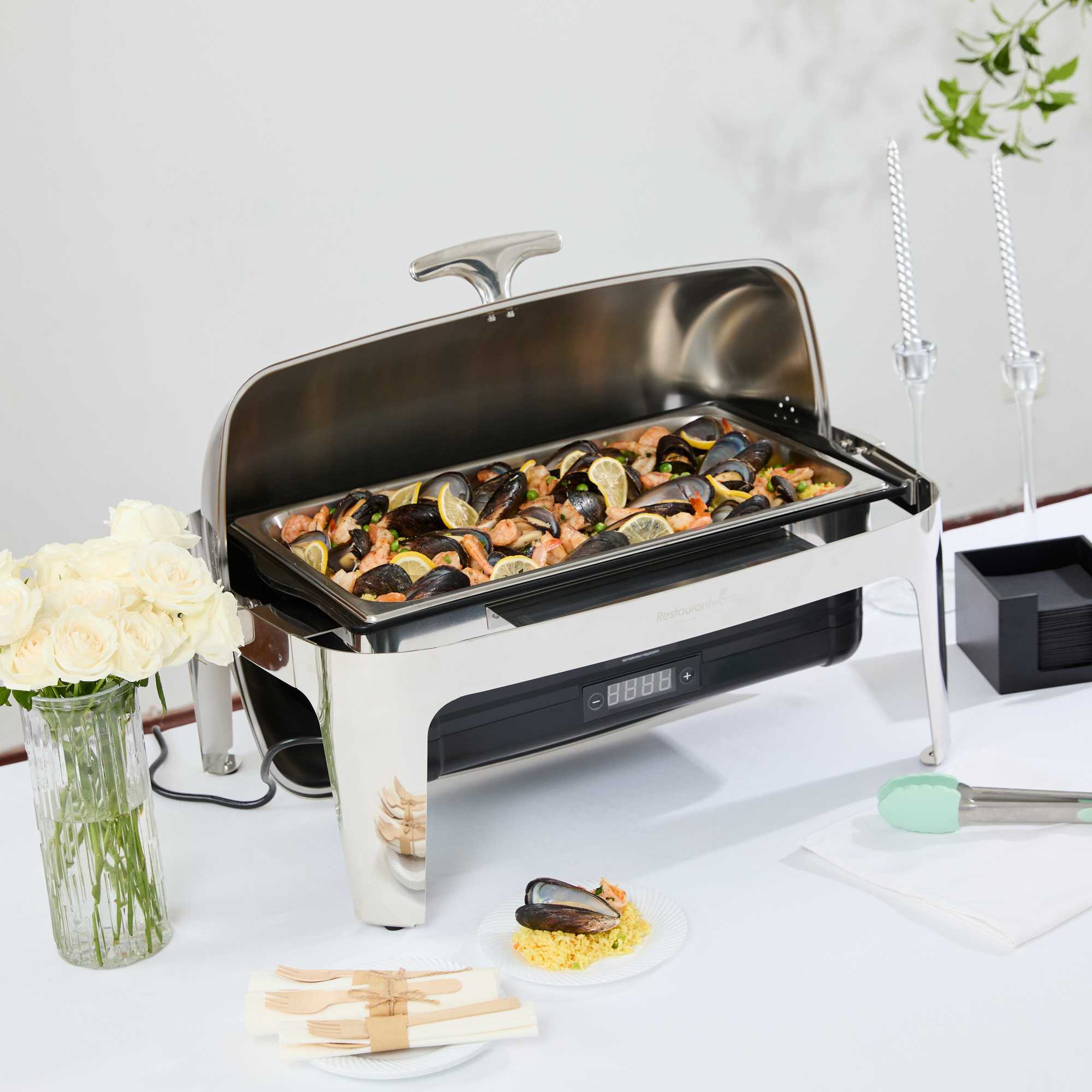 - Roll-top cover enables easy service in busy buffets