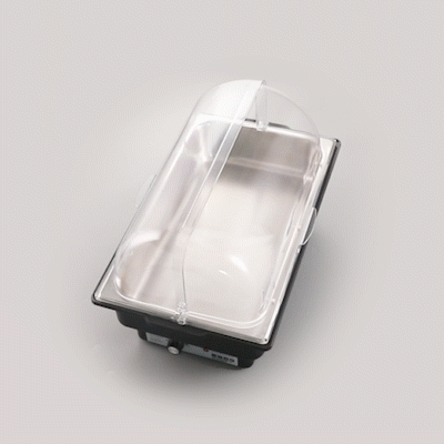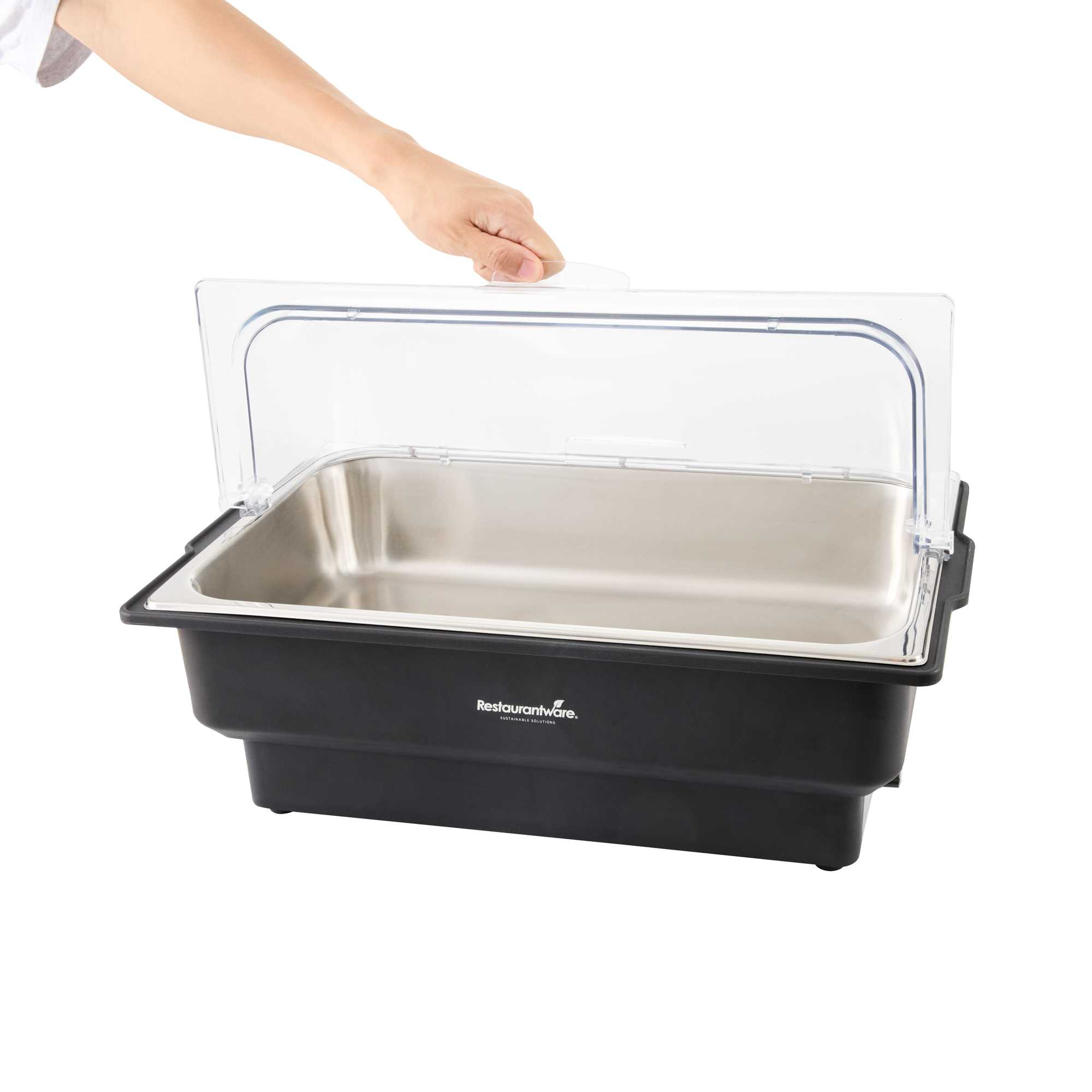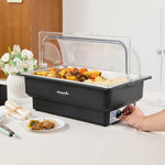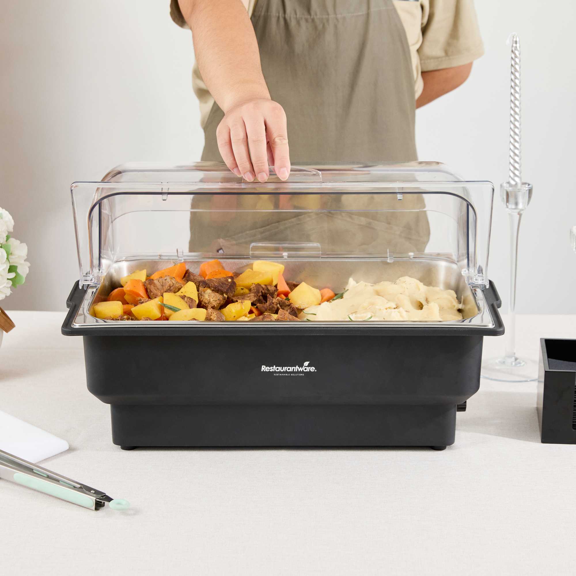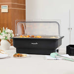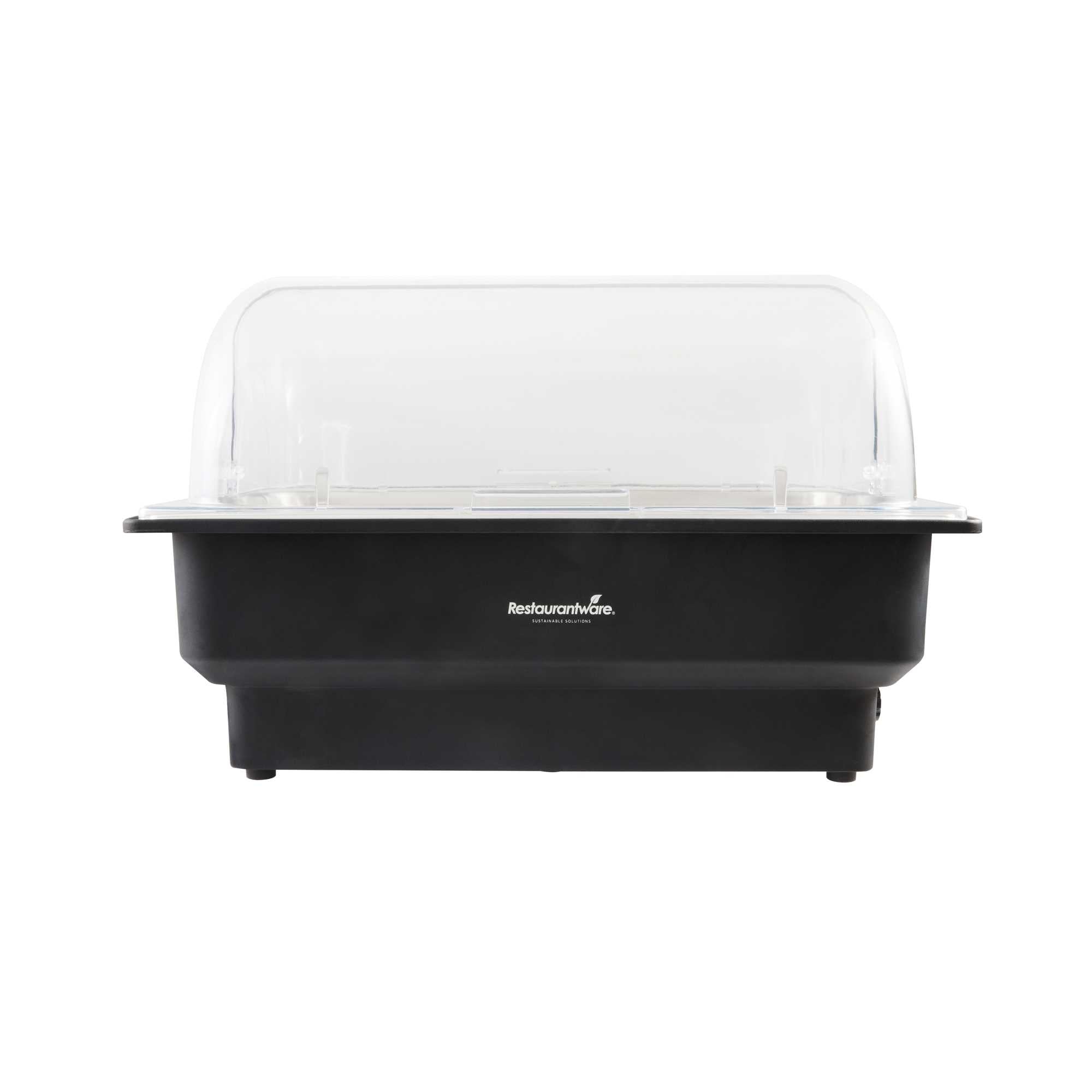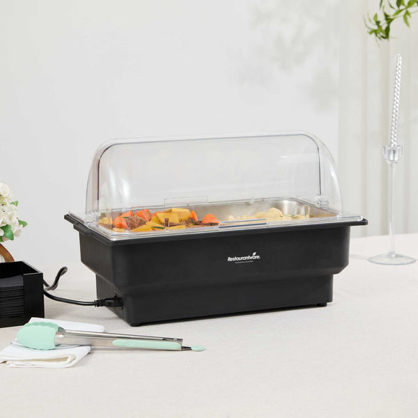 - Includes roll top cover and food pan for a complete warming setup
