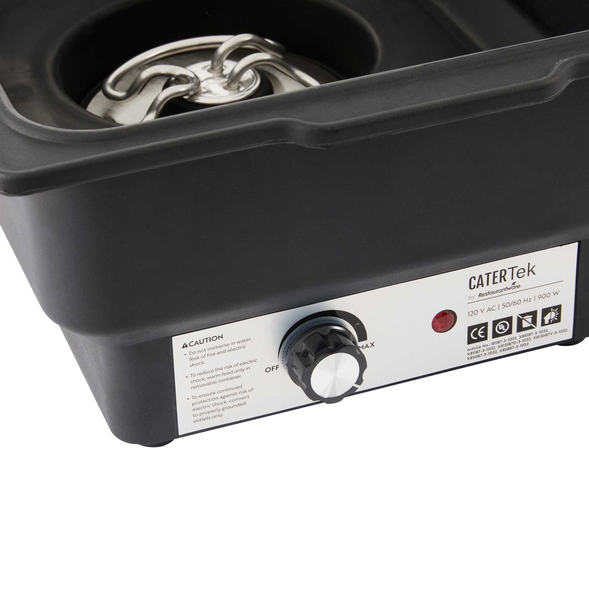 Avoid safety hazards with our Cater Tek 14-quart Full Size Electric Water Pan / Warmer. This electric chafer features a 760-watt heating element, delivering consistent heat to keep food at safe serving temperatures throughout your event. The built-in auto cut-off thermostat prevents overheating, offering added safety during service. With its full-size capacity, it's perfect for holding large quantities, ideal for weddings, buffets, and catered events. The roll-top cover ensures smooth access for guests and staff, while the included food pan accommodates a variety of hot dishes. Measuring 25.39 inches in length, 13.78 inches in width, and 14.57 inches in height, this electric warmer combines safety, capacity, and performance in one sleek design. Sold in a 1 count box.