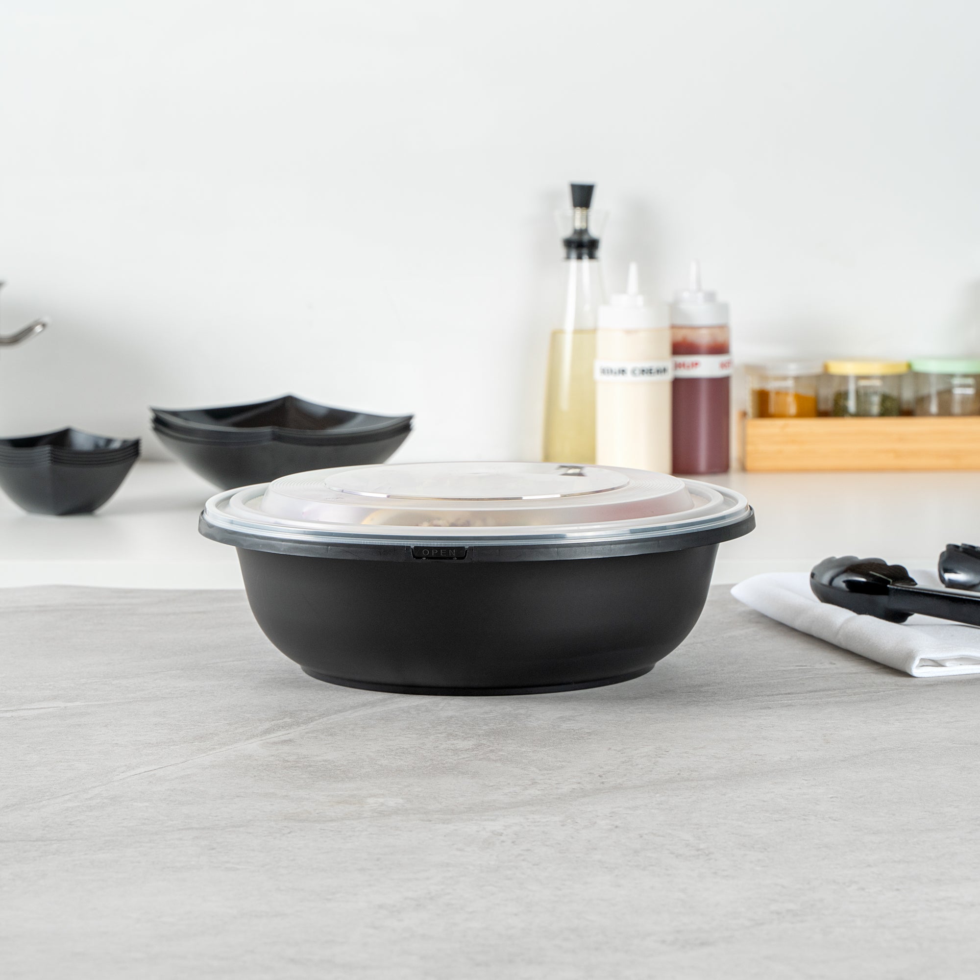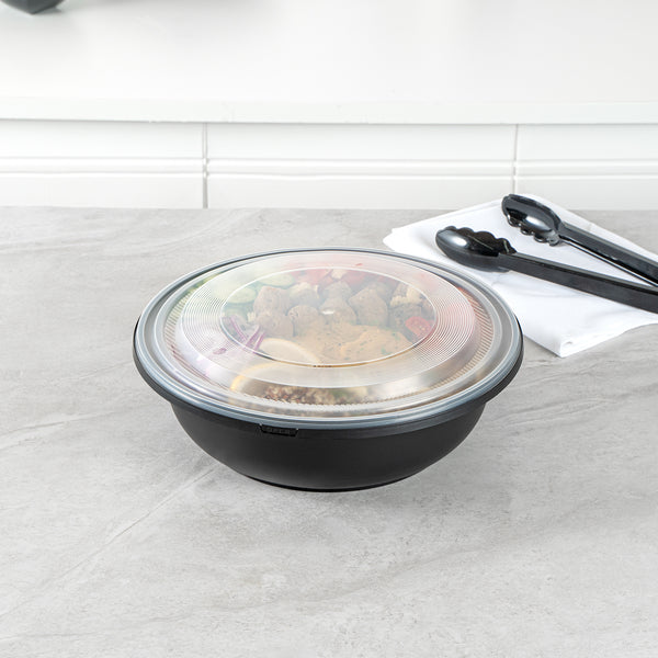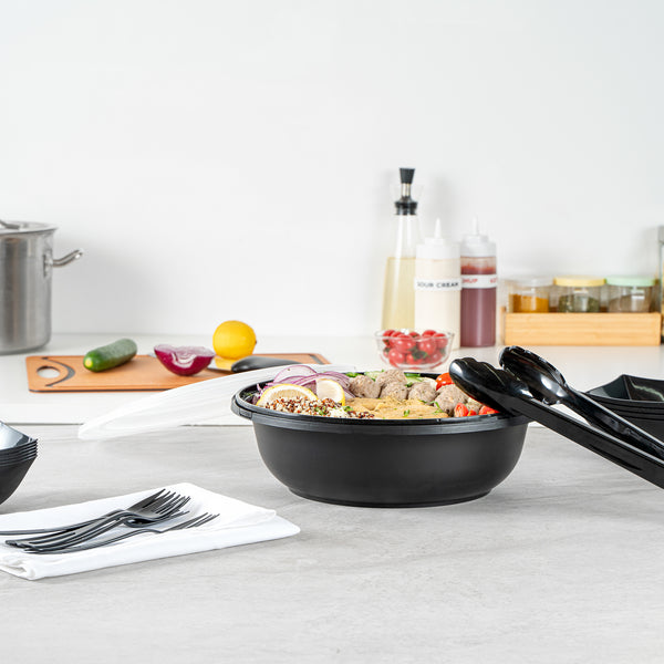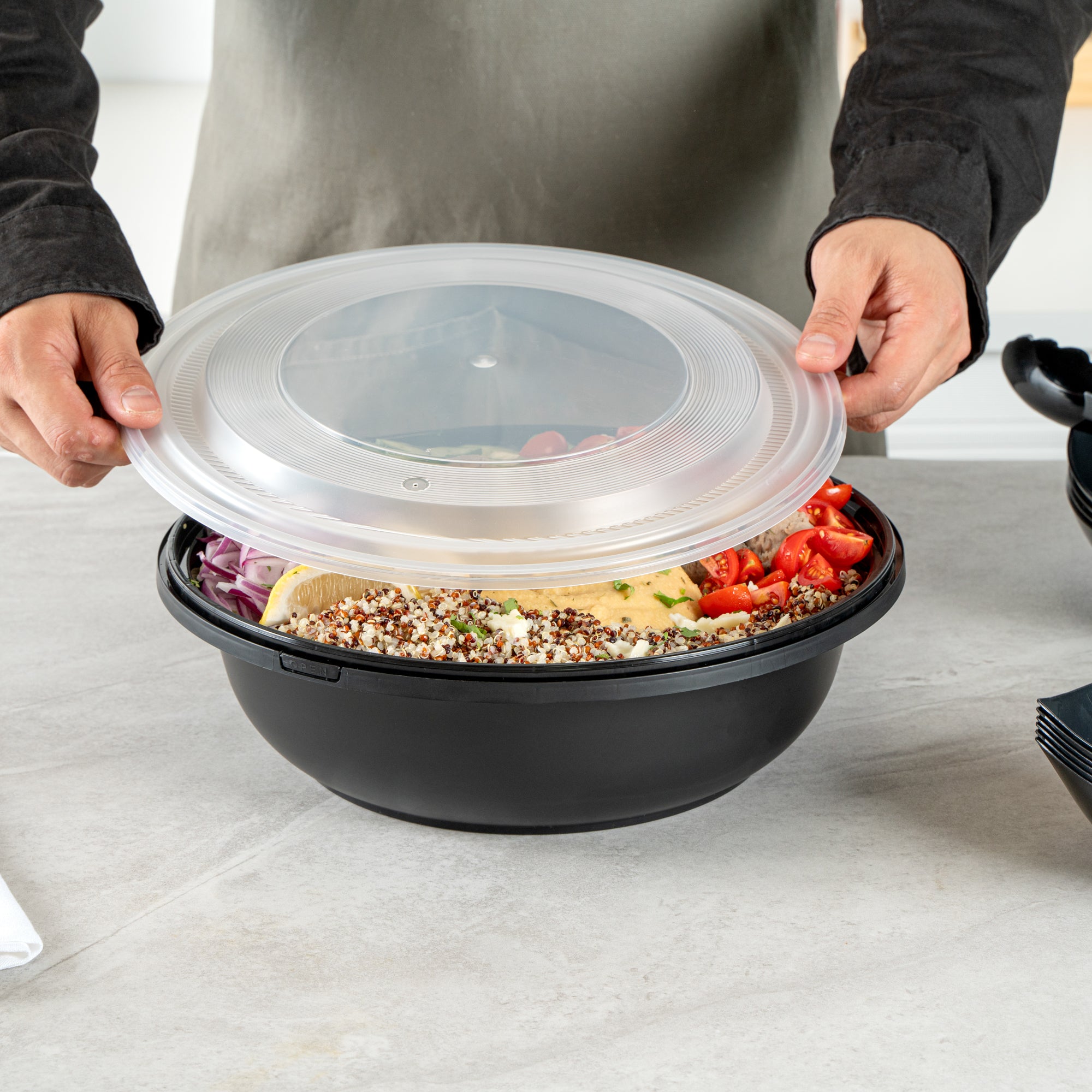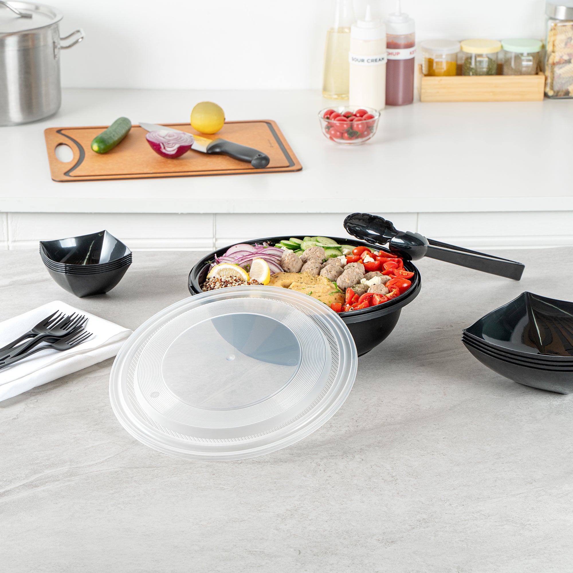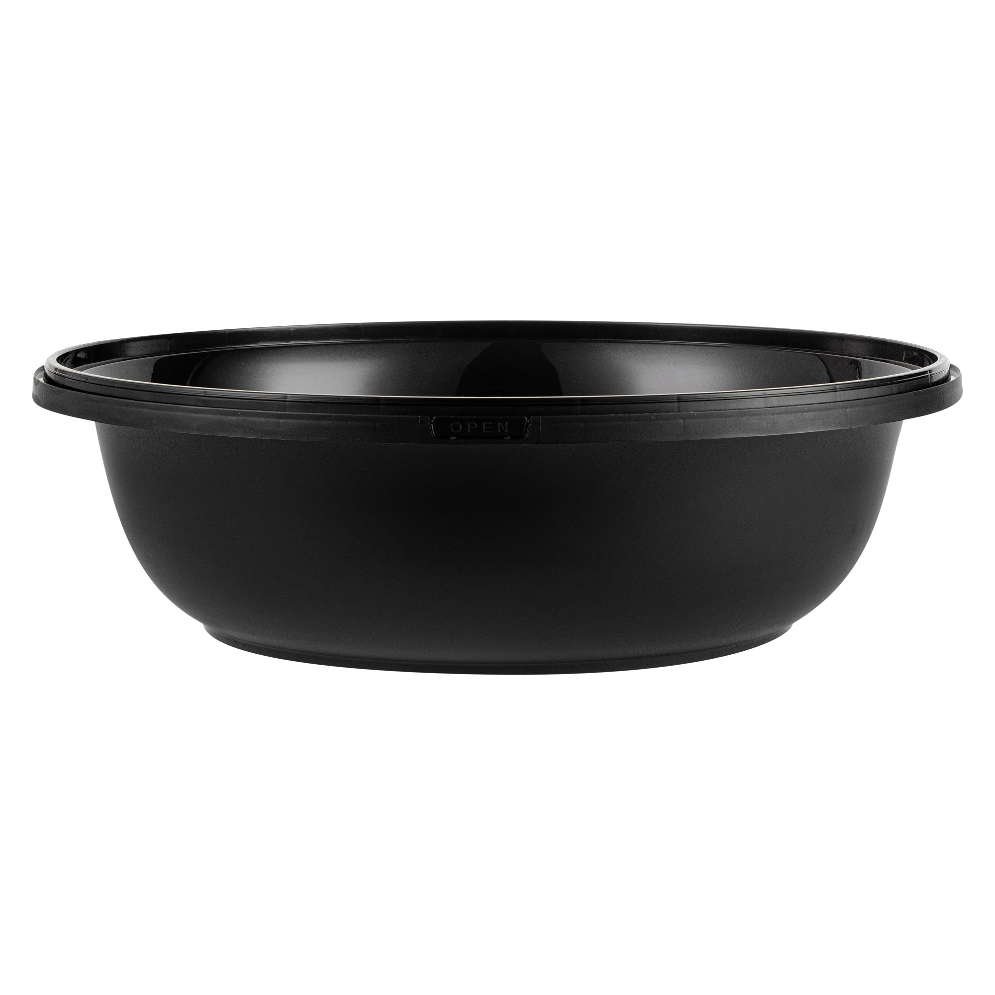 Elevate your food presentation with our Cater Tek 142-ounce Round Black Plastic Catering / Serving Bowls. These serving bowls come with clear lids that form a snug fit and help maintain freshness while enhancing the convenience of storage and transport. Designed to be microwave-safe, these plastic bowls can withstand temperatures up to 248F, making them perfect for reheating and serving dishes. Additionally, these plastic serving bowls are freezer-safe, ideal for storing your leftovers. Crafted from premium plastic, these disposable bowls are suitable for holding both hot and cold food items. These large serving bowls are disposable, allowing for straightforward cleanup after events. Dimensions of these plastic bowls with lids are 11.85 inches in diameter by 4.02 inches in height and can hold up to 142 ounces, providing ample capacity for your culinary creations. Sold in a 25 count box.