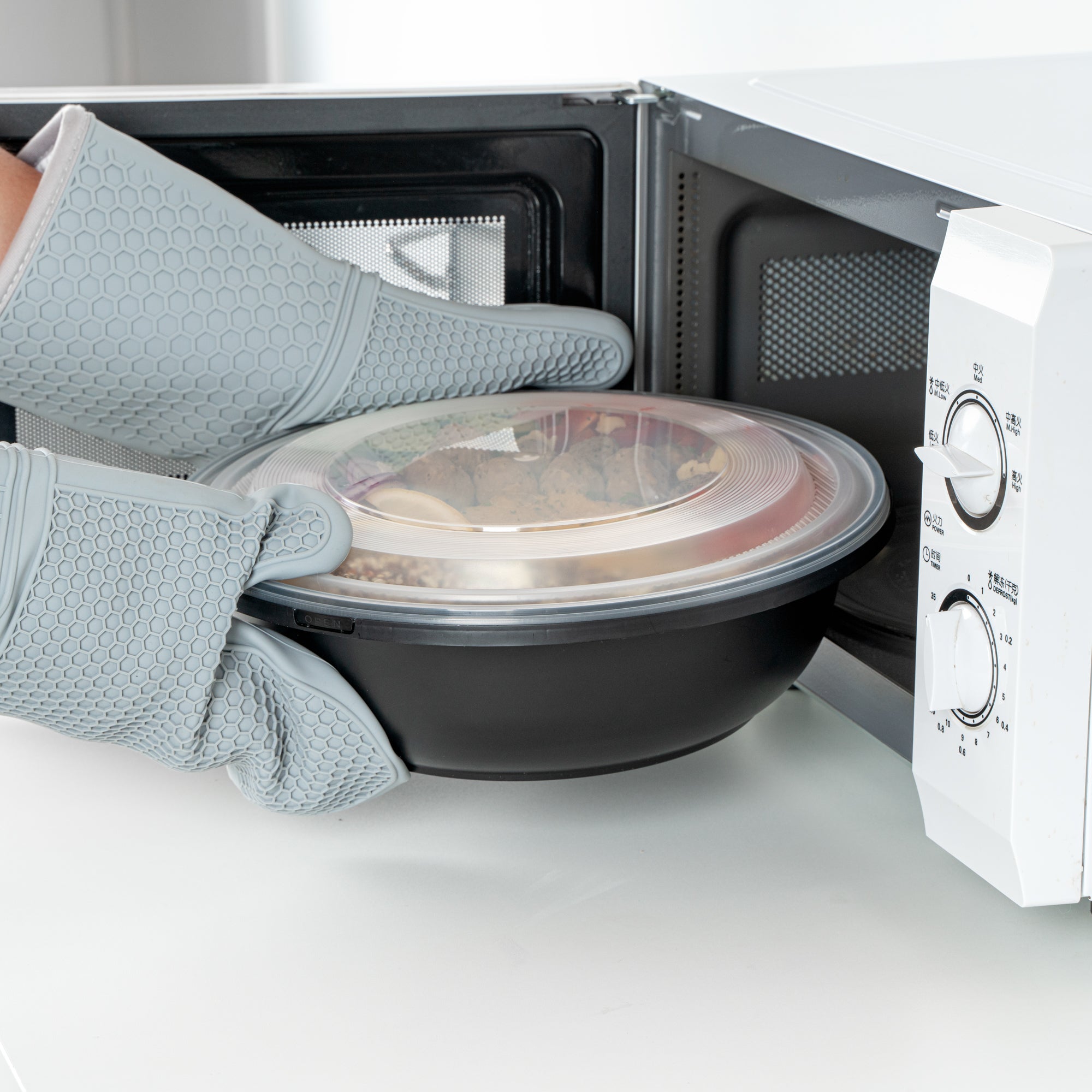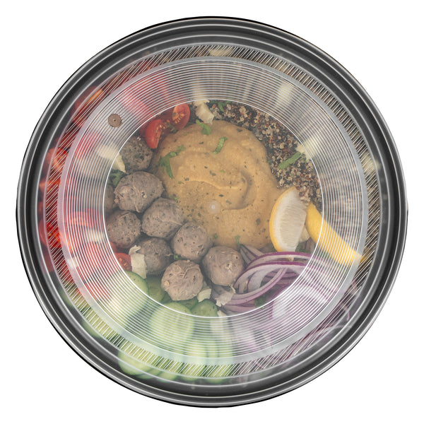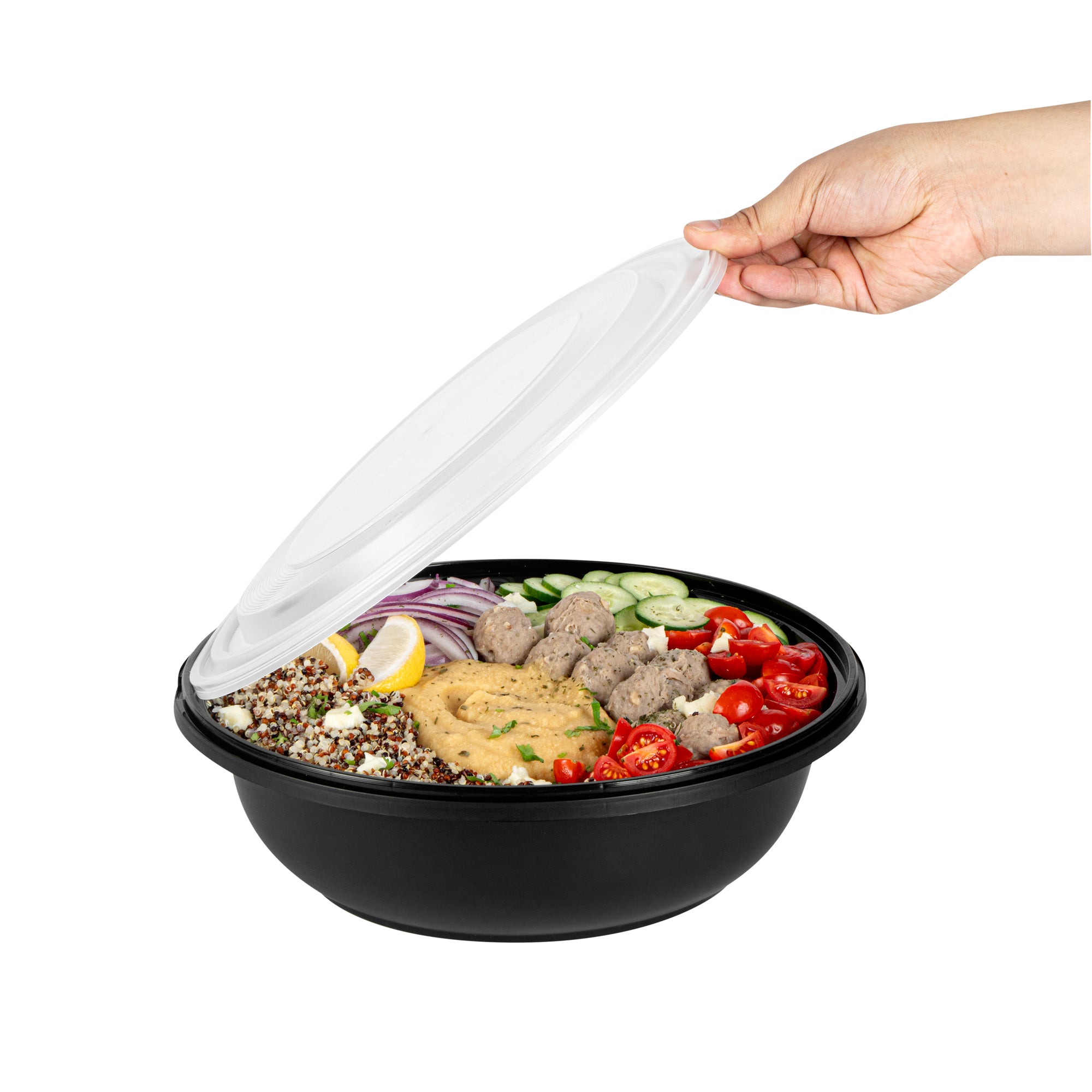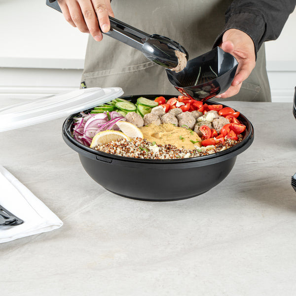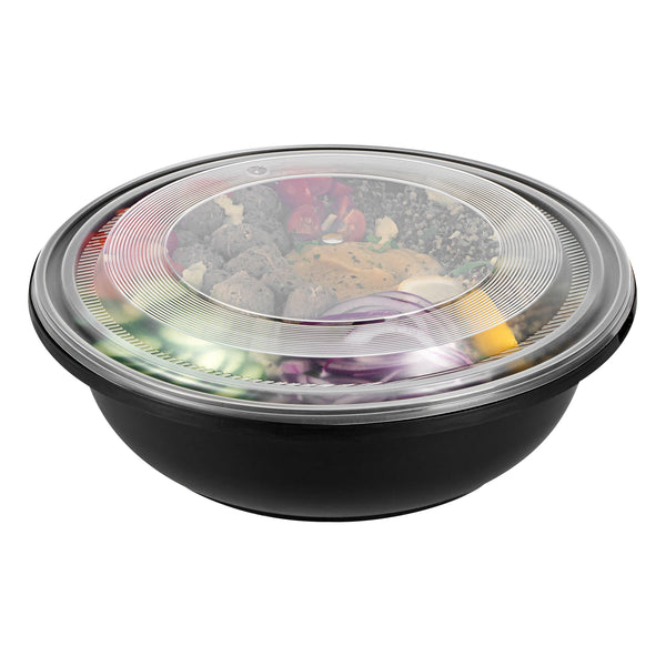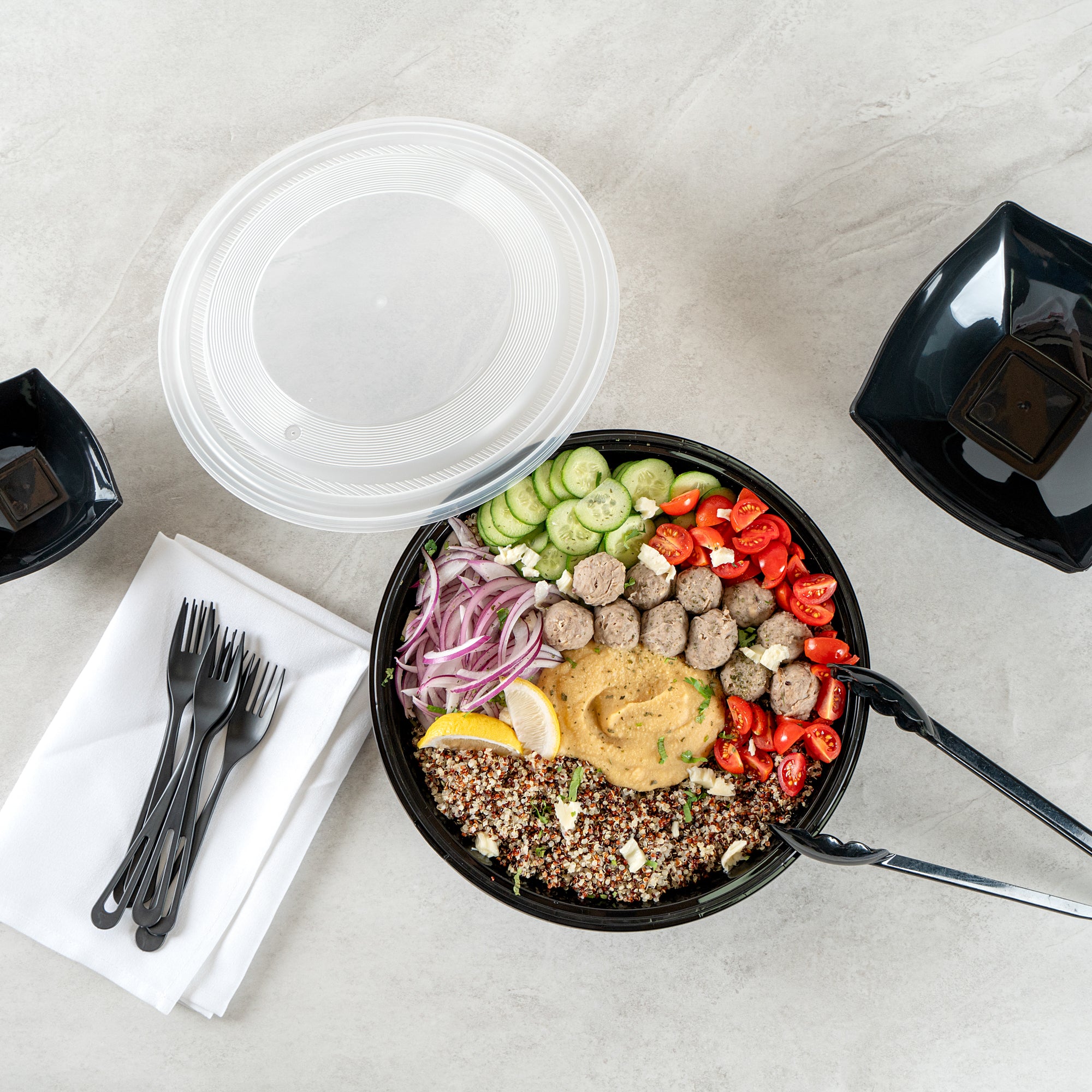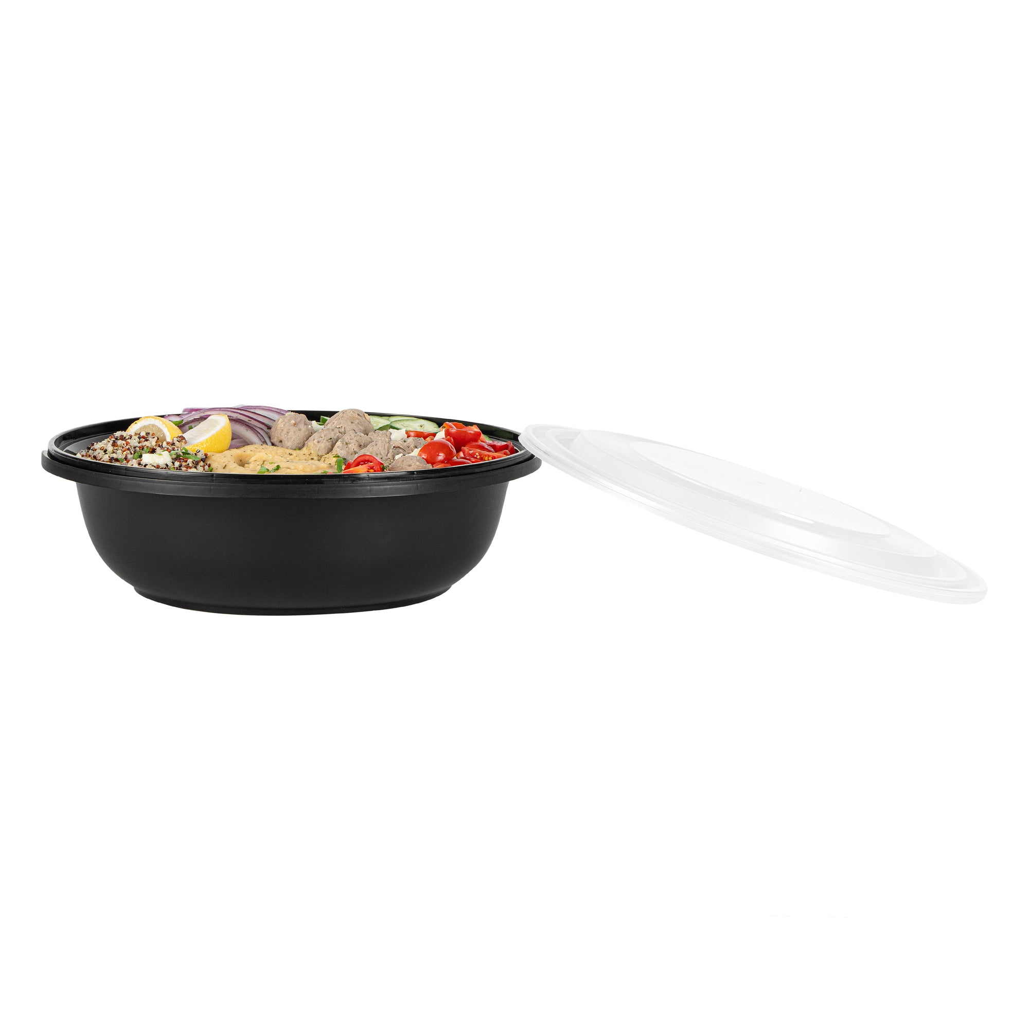 Elevate your food presentation with our Cater Tek 142-ounce Round Black Plastic Catering / Serving Bowls. These serving bowls come with clear lids that form a snug fit and help maintain freshness while enhancing the convenience of storage and transport. Designed to be microwave-safe, these plastic bowls can withstand temperatures up to 248F, making them perfect for reheating and serving dishes. Additionally, these plastic serving bowls are freezer-safe, ideal for storing your leftovers. Crafted from premium plastic, these disposable bowls are suitable for holding both hot and cold food items. These large serving bowls are disposable, allowing for straightforward cleanup after events. Dimensions of these plastic bowls with lids are 11.85 inches in diameter by 4.02 inches in height and can hold up to 142 ounces, providing ample capacity for your culinary creations. Sold in a 25 count box.