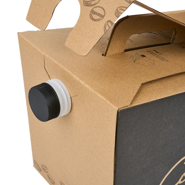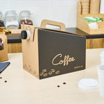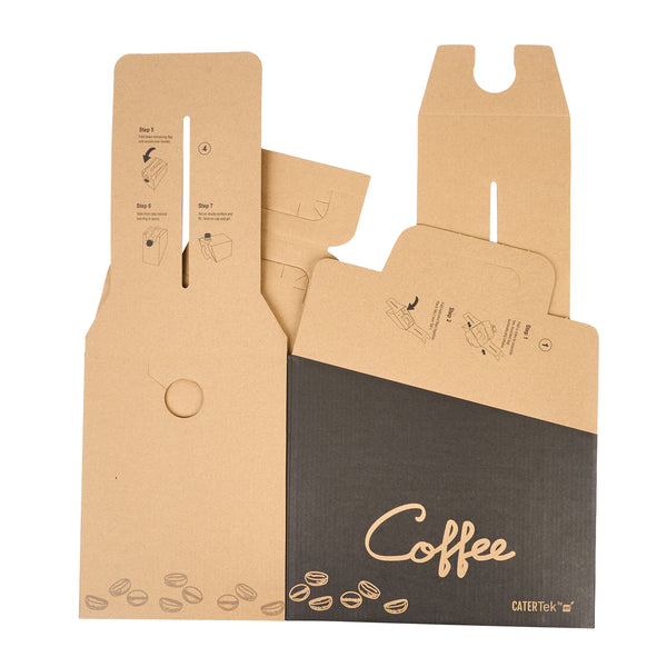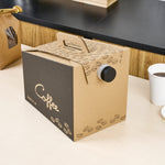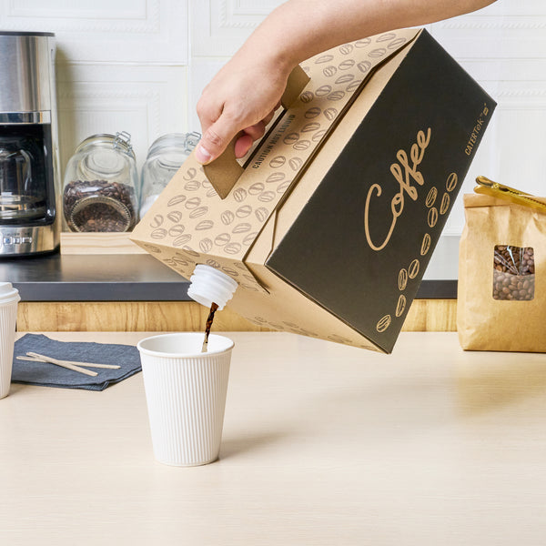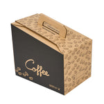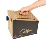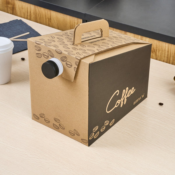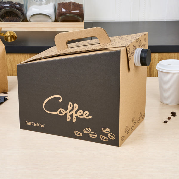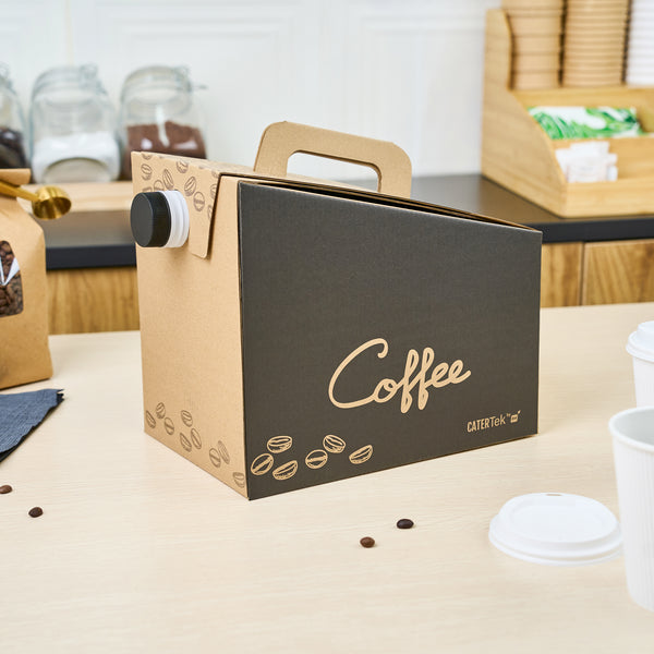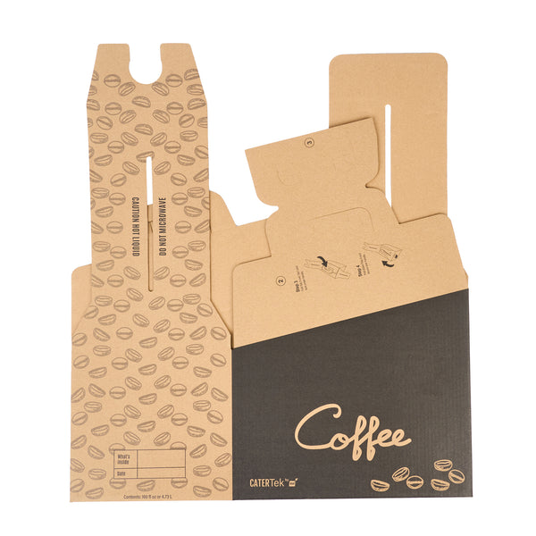Make freshly brewed coffee instantly portable for guests using our Cater Tek 160-Ounce Black Paper Coffee Take Out Boxes. These tea dispensers are designed with an interior insulated bag that keeps beverages at the perfect temperature while on the go. Featuring a built-in handle, these beverage dispensers make it easy to comfortably transport containers. To prevent messy spills while on the go, these tea dispensers have a leak-resistant screw cap. These hot drink containers have a kraft finish with a coffee bean print and a black accent wall that reads "Coffee" to instantly add style to drink presentations. Ideal for serving up to 20 cups of coffee, tea, or other beverages, these hot drink containers hold up to 160 ounces. These tea dispensers measure 10.75 inches in length by 7.5 inches in width and 7.75 inches in height. These hot drink containers arrive flat for easy storage. Shipped in a 10 count box.
