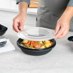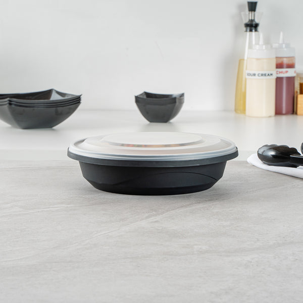 Elevate your food presentation with our Cater Tek 58-ounce Round Black Plastic Catering / Serving Bowls. These serving bowls come with clear lids that form a snug fit, ensuring freshness while enhancing storage and transport convenience. Each plastic bowl is microwave-safe and can withstand temperatures up to 248F, perfect for reheating dishes. Freezer-safe, these serving dishes can easily store your leftovers. Crafted from premium plastic, these large serving bowls are suitable for both hot and cold food items. These disposable bowls provide straightforward cleanup after events, saving your staff time and effort. Measuring 7.95 inches in diameter by 3.74 inches in height, these plastic bowls with lids have a 58-ounce capacity, offering ample space for generous servings. Sold in a 100 count box.