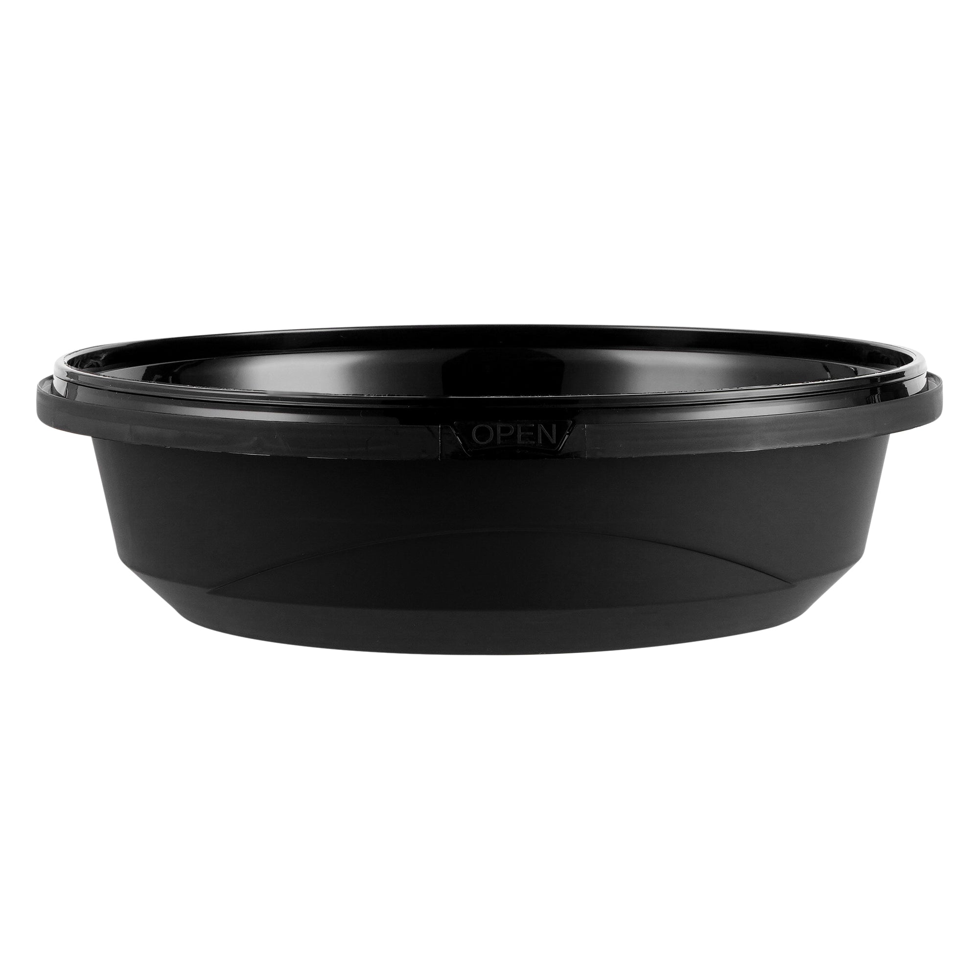 Enhance your catering and serving experience with our Cater Tek 68-ounce Round Black Plastic Catering / Serving Bowls. These disposable bowls come with clear lids that form a snug fit and help maintain freshness while enhancing the convenience of storage and transport. Made from premium plastic, these serving dishes are microwave-safe and can withstand temperatures up to 248F, making them ideal for reheating. These large serving bowls are freezer-safe, allowing you to store your leftovers with ease. Crafted to hold both hot and cold food items, these plastic bowls ensure versatility in any foodservice setting. These serving bowls are disposable and can be discarded after use for straightforward cleanup, saving you time and effort. With a generous capacity of 68 ounces and dimensions of 9.65 inches in diameter by 3.07 inches in height, these plastic bowls with lids are perfect for large servings. Sold in a 100 count box.