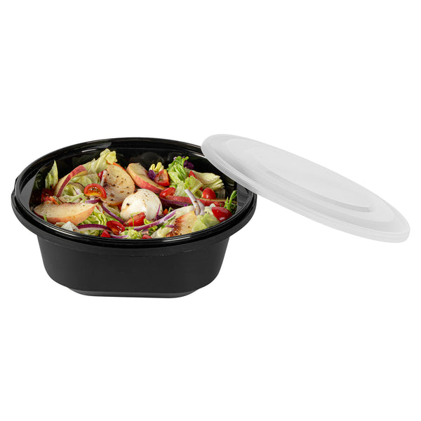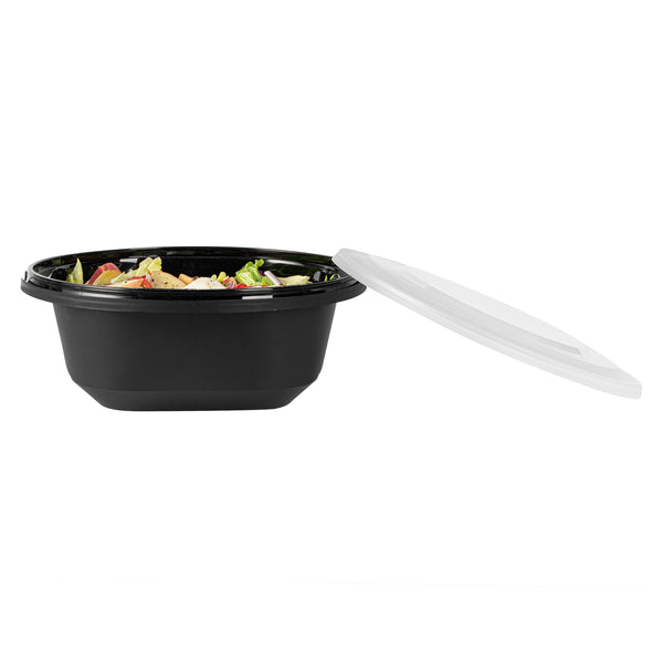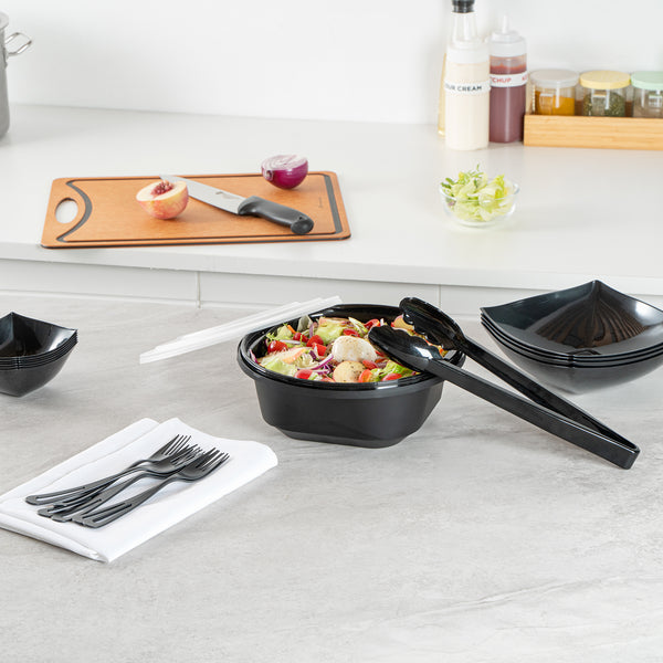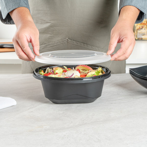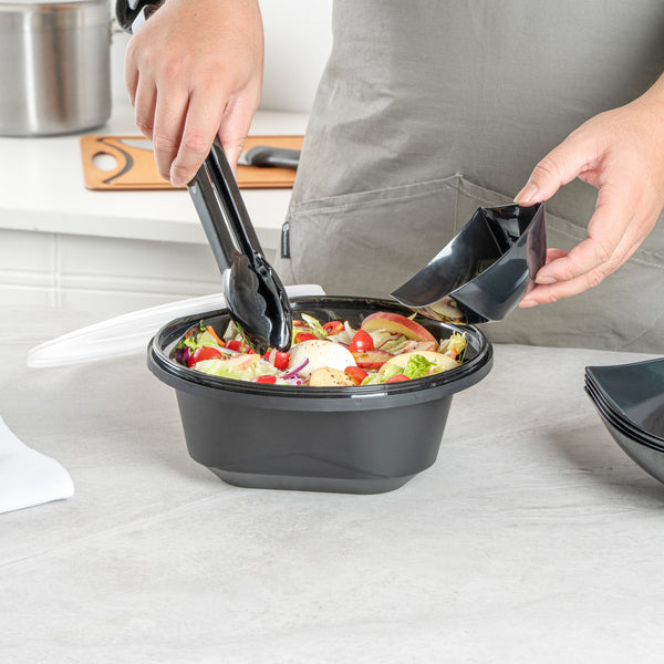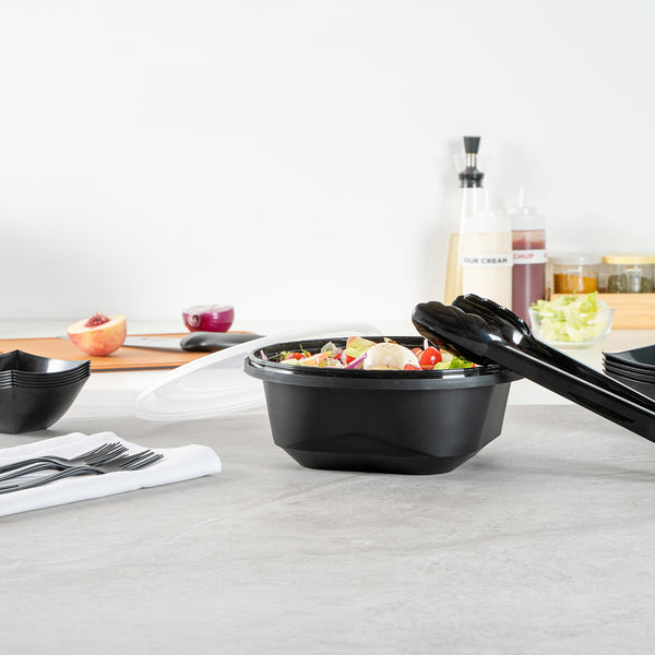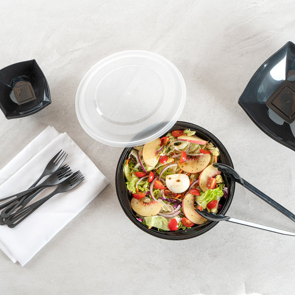 Elevate your food presentation with our Cater Tek 85-ounce Round Black Catering / Serving Bowls. These serving bowls come with clear lids that form a snug fit and help maintain freshness while enhancing the convenience of storage and transport. Designed to be microwave-safe, these black plastic bowls can withstand temperatures up to 248F, ensuring your meals stay warm. For added versatility, these serving dishes are also freezer-safe and can be used to store your leftovers. Crafted from premium plastic, these disposable bowls are ideal for holding both hot and cold food items. With their disposable design, these plastic bowls make cleanup straightforward and hassle-free. Measuring 9.65 inches in diameter by 3.86 inches in height, these plastic bowls with lids have a total capacity of 85 ounces, perfect for catering large events. Sold in 100 count box.