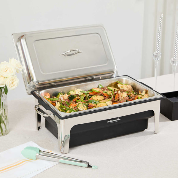 Streamline food service and temperature control with our Cater Tek 9-quart Full Size Electric Chafer. Equipped with a reliable 760-watt heating element and powered by 120 volts, this electric chafer delivers consistent heat to maintain proper serving temperatures throughout service. The included stainless steel chafer cover helps retain warmth and protects dishes from external elements, making it ideal for busy catering settings. With a full-size 9-quart food pan, this chafer accommodates a variety of hot entrees and sides, perfect for weddings, buffets, and other large-scale events. A sturdy stand provides stability and professional presentation on any serving line. Measuring 20.47 inches in length, 17.72 inches in width, and 11.01 inches in height, this electric chafer offers a balanced blend of functionality, safety, and elegant design. Sold in a 1 count box.
