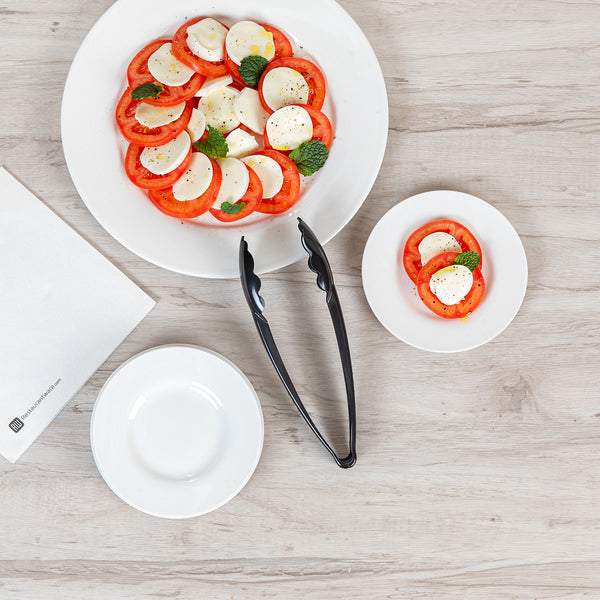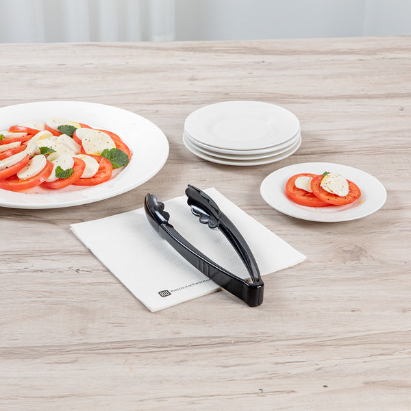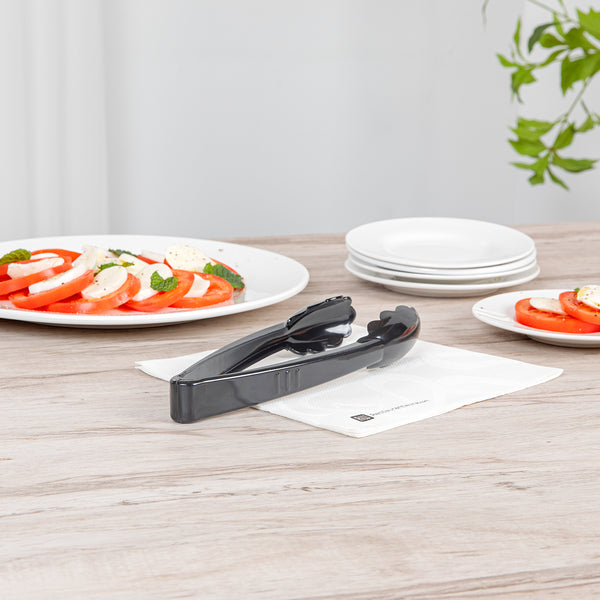 Easily handle and serve food with our Cater Tek Black Heavy-Duty Disposable Plastic Tongs. Made from durable heavy-duty plastic, these serving tongs are built to last, resisting breakage for reliable use. The scalloped edges of these tongs for salad offer a secure grip on various foods, ensuring smooth and mess-free serving. Designed from food-grade plastic, these disposable tongs provide a safe and hygienic option for all food-handling needs. With a temperature range of -40°F to 176°F, these tongs are versatile for serving salads, appetizers, desserts, and more. Featuring long and sturdy handles, these serving tongs offer an extended reach and a firm grip, allowing for easy and controlled serving while keeping hands away from food. Designed for single-use convenience, these recyclable plastic tongs make post-event cleanup effortless. Ideal for catering services, buffets, and weddings, these plastic serving tongs help maintain cleanliness at self-serve stations. Measuring 9 inches in length by 3.5 inches in width by 1.25 inches in height, these tongs offer an extended reach for convenient serving. Sold in a 10 count box.