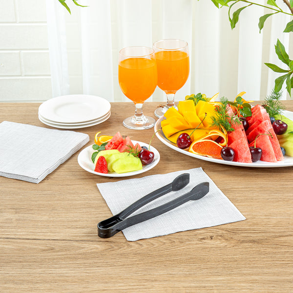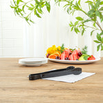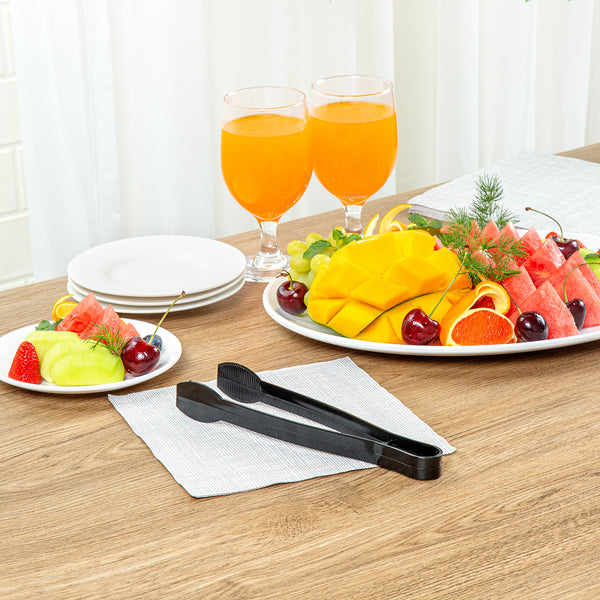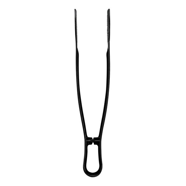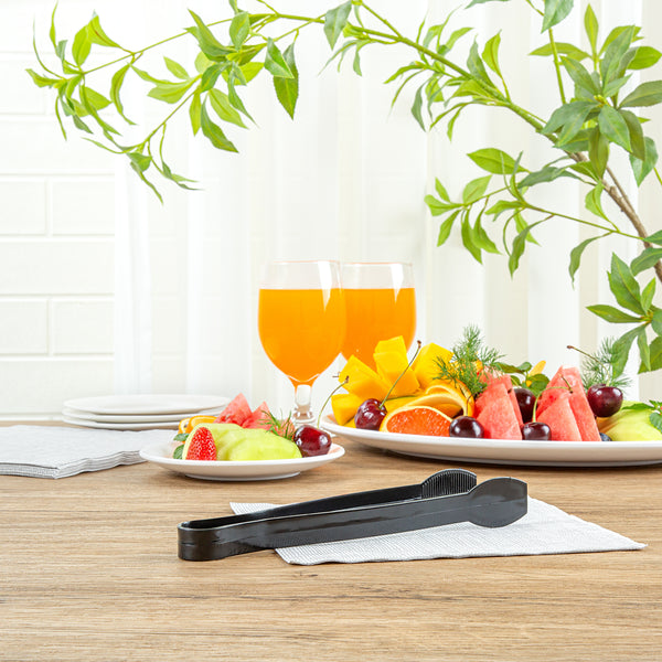 Ensure effortless foodservice with our Cater Tek Black Plastic Tongs. These serving tongs are designed with ridged tips to enhance grip and stability, making them perfect for securely handling a variety of food items. Made of durable plastic, these salad tongs are suitable for handling hot and cold food items at your catering events. Featuring a long handle, these food tongs provide a comfortable grip and extended reach for easy serving and handling of a variety of foods. These plastic tongs are disposable and can be discarded after use, for an easy post-event cleaning experience. The black finish of these food serving tongs create a stylish look at your catering event. Measuring 9 inches in length by 1.25 inches in width by 1 inch in height, these appetizer tongs are conveniently sized for versatile use. Sold in a 10 count box.