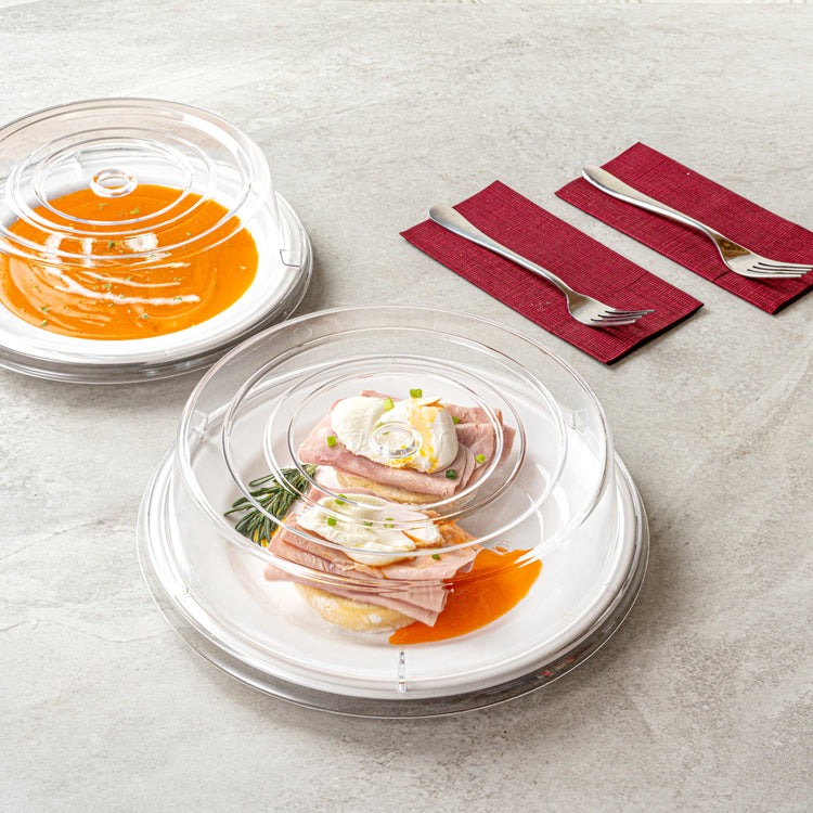 Our polycarbonate plate covers come in various sizes and shapes to meet your different tray covering needs. Ideal for large or small meals!