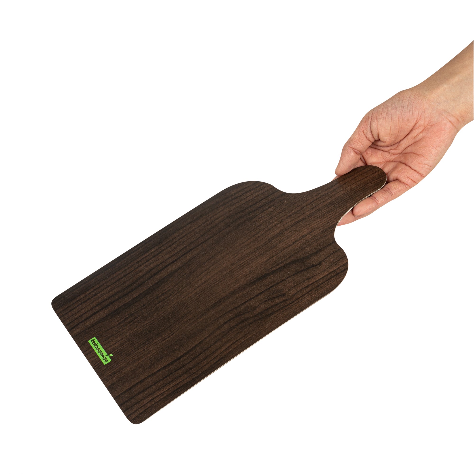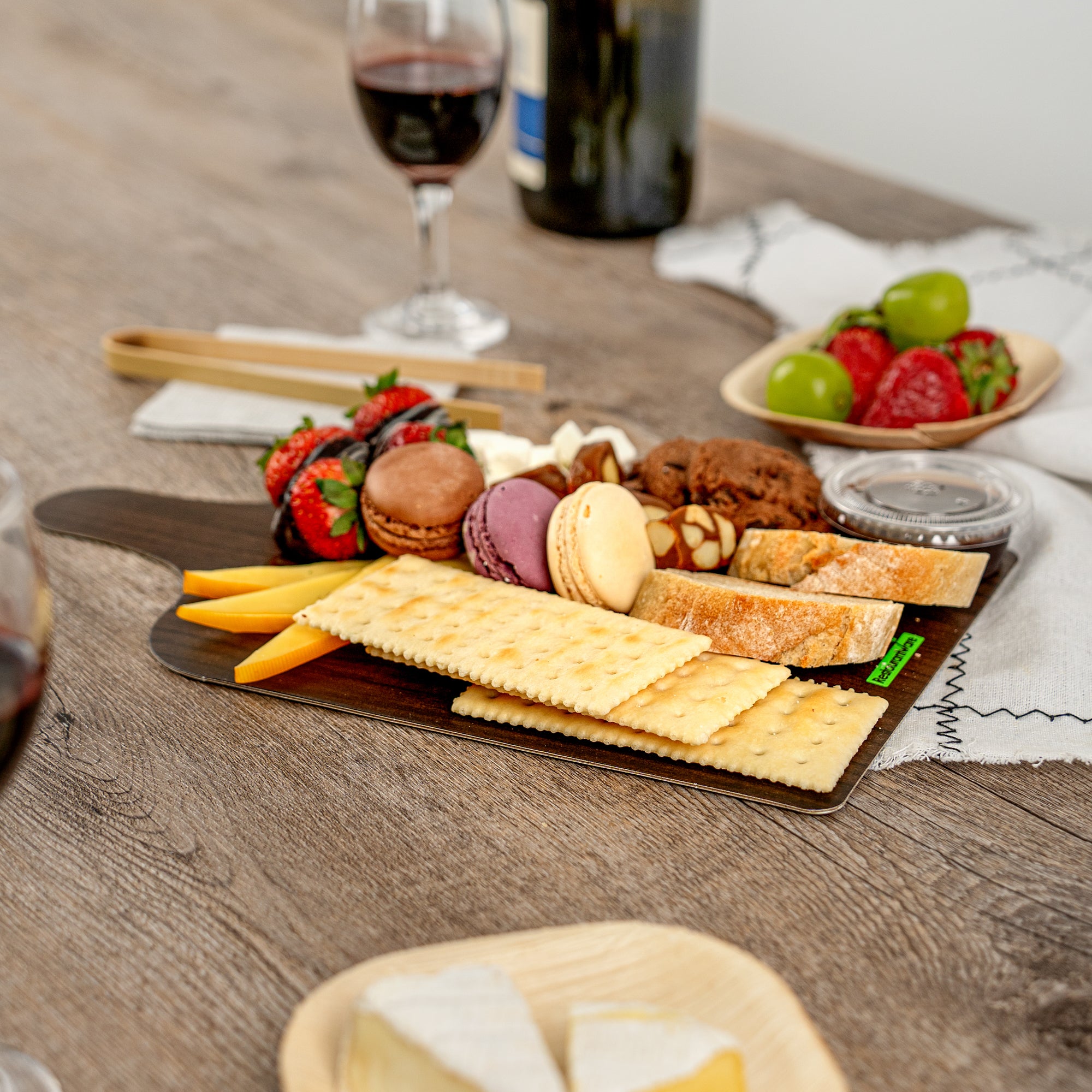 Elevate your presentation with our Cater Tek Dark Cheese / Charcuterie Boards. Crafted from durable paper material, these food trays are robust and designed to withstand both hot and cold food serving, making them the perfect addition to your bakery, restaurant, or bistro. The faux wood finish of these catering trays adds an elegant touch and allows the vibrant colors of your cheeses, charcuteries, and other delicacies to pop. Plus, the unique side handle design of these paper food trays enhances portability, making them an excellent choice for catered events or grab-and-go service. Stackable and disposable, these cheese boards streamline the clean-up process and optimize your storage space, both crucial benefits in the fast-paced foodservice industry. These food trays measure 11.8 inches in length by 7 inches in width, providing ample space to elegantly display your culinary creations. Sold in a 10 count box.