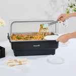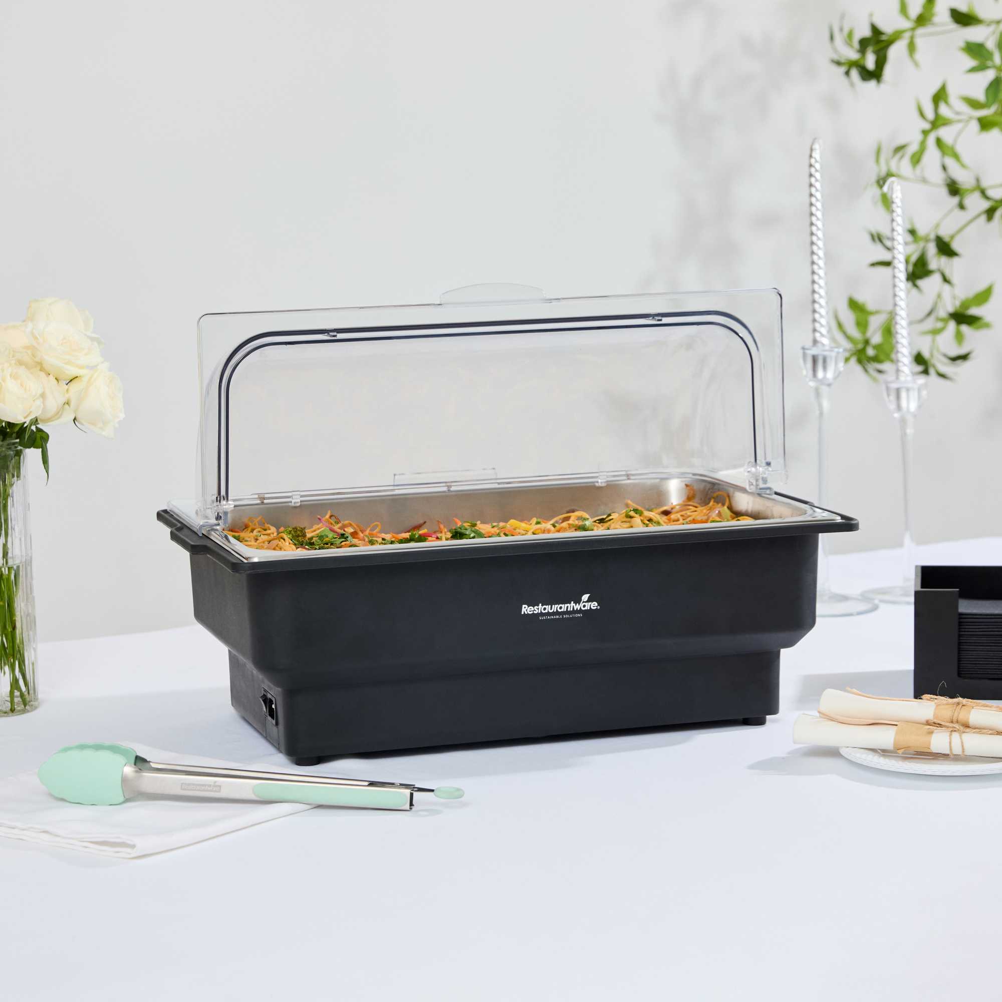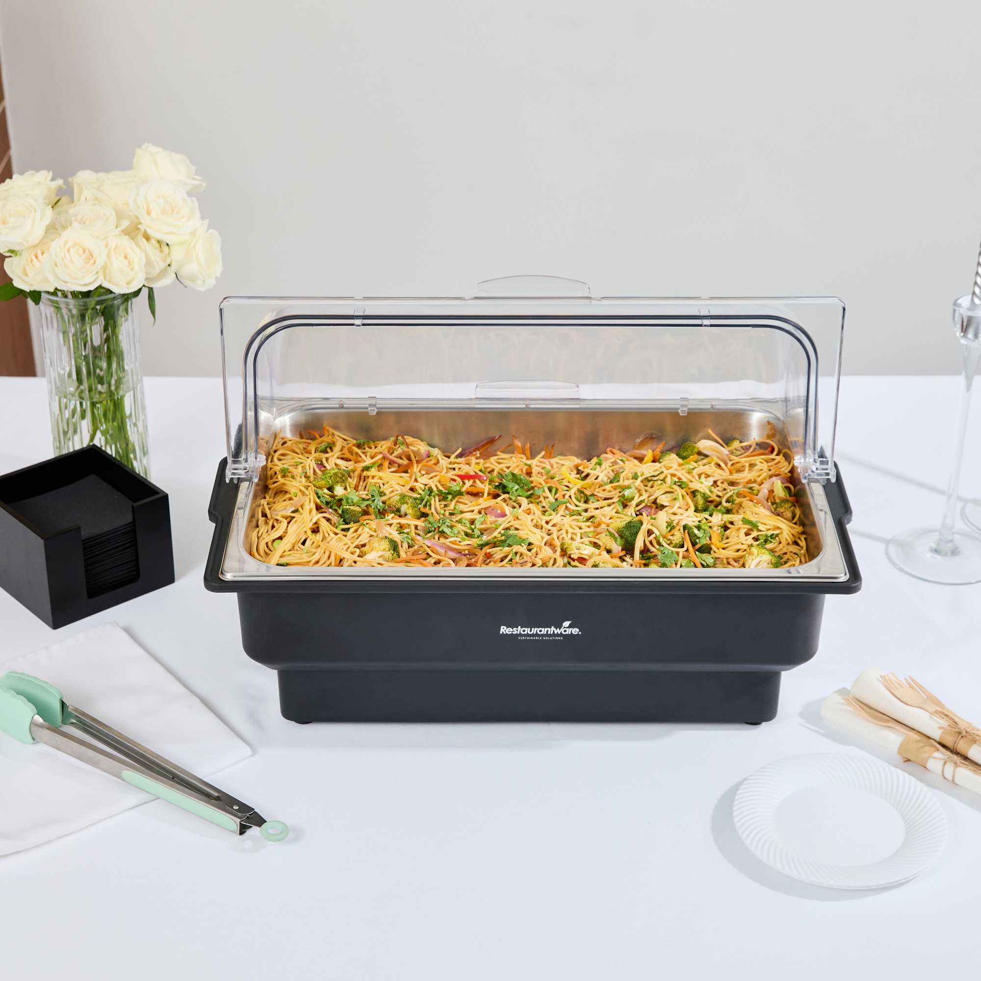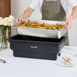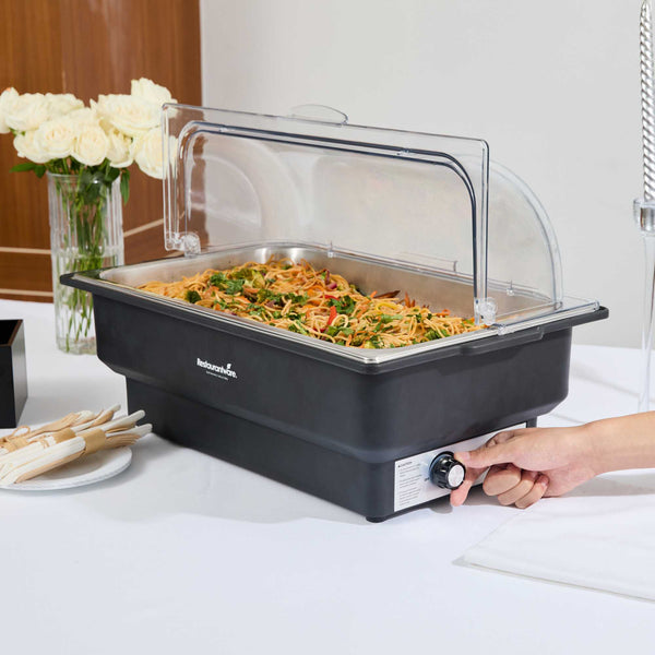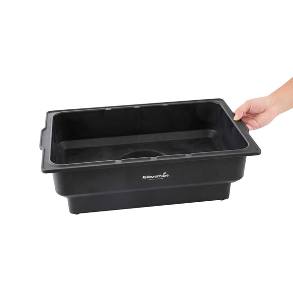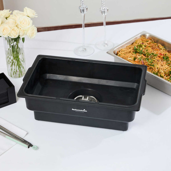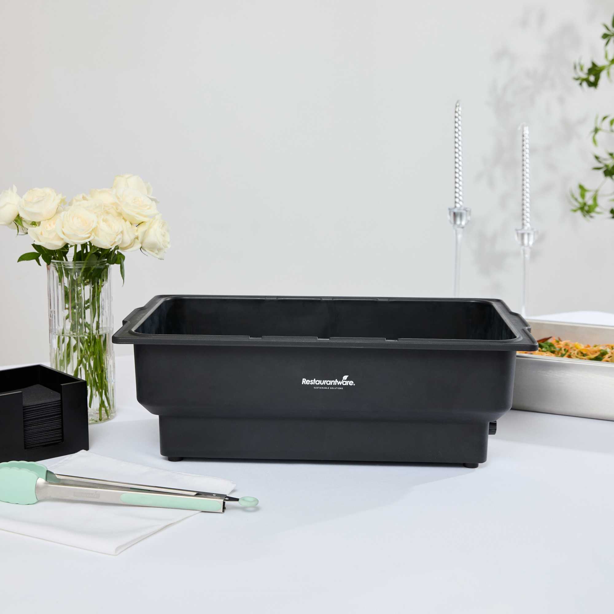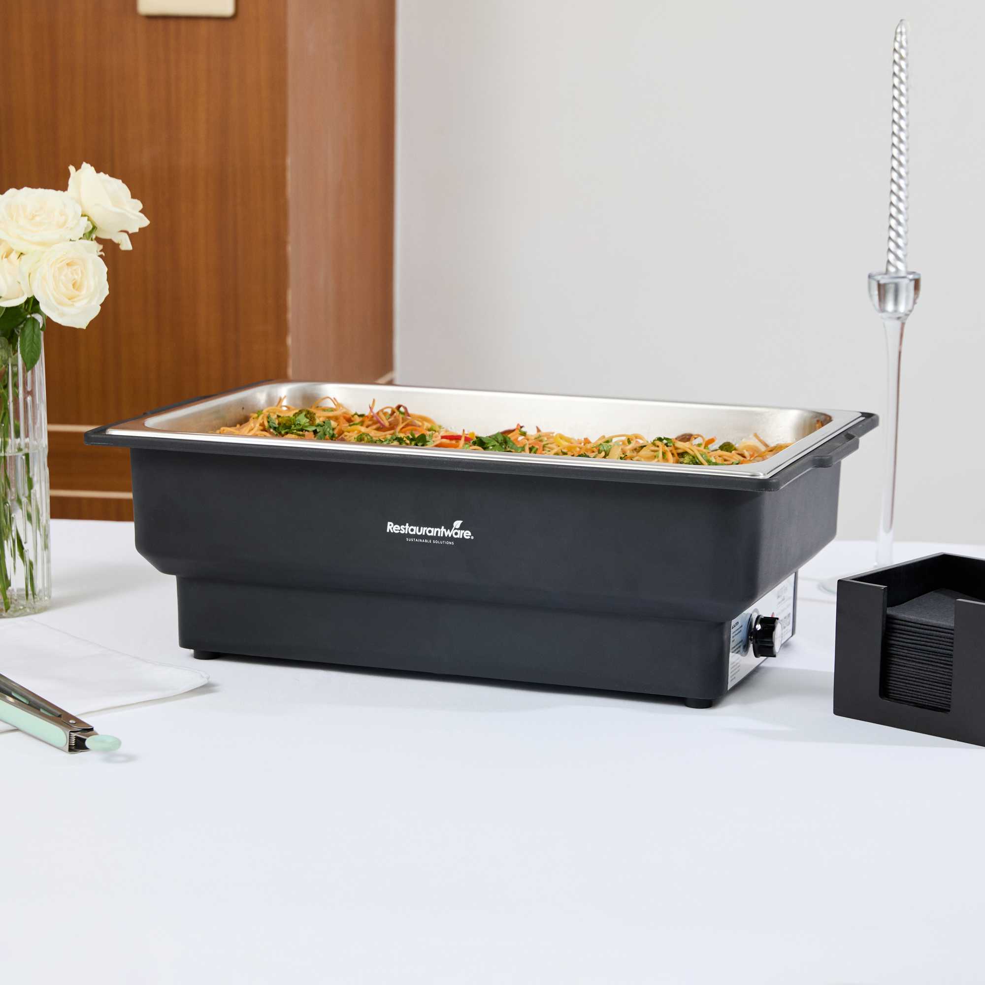 Keep dishes warm and safe with our Cater Tek Full Size Electric Water Pan / Warmer. This electric chafing dish combines a robust plastic build with a sleek black finish, ensuring your full-size chafing dish presentation looks impeccable at any venue. Featuring an auto cut-off thermostat, it provides reliable safety by regulating temperature and preventing overheating, perfect for bustling events. With adjustable temperature controls, this electric chafing dish prevents food from drying out, maintaining the quality and taste your guests expect. Designed to work efficiently under windy outdoor conditions, its 760W power consumption ensures consistent heating. This electric steam table pan can stand alone or fit with a standard full-size chafer frame for versatile arrangements. This pan measures 22.44 inches in length by 13.78 inches in width by 7.48 inches in height. Sold in a 1 count box.